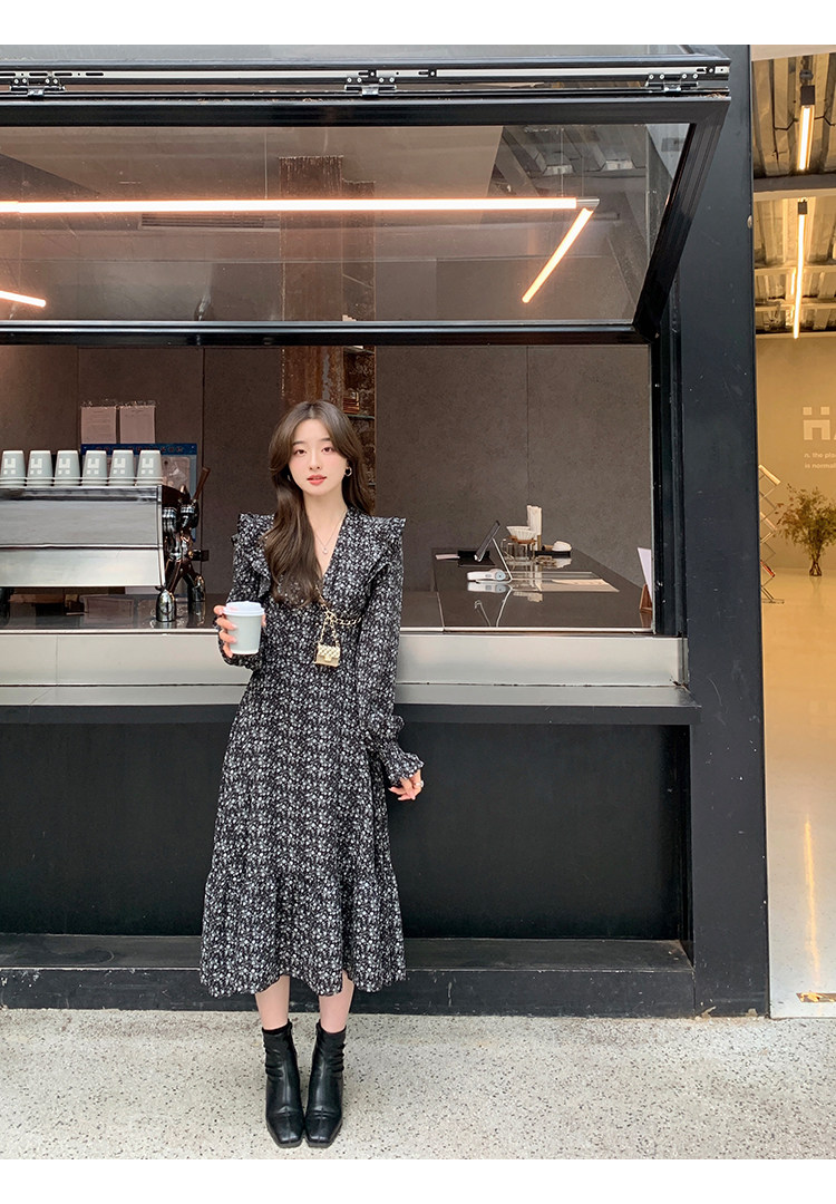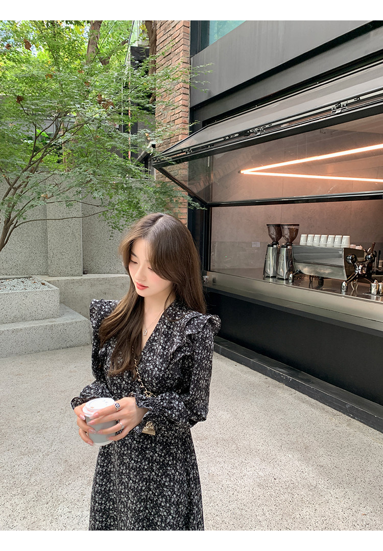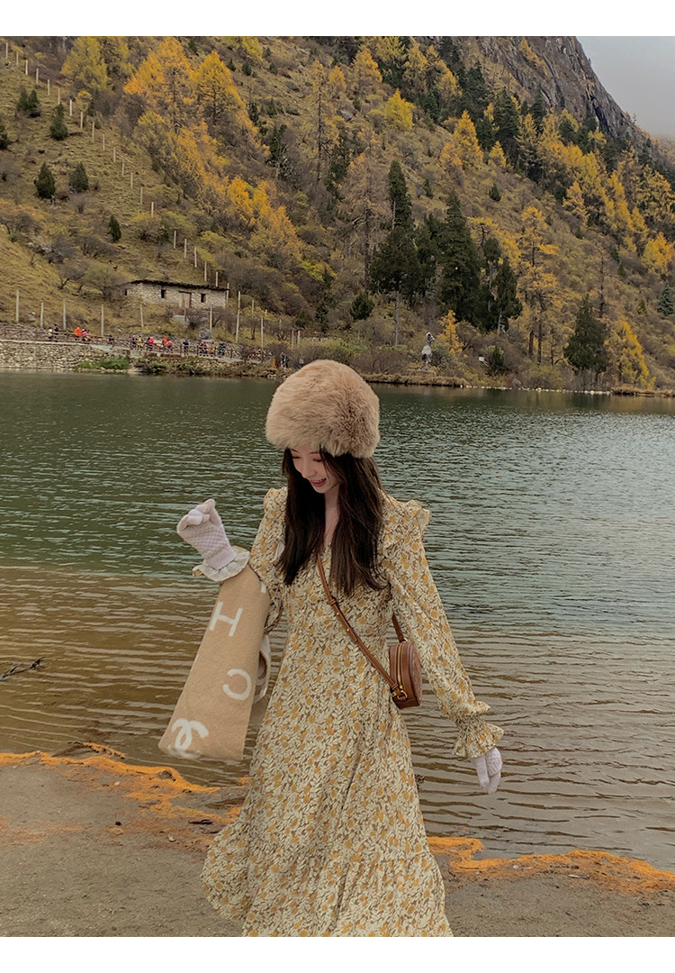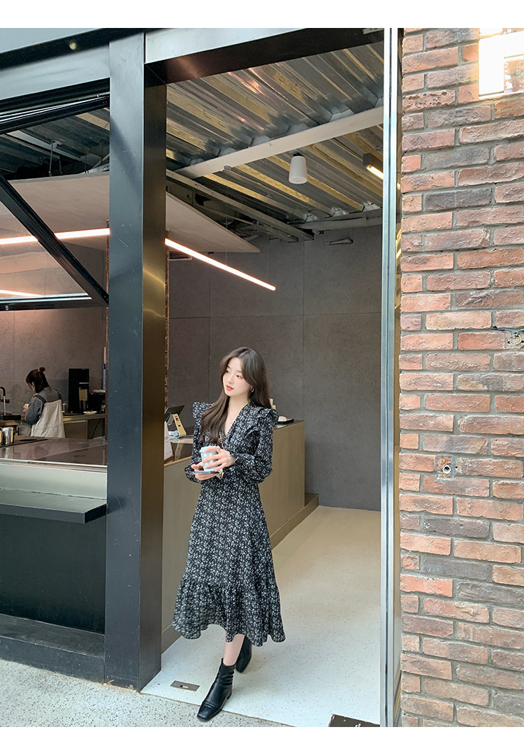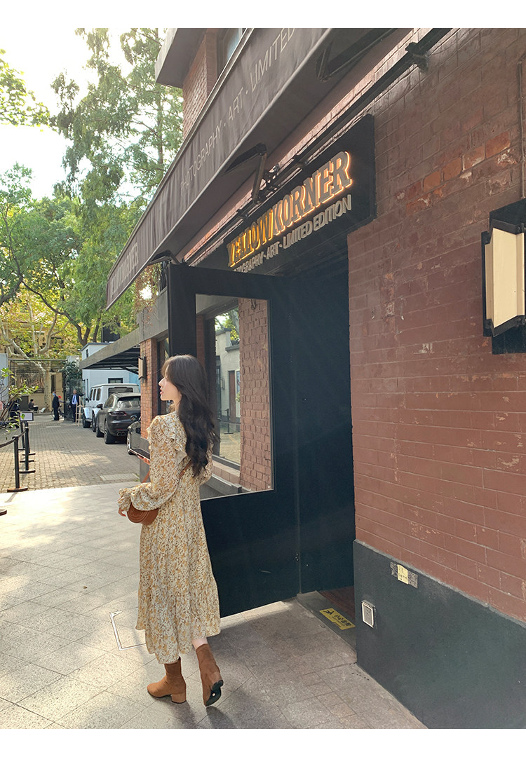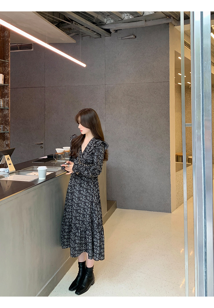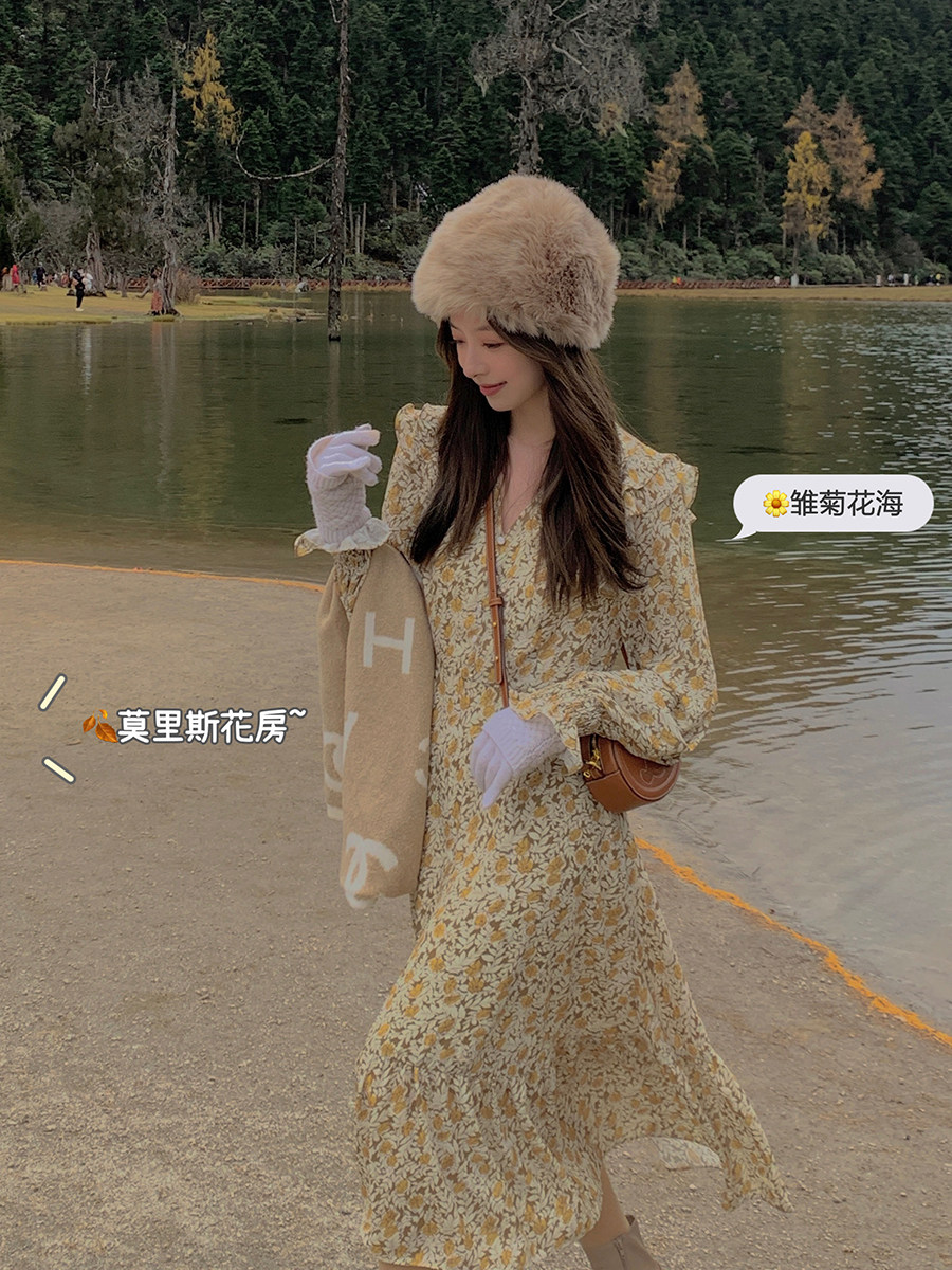 Шифоновый фонарь, осеннее платье, французский стиль, V-образный вырез, в цветочек