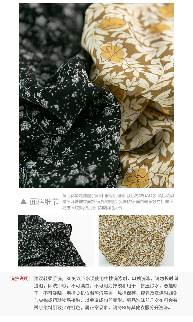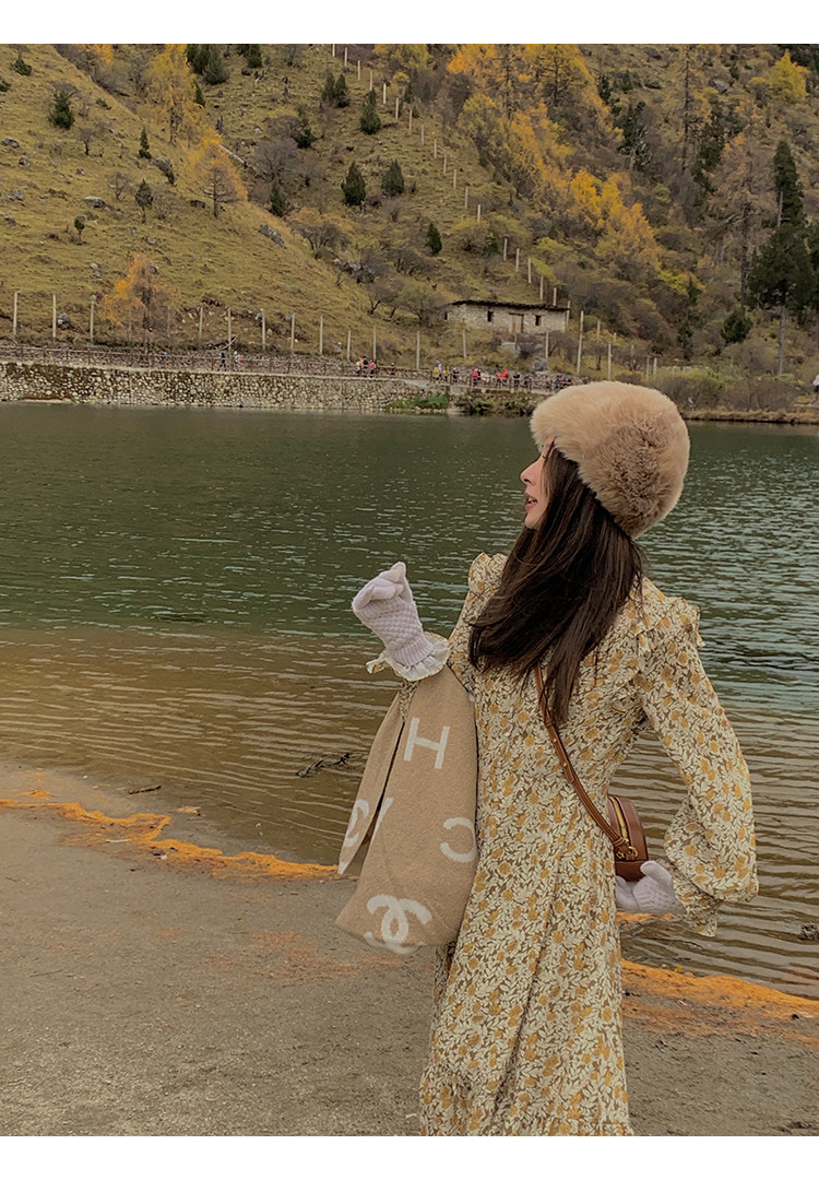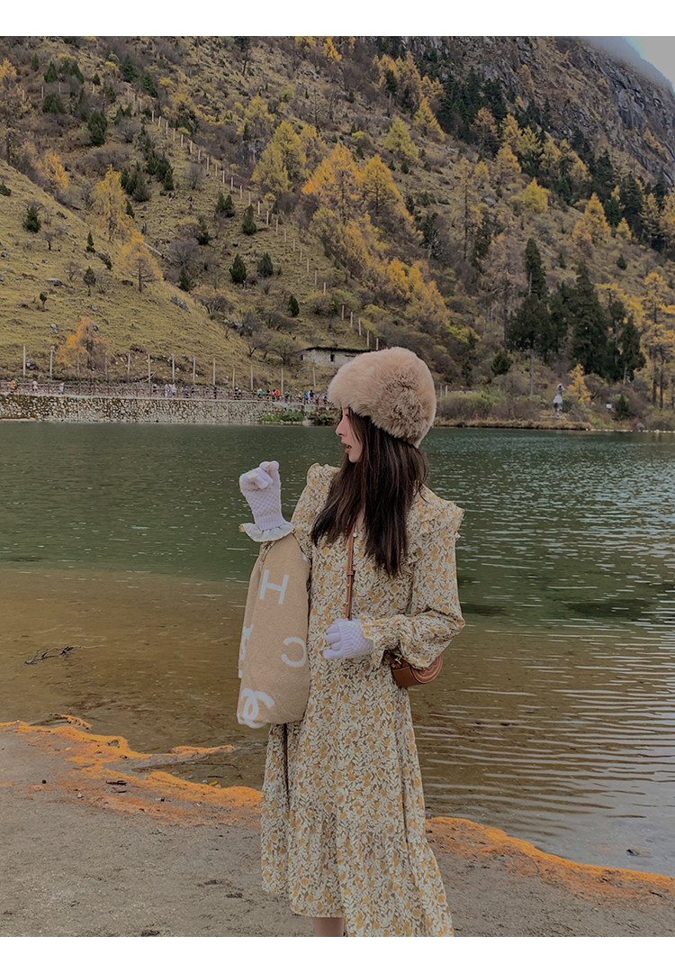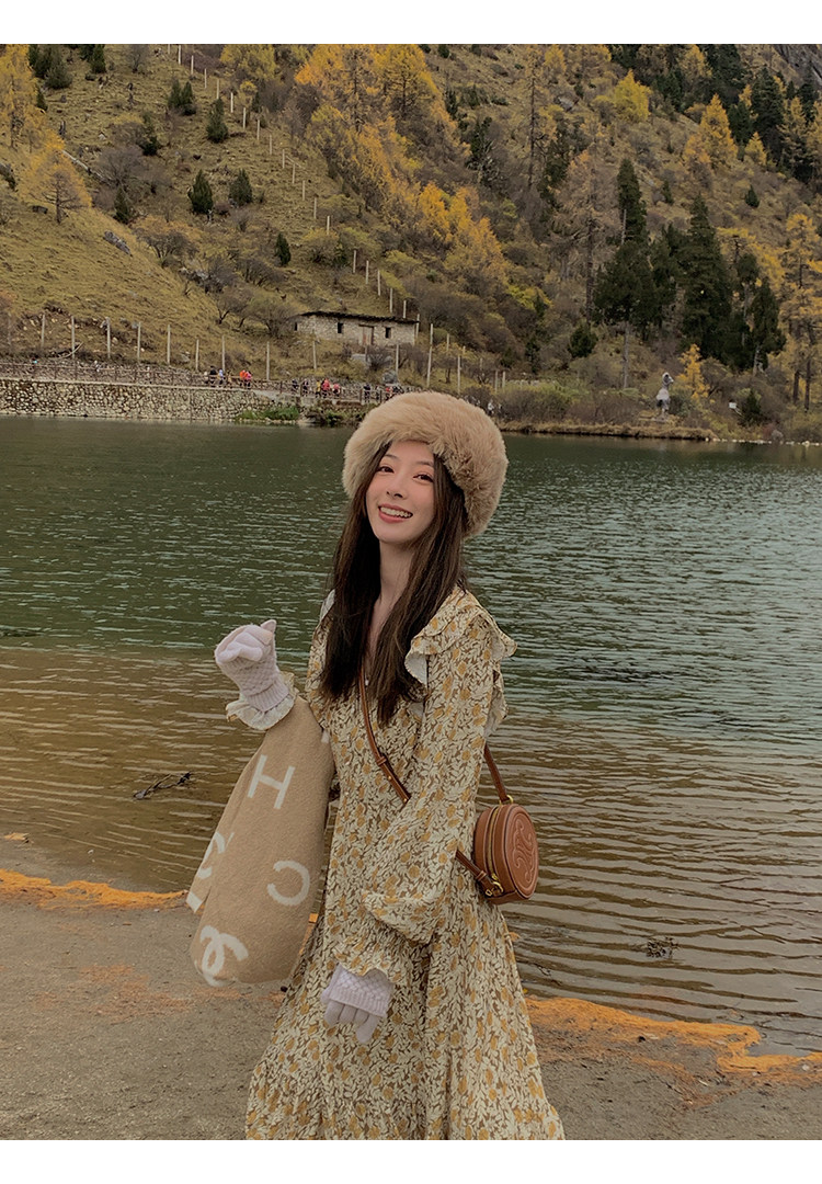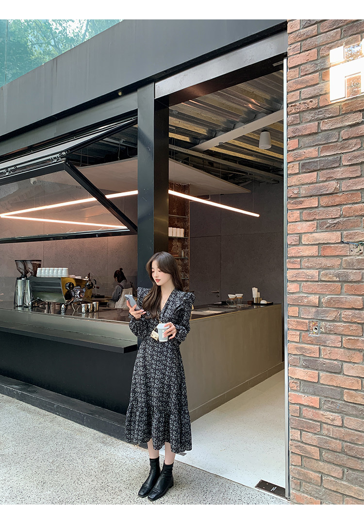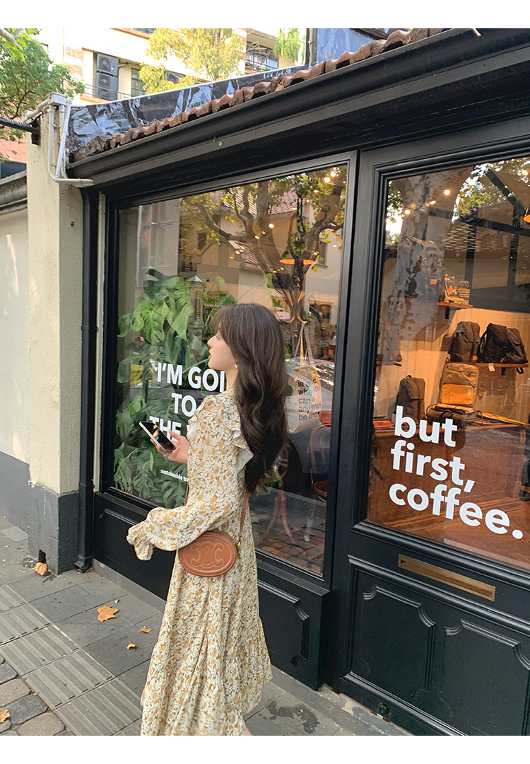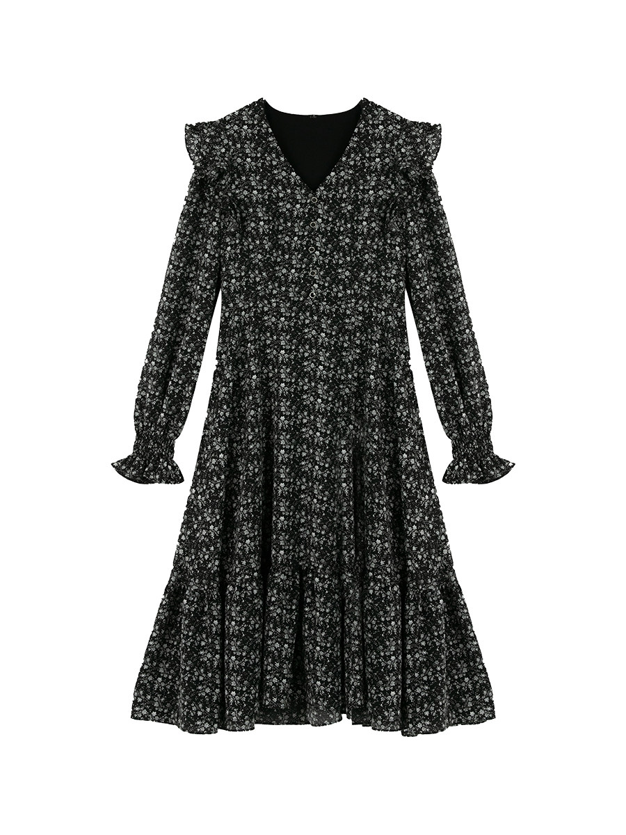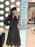 Шифоновый фонарь, осеннее платье, французский стиль, V-образный вырез, в цветочек