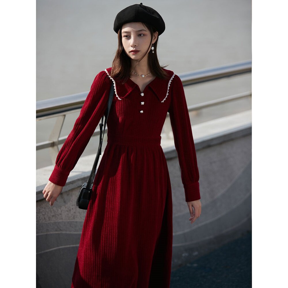 Бордовое демисезонное длинное платье, приталенный корсет, юбка, французский стиль