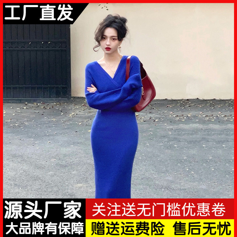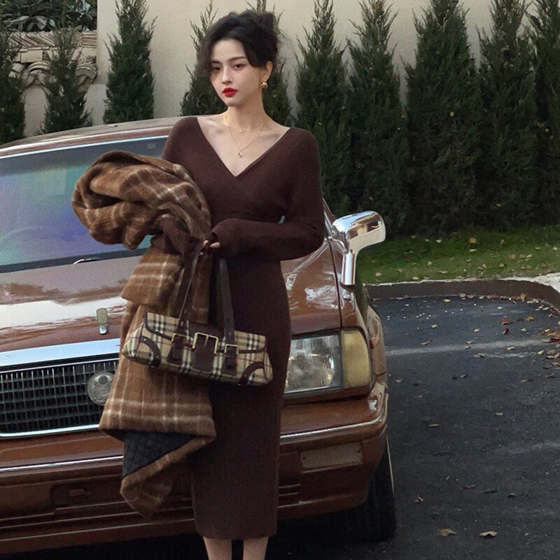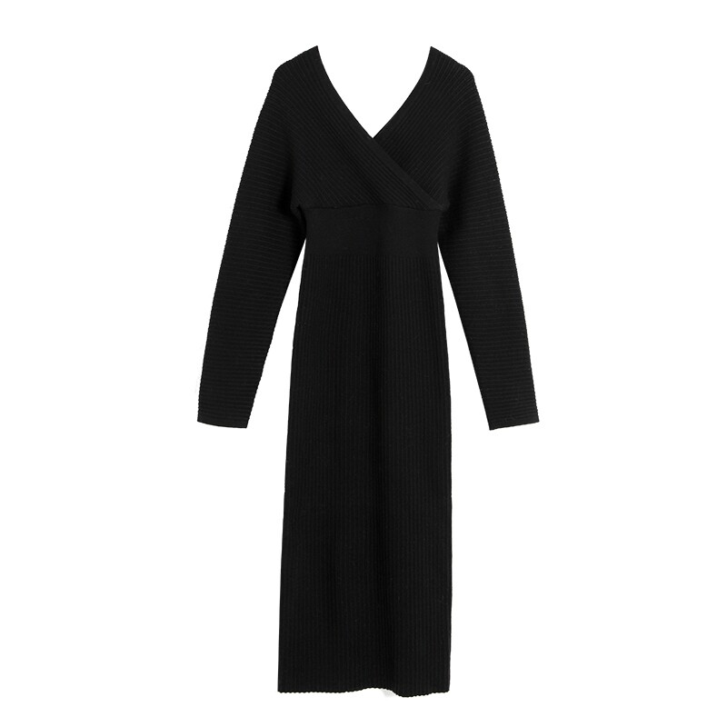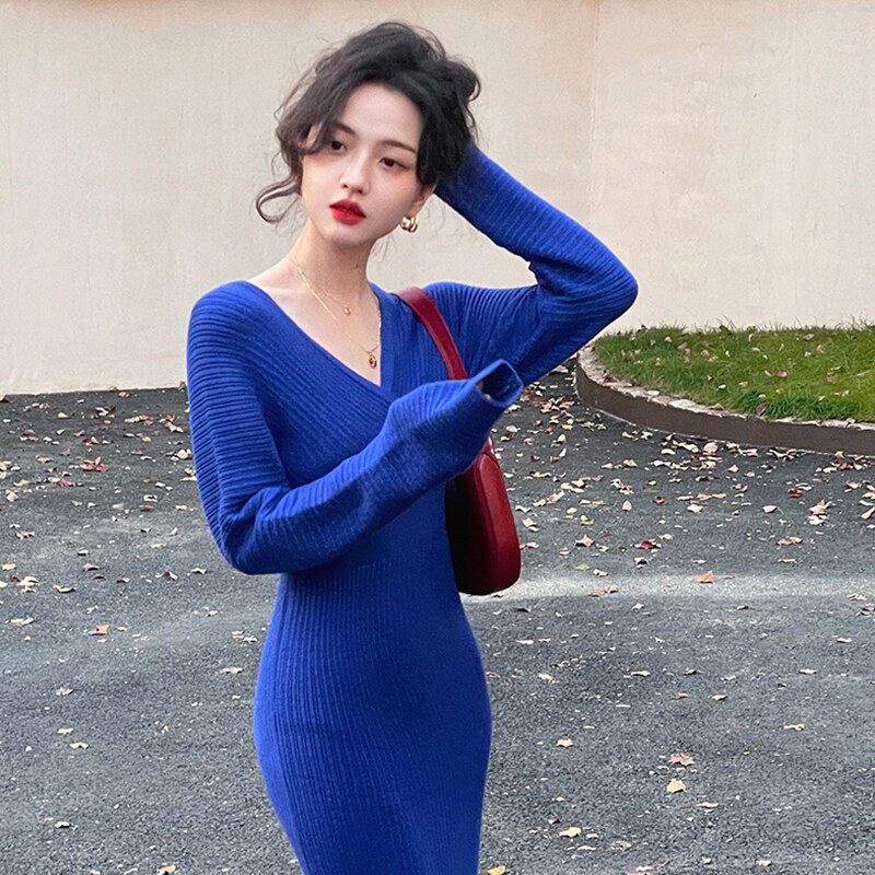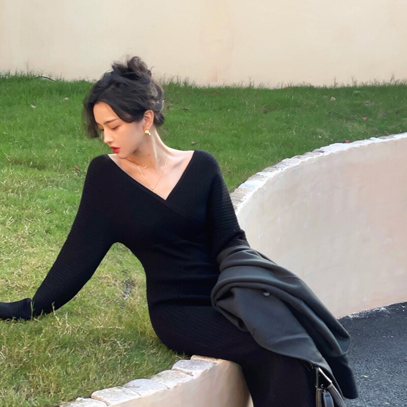 Ретро базовое длинное демисезонное трикотажное платье, французский ретро стиль, V-образный вырез, с акцентом на бедрах, средней длины, по фигуре
