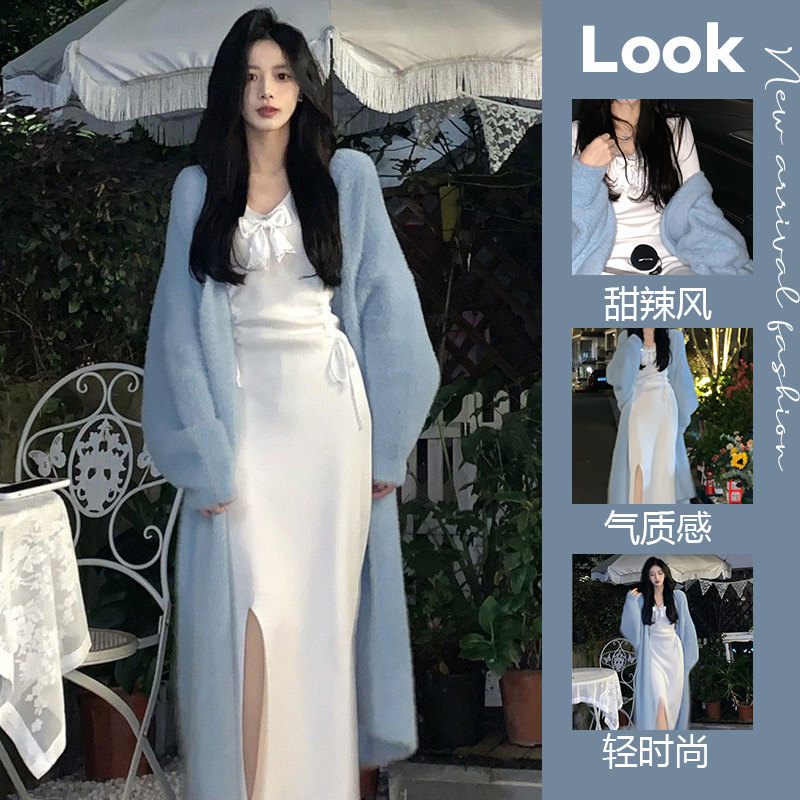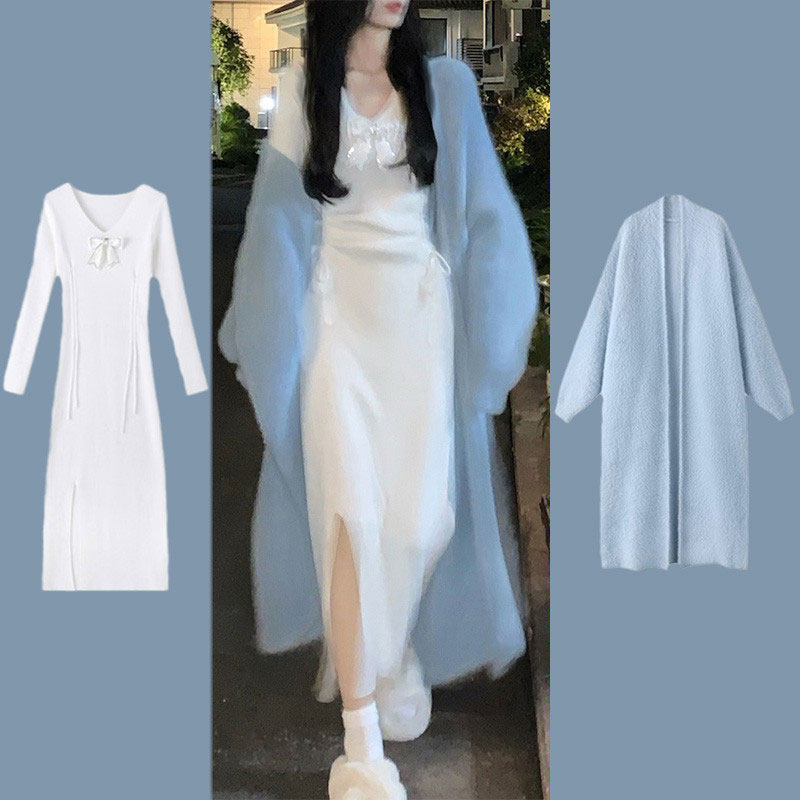Белое трикотажное осеннее трикотажное платье, свитер, длинная юбка, комплект, 2024 года, премиум класс