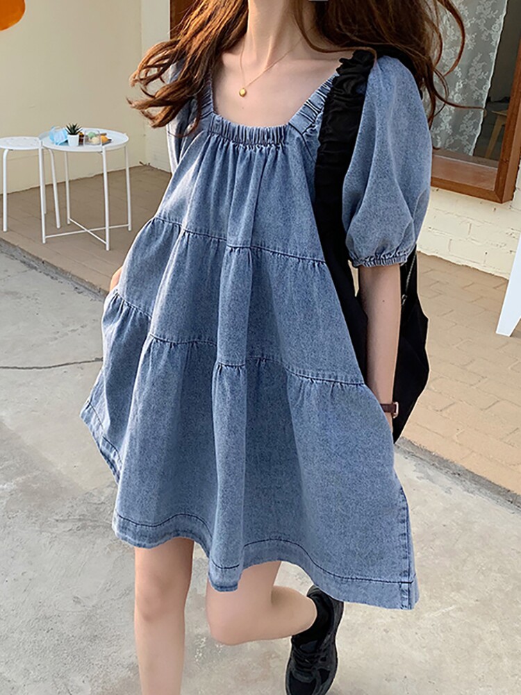 Весенняя джинсовая юбка, кукла, платье, квадратный вырез, рукава фонарики, новая коллекция, французский стиль, короткий рукав