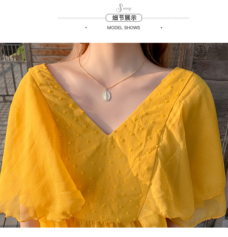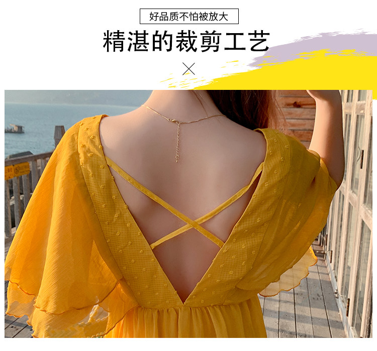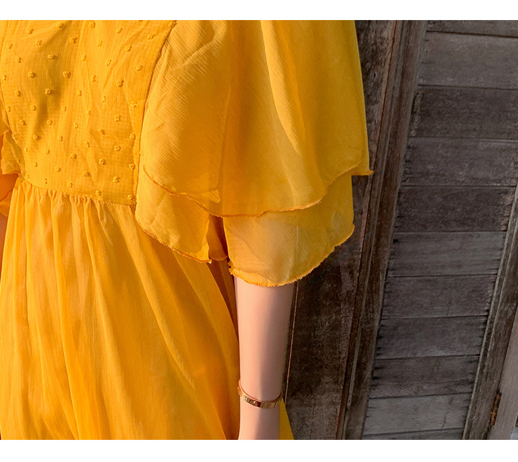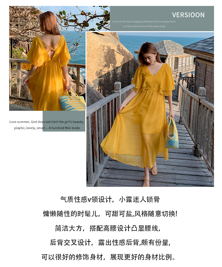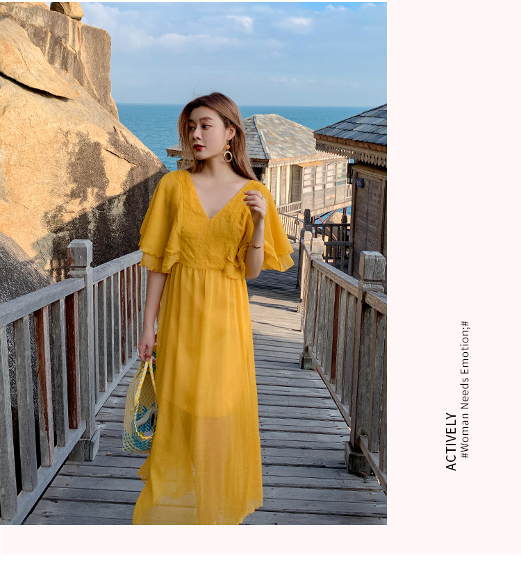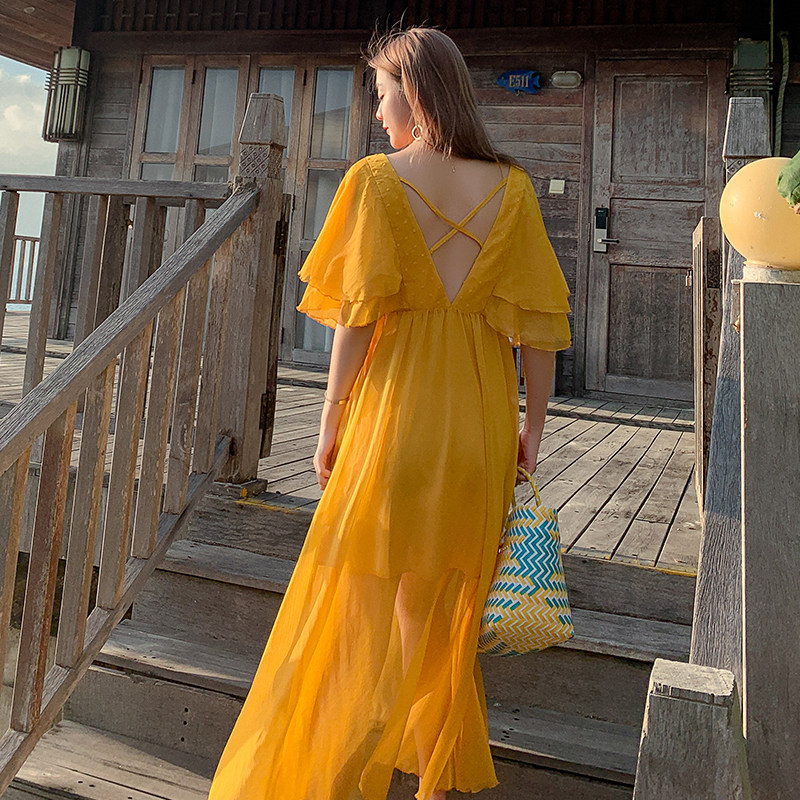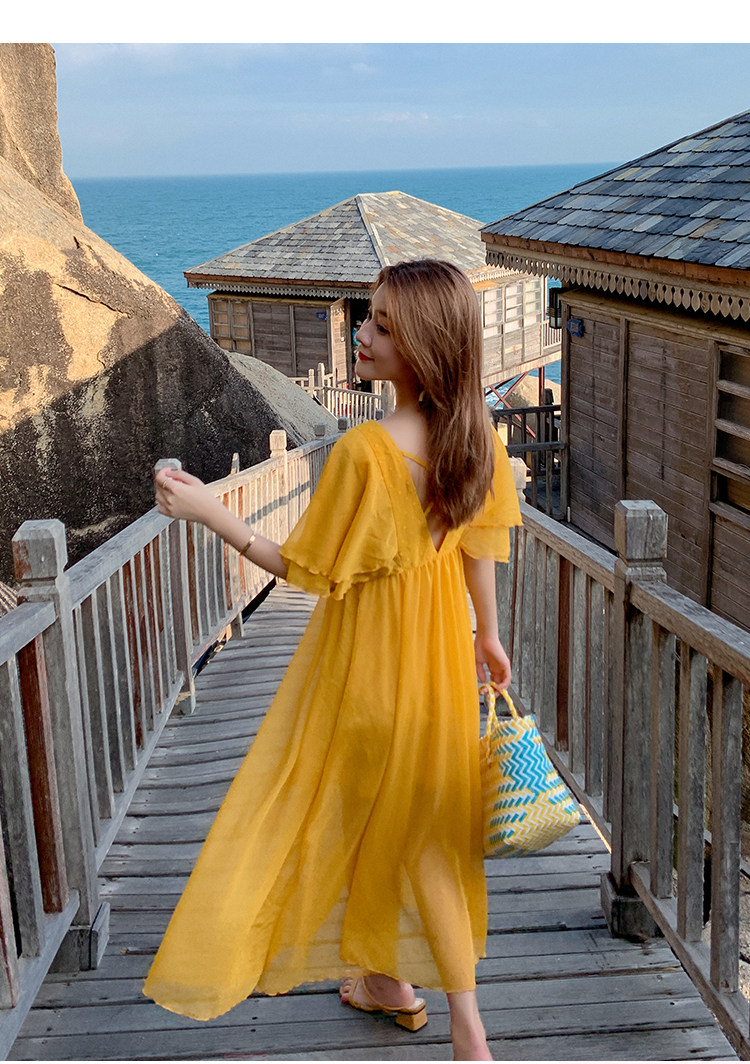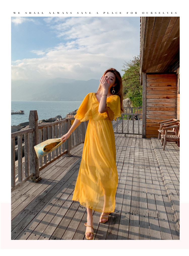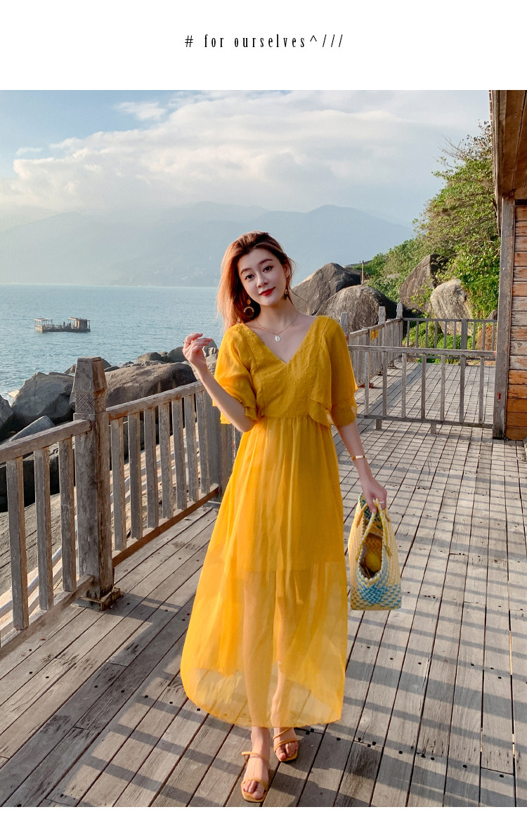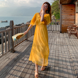 Летнее желтое ретро пляжное платье, длинная юбка, по фигуре, в корейском стиле