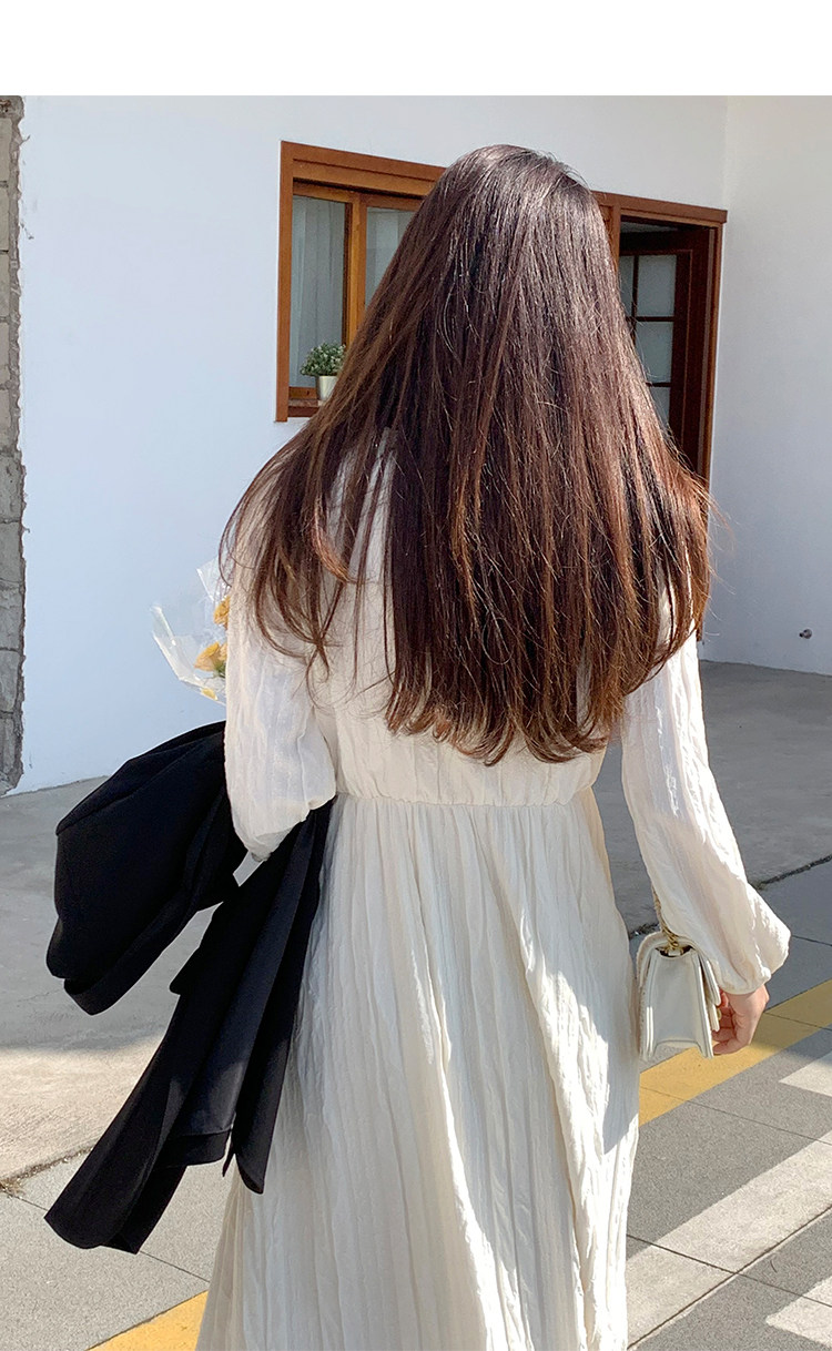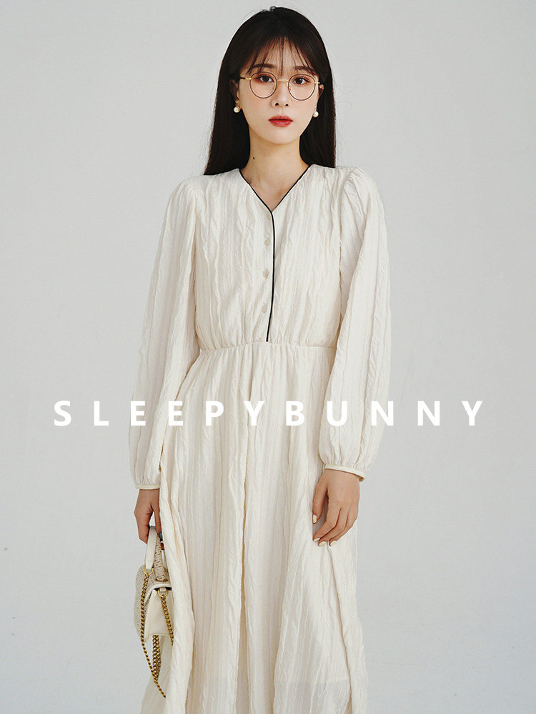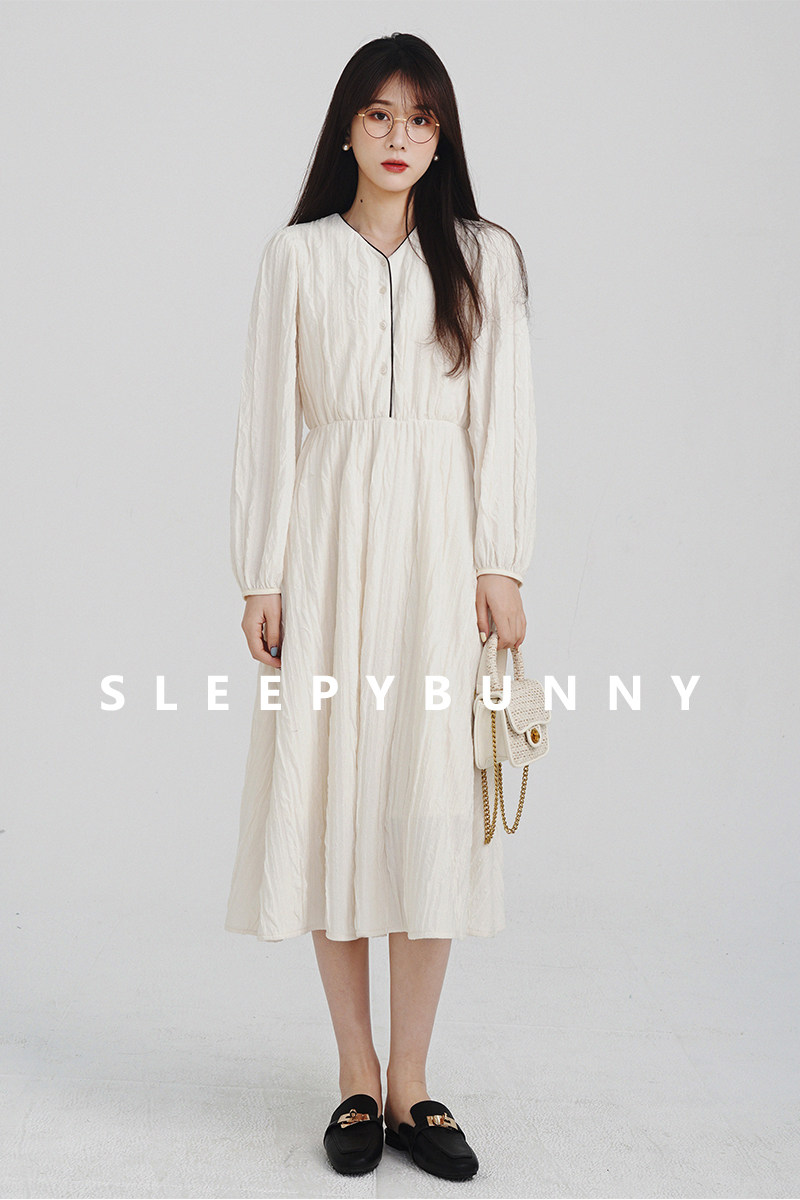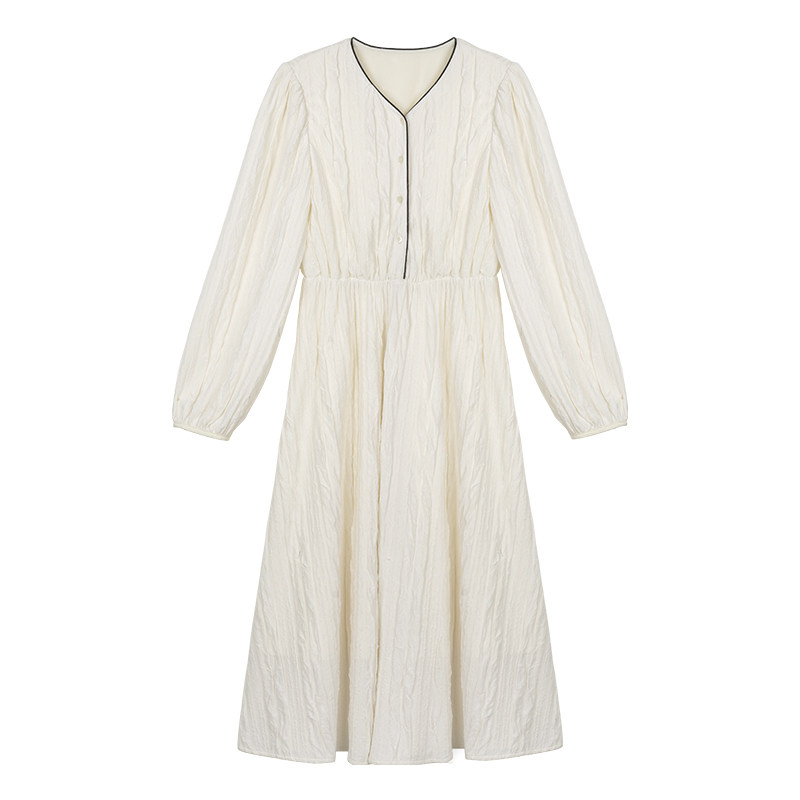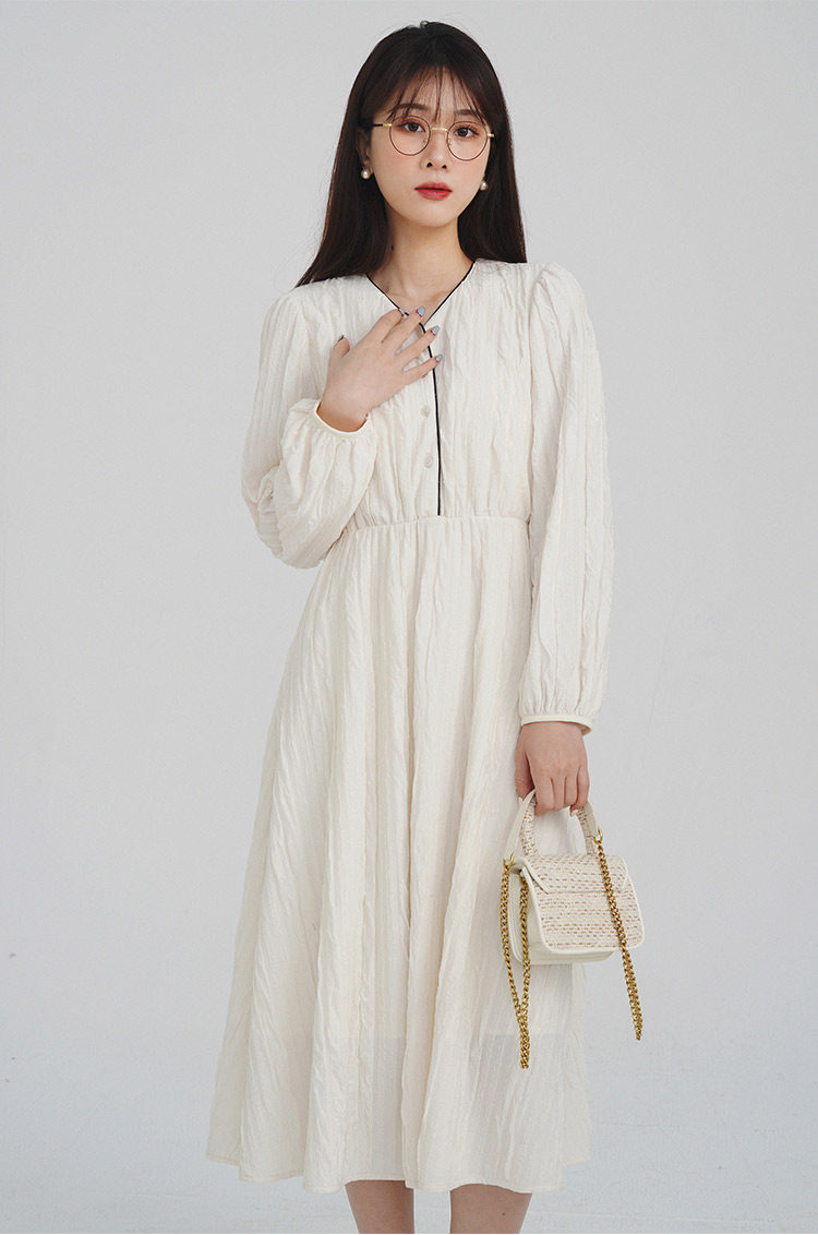 Сливочное весеннее платье, лонгслив, длинная юбка, французский стиль, широкая цветовая палитра, V-образный вырез, высокая талия, эластичная талия, средней длины