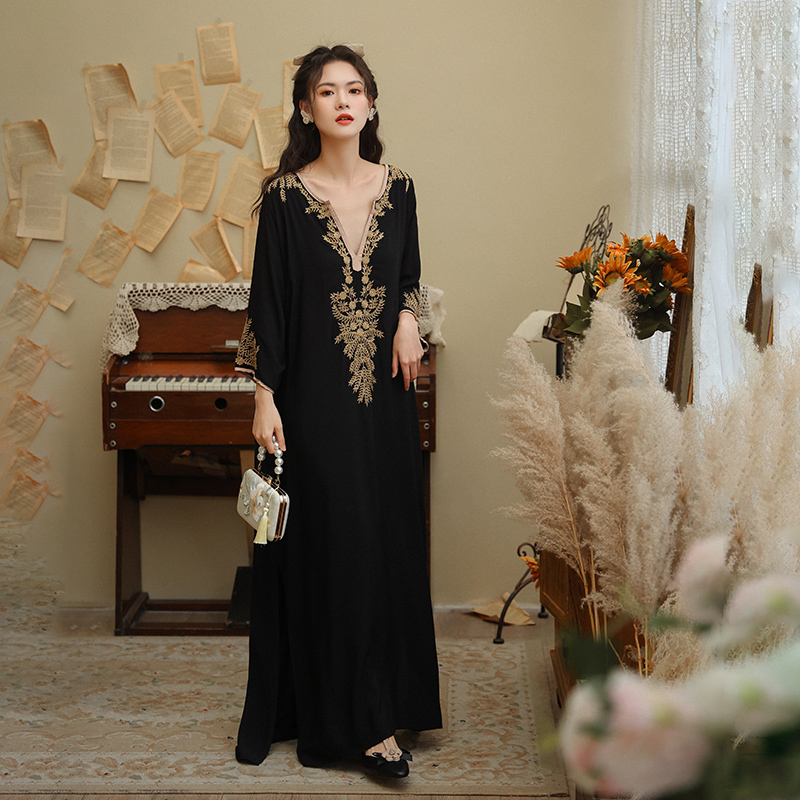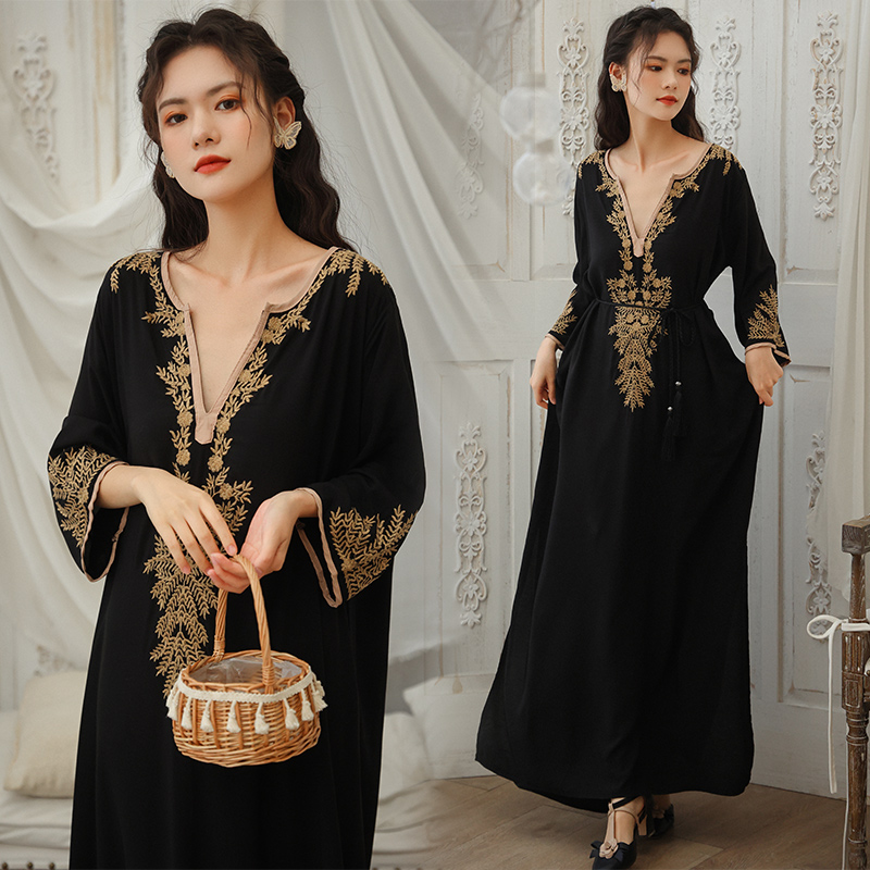 Этническое милое платье, длинная юбка, ремень, этнический стиль, с вышивкой, в западном стиле, стиль бохо, свободный крой, V-образный вырез