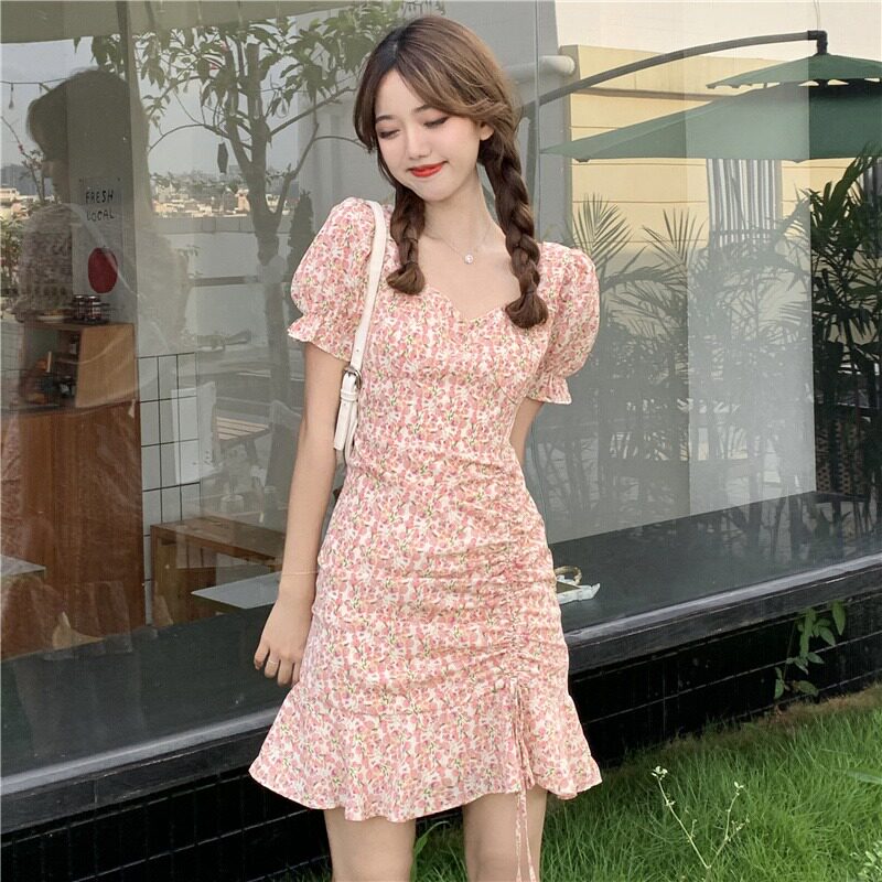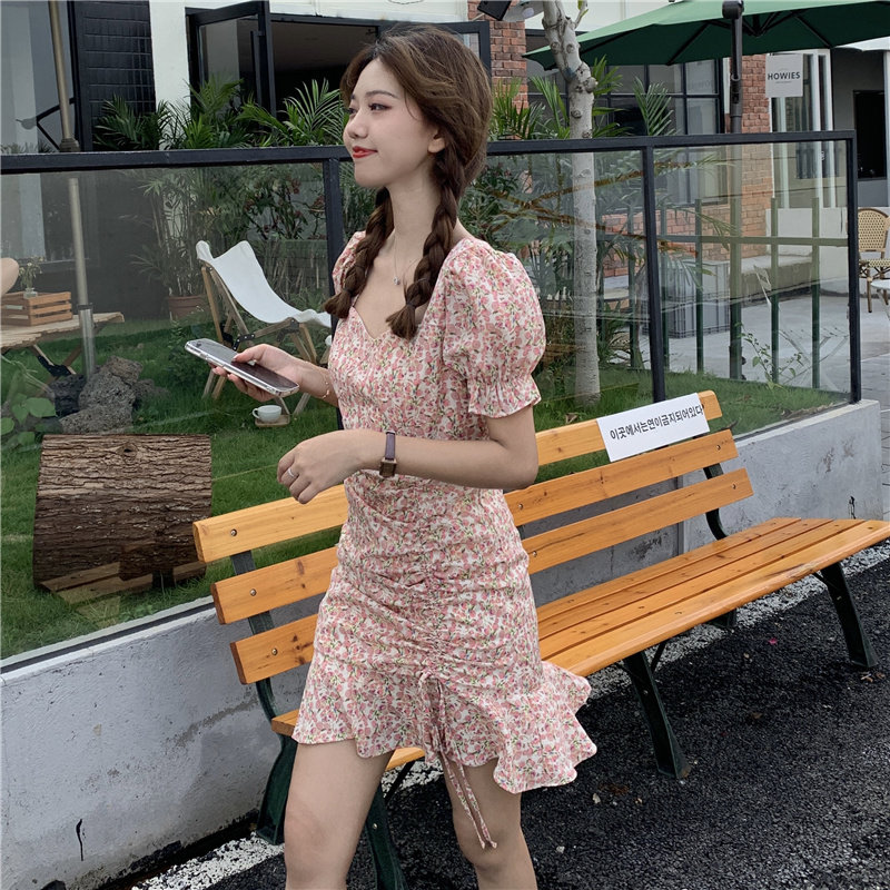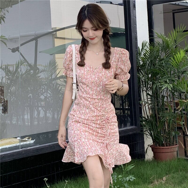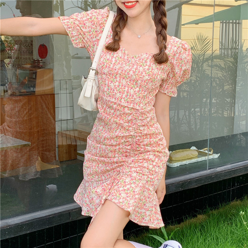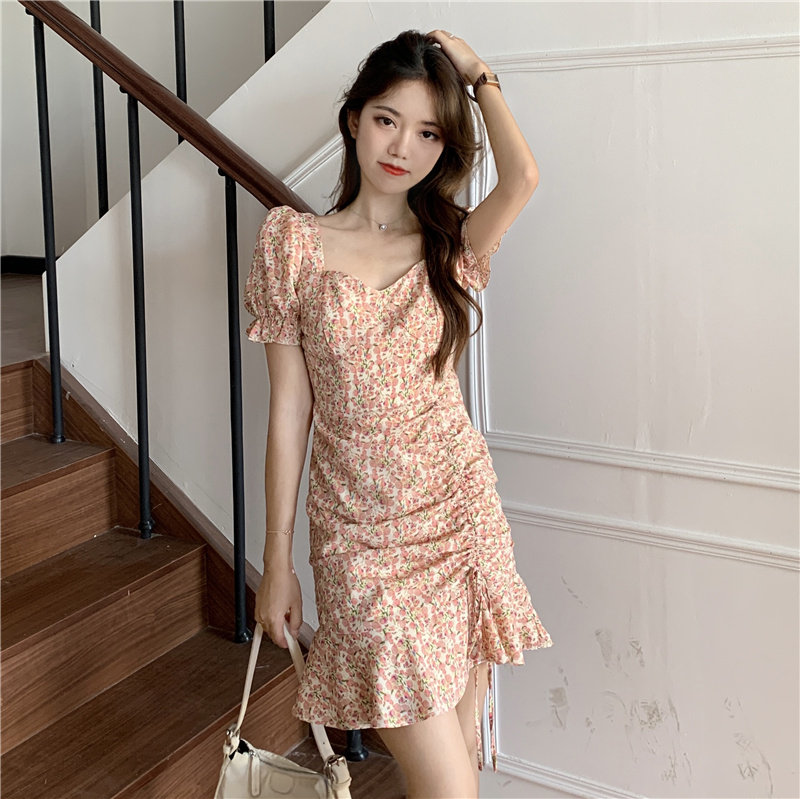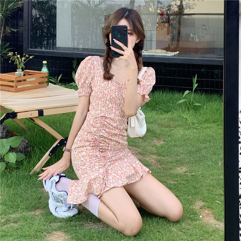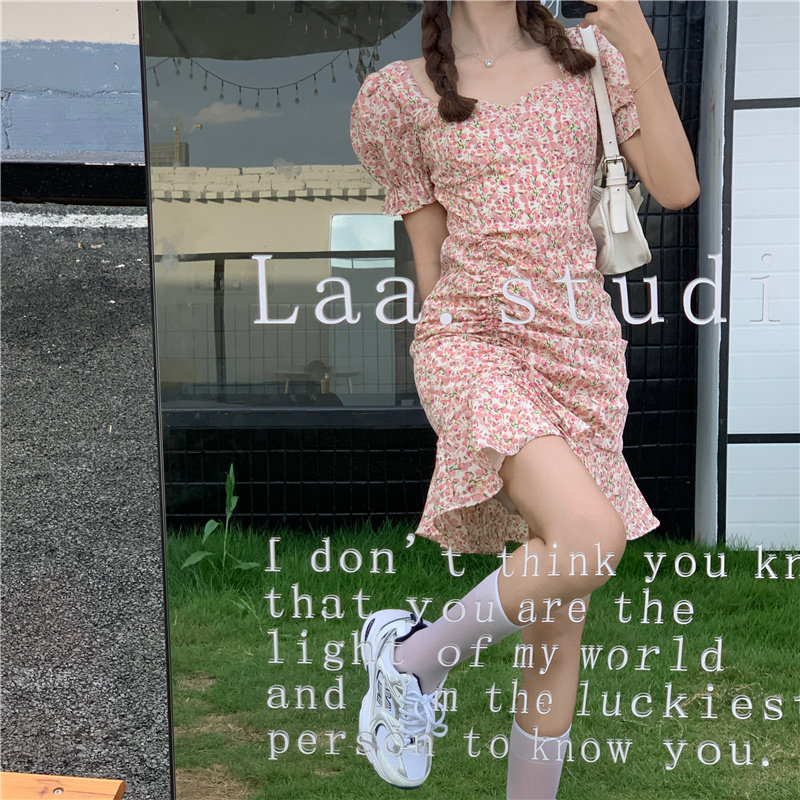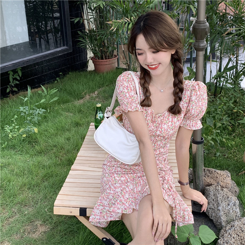 Летнее платье, приталенный корсет, в цветочек, французский стиль, короткий рукав