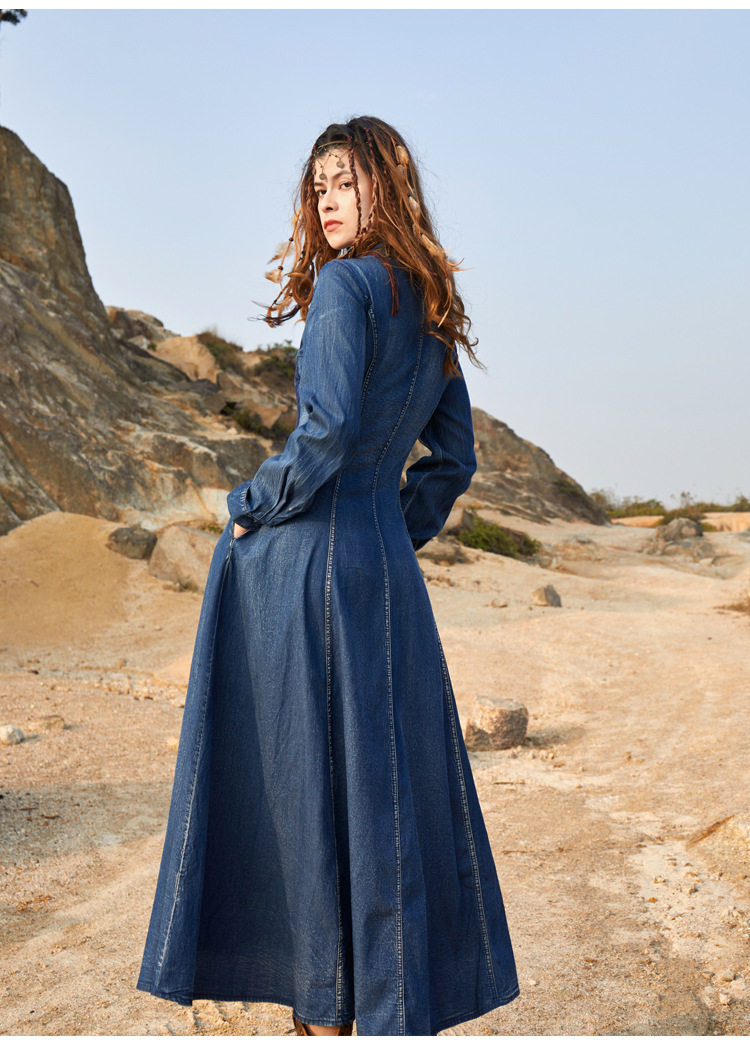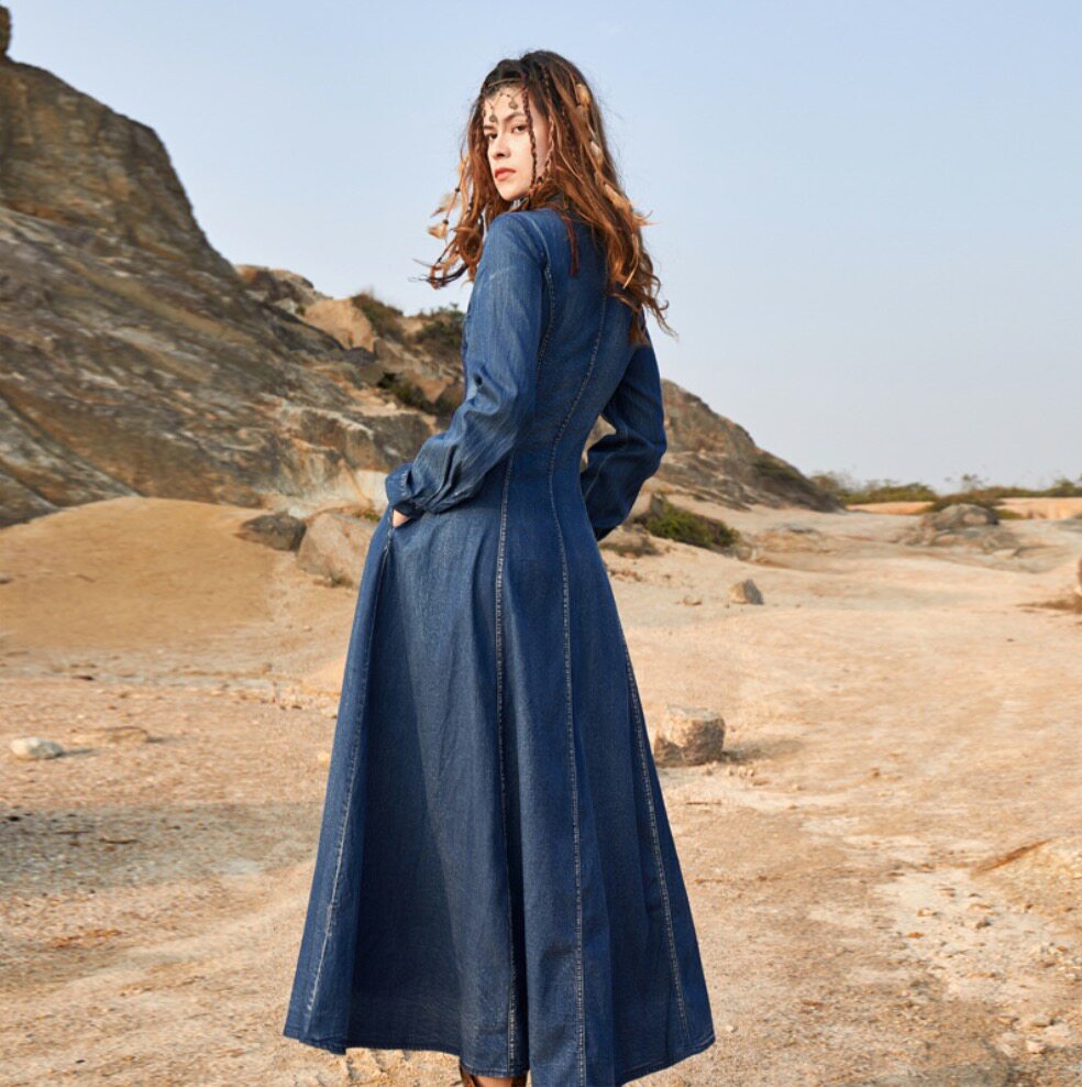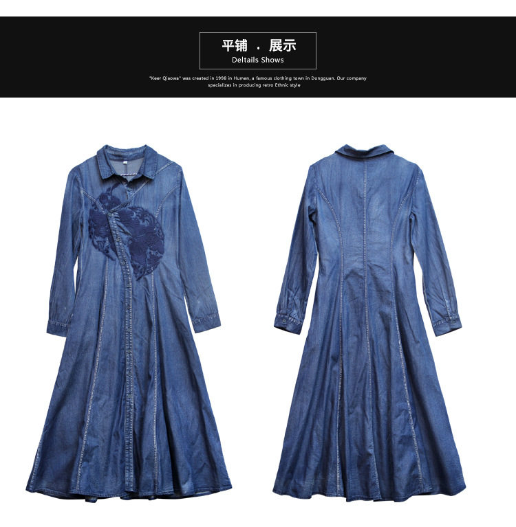 Осеннее ретро платье, джинсовая юбка, длинная юбка, с вышивкой, яркий броский стиль, по фигуре