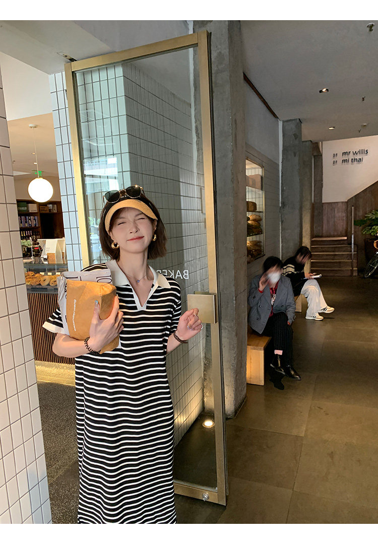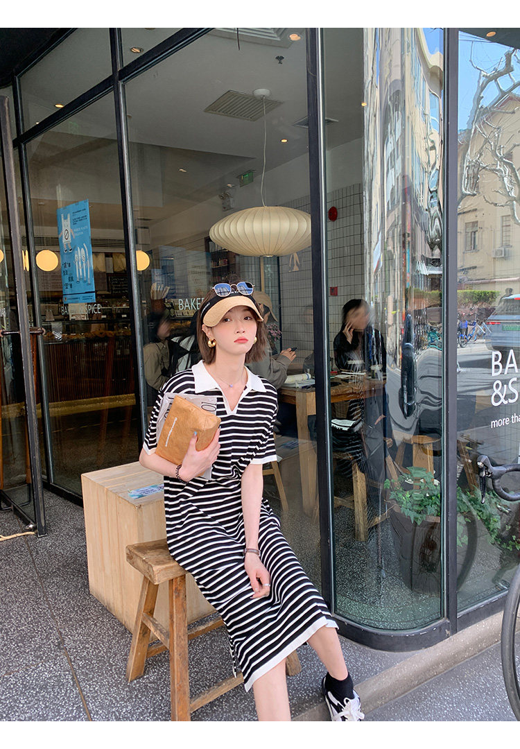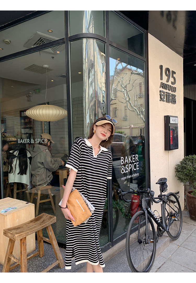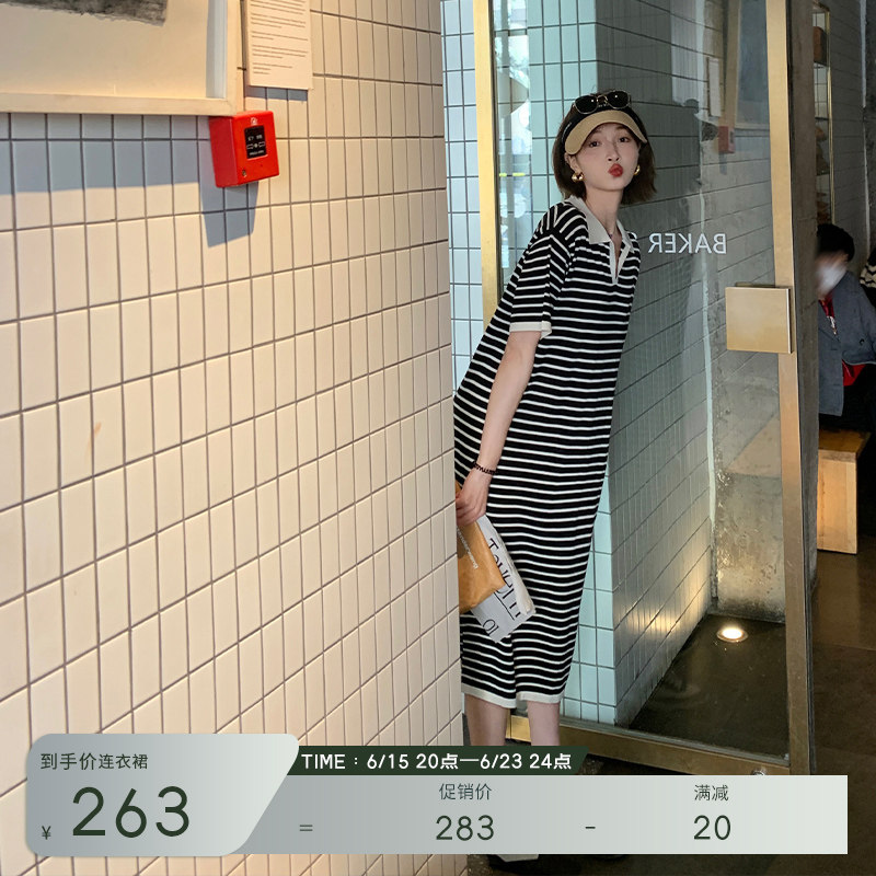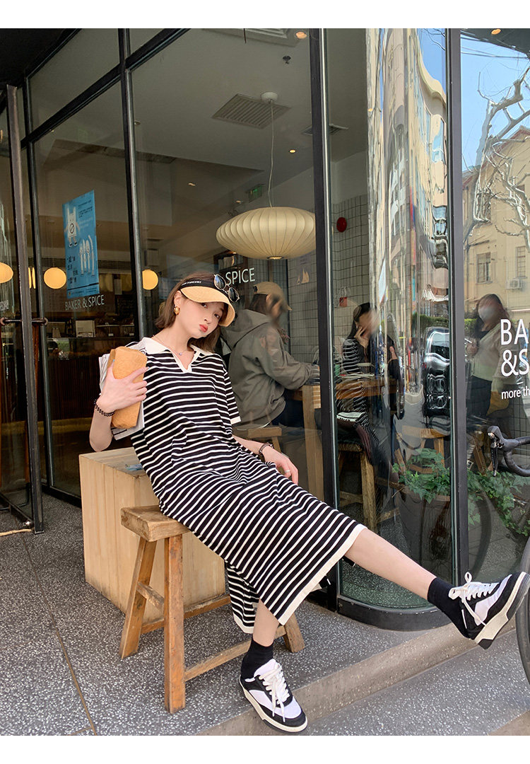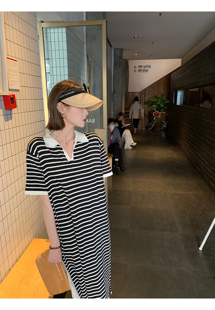 Ретро трикотажная футболка с коротким рукавом, длинное платье, юбка, воротник поло, свободный крой, средней длины