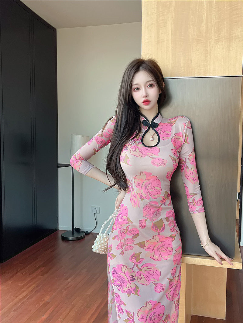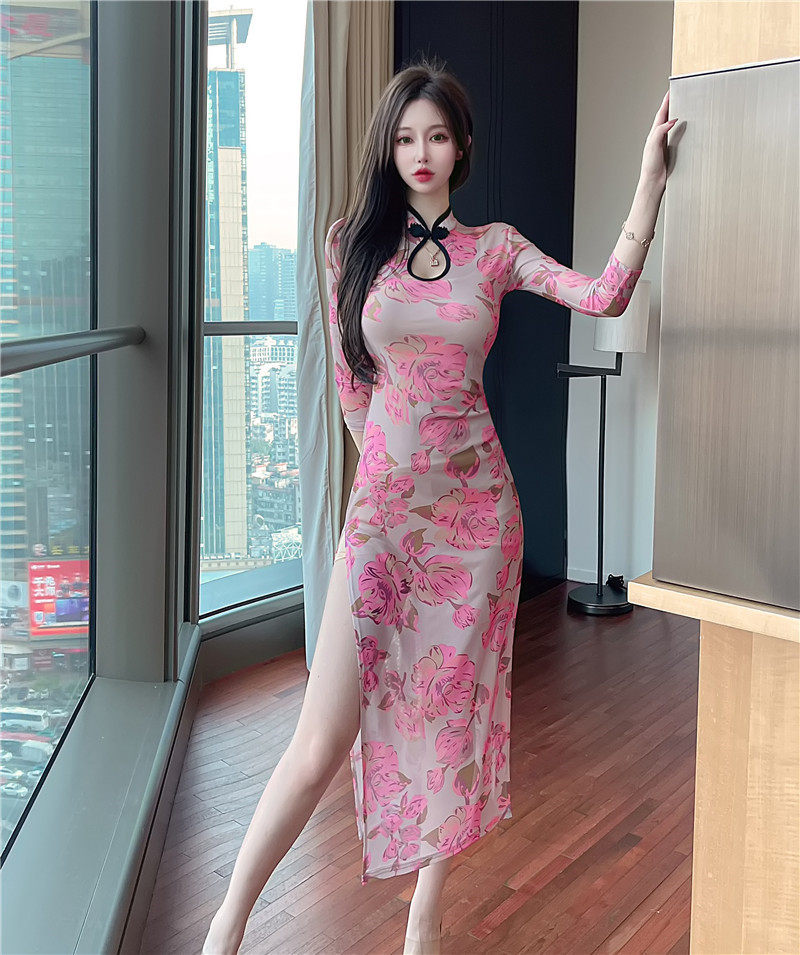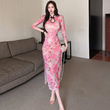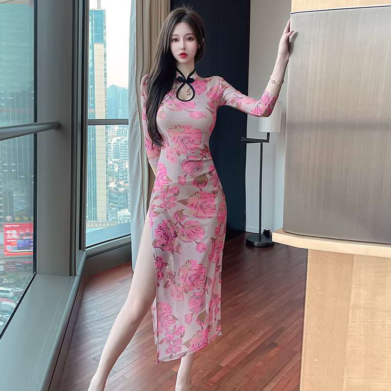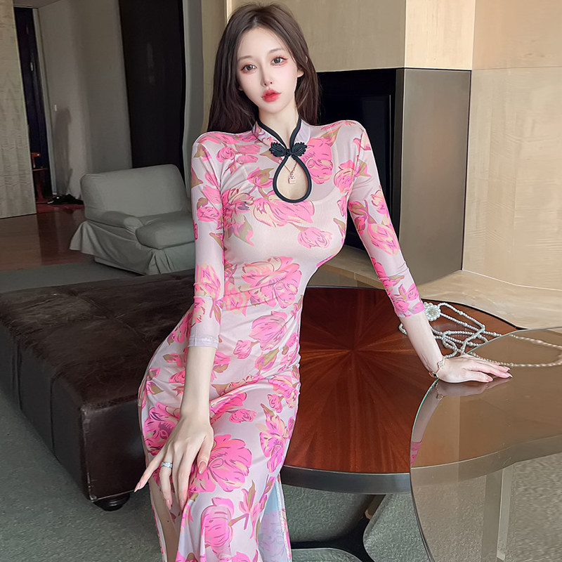 Сексуальное женское приталенное ципао, длинная юбка, платье с рукавами, яркий броский стиль, с акцентом на бедрах