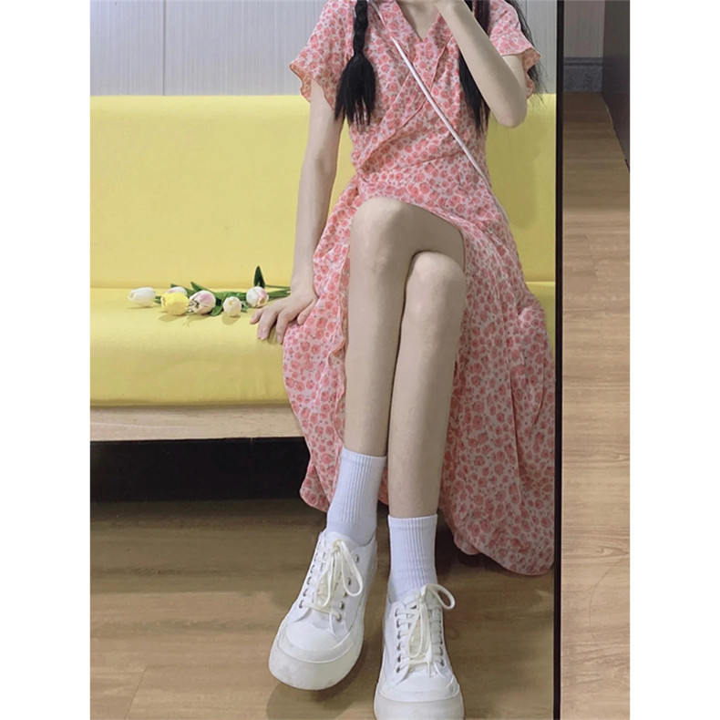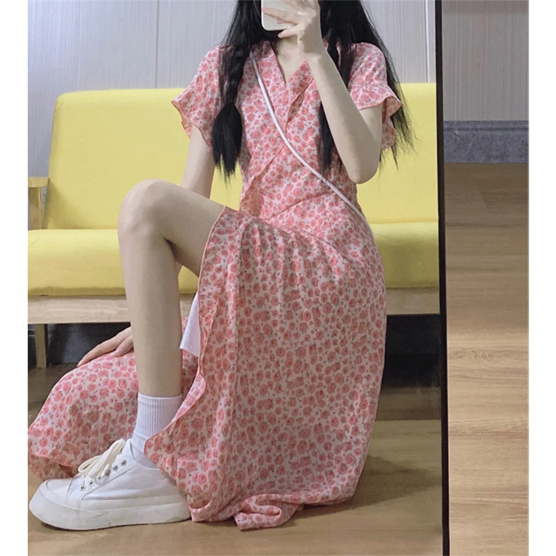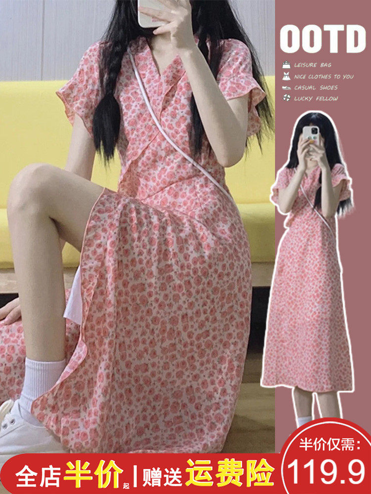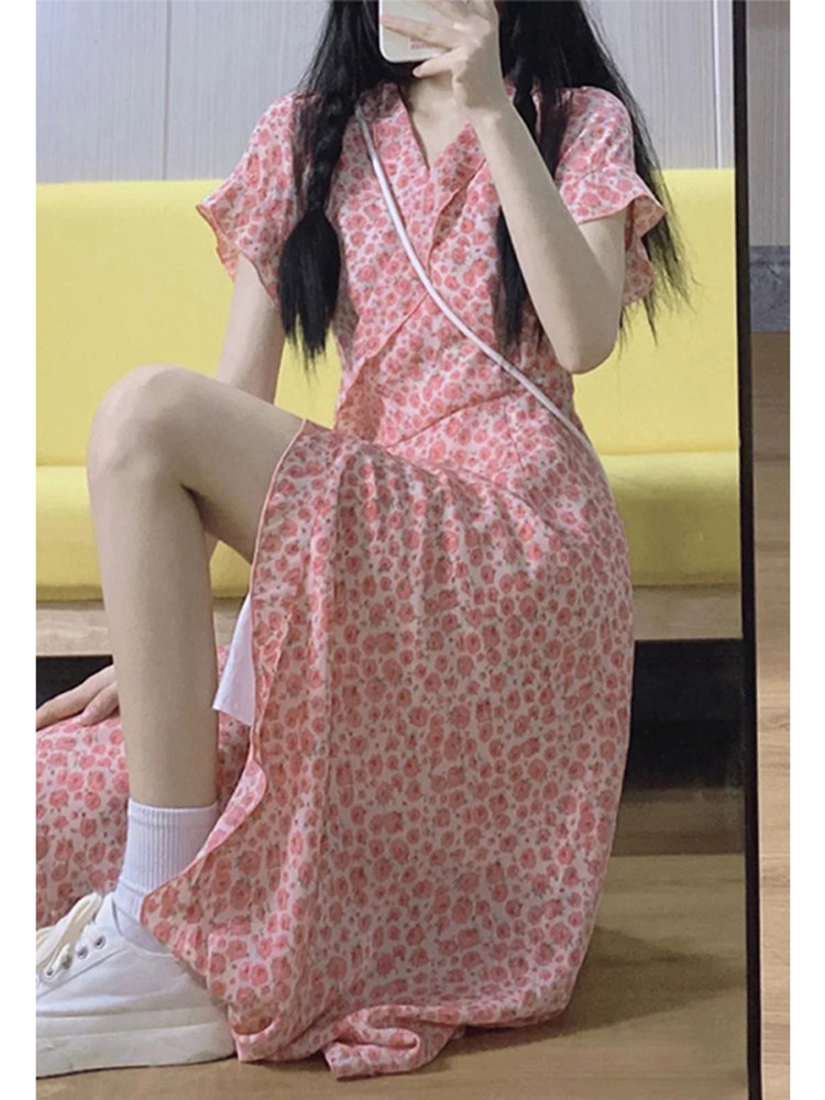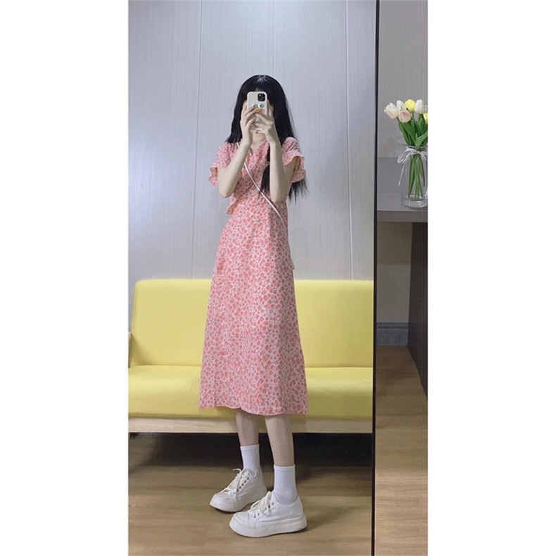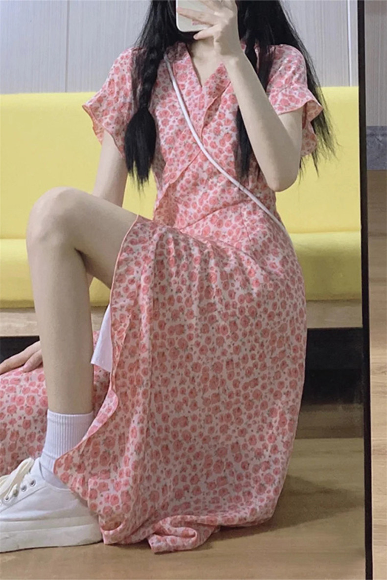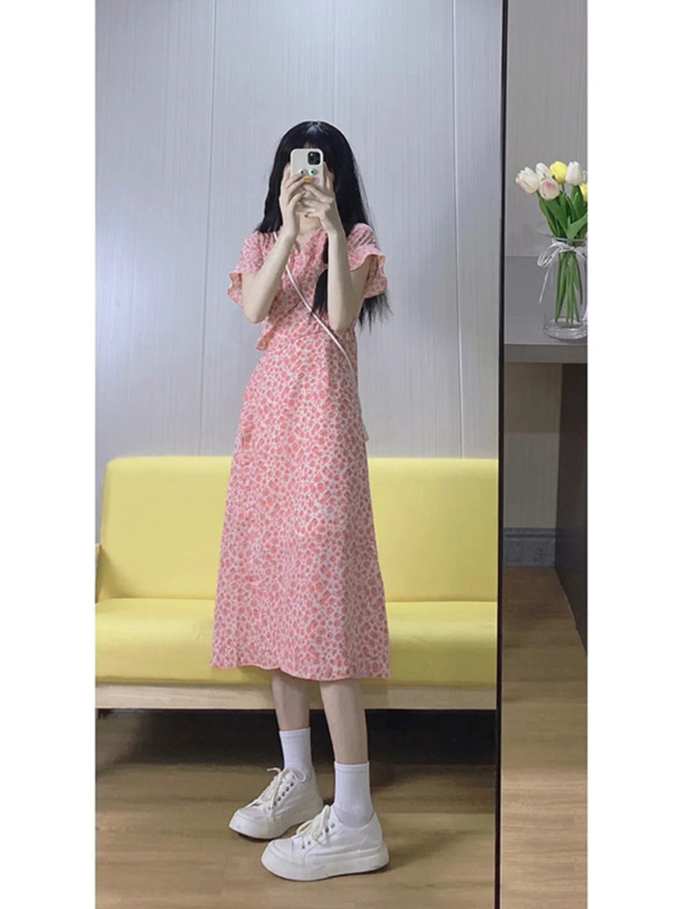Летнее платье, розовая длинная юбка, коллекция 2023, городской стиль, французский стиль, в цветочек