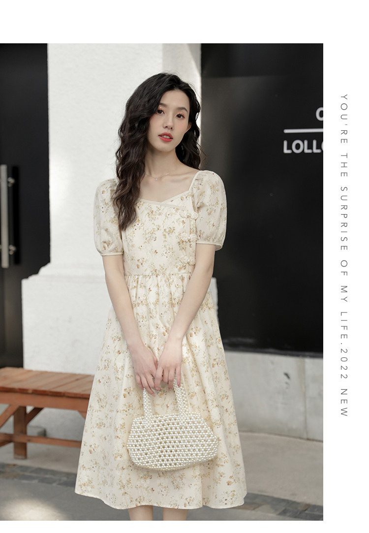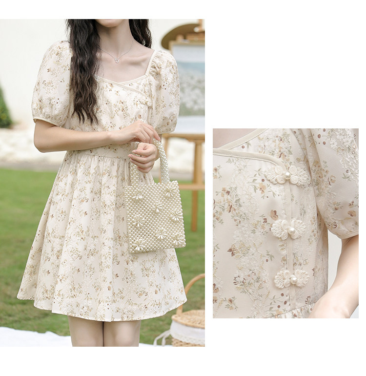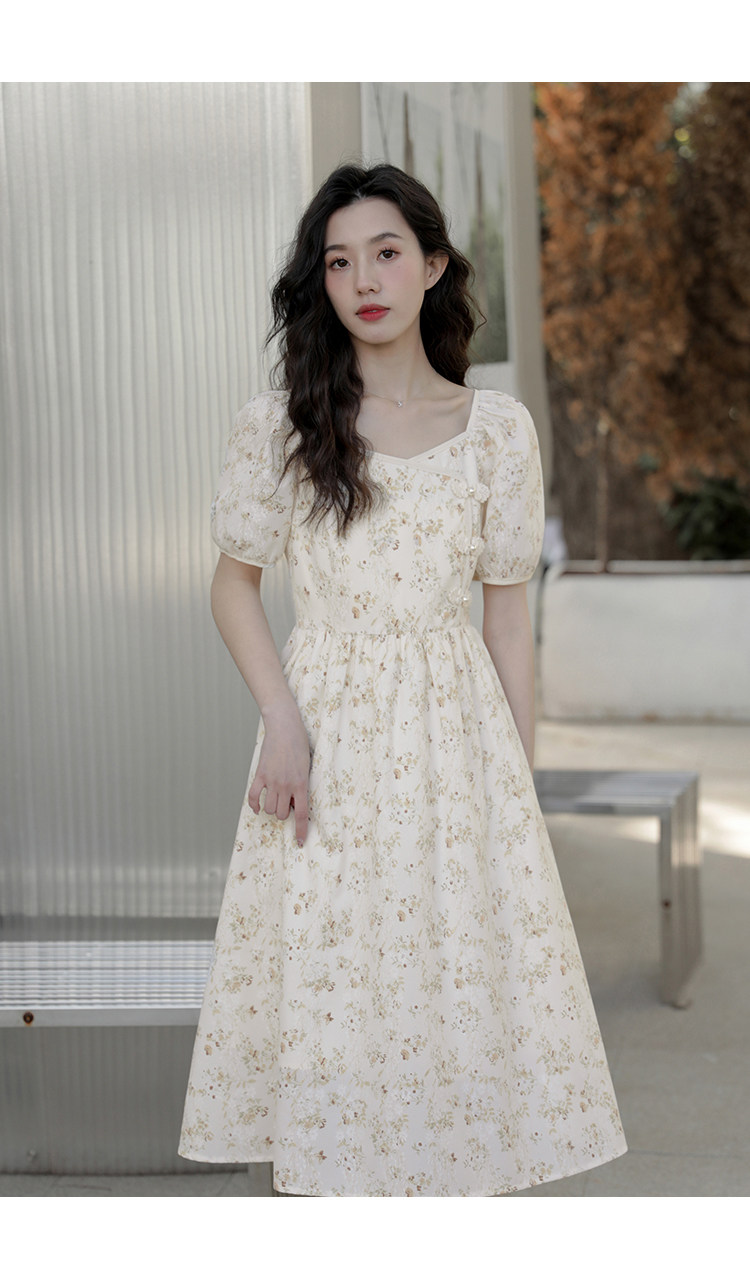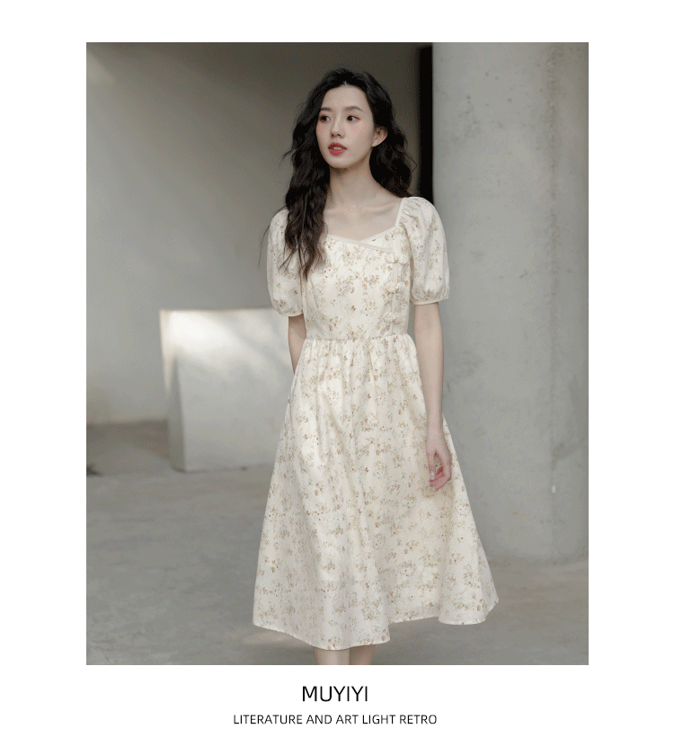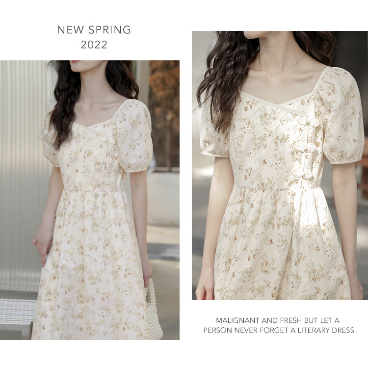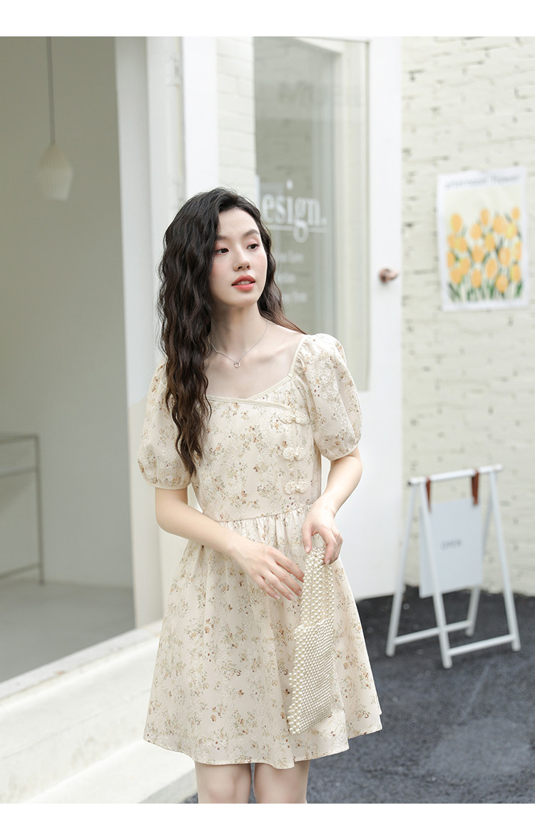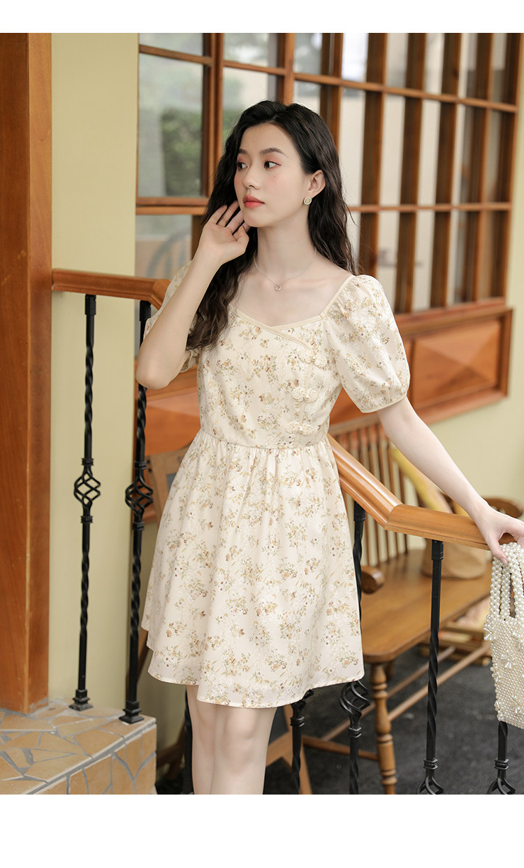 Ципао, небольшое дизайнерское платье, китайский стиль, французский стиль, квадратный вырез, в цветочек