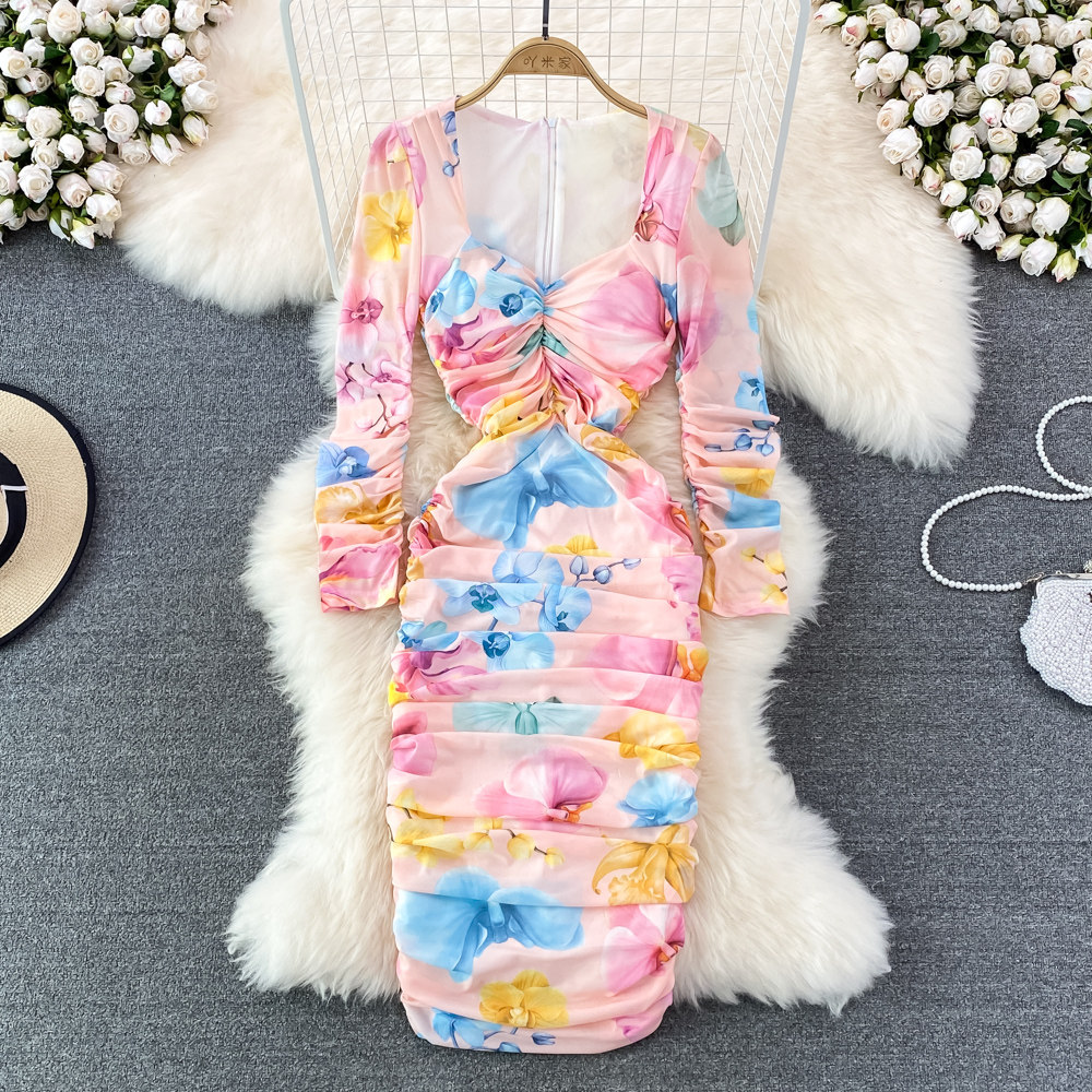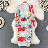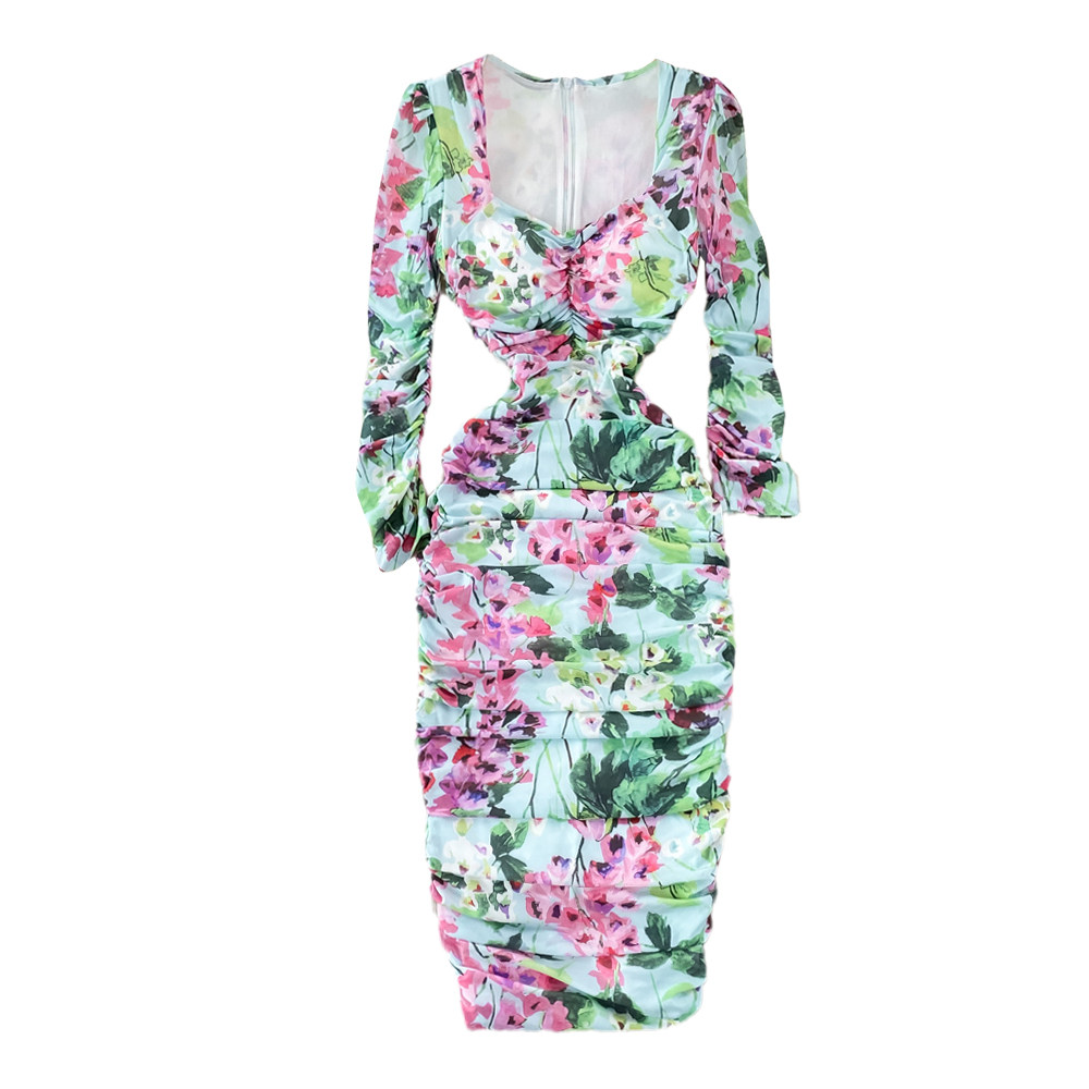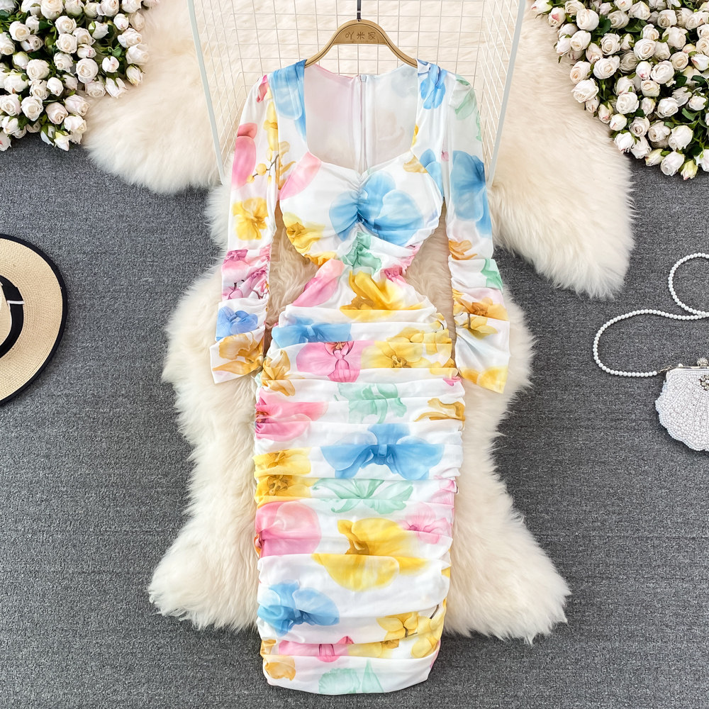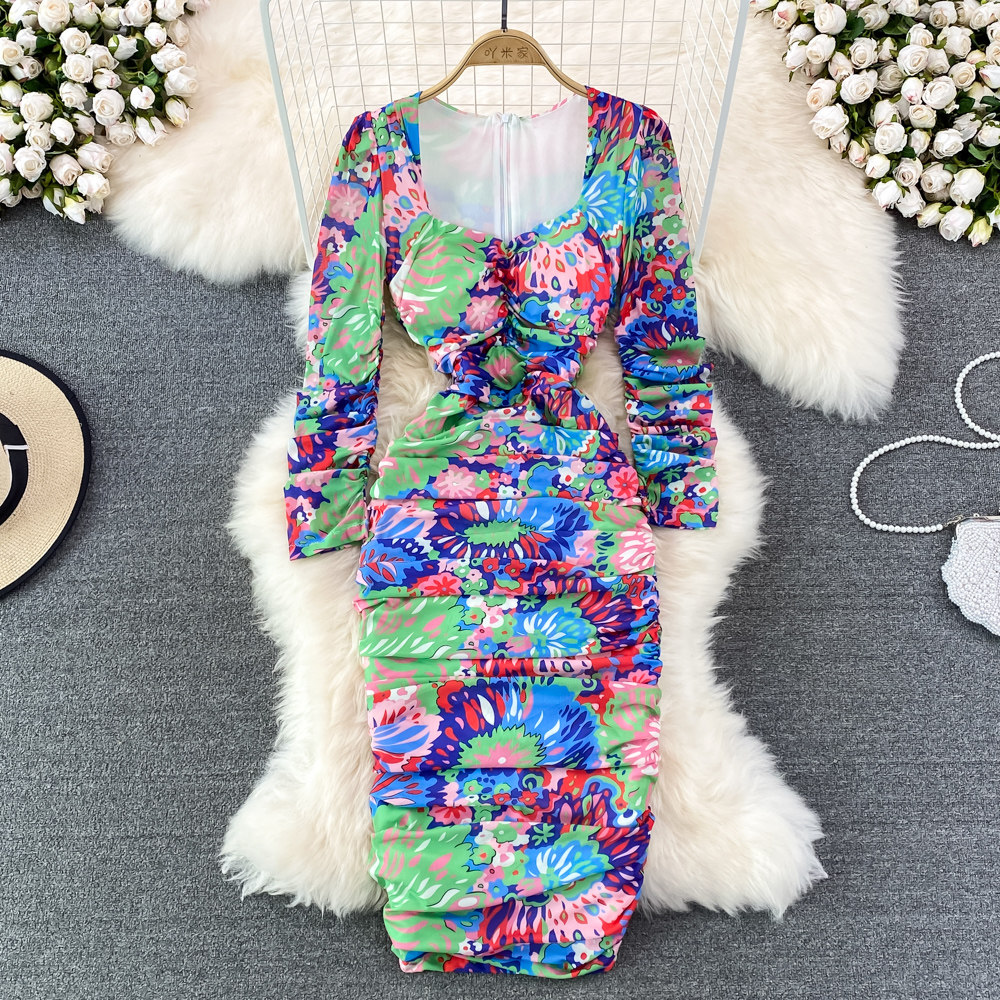 Эластичное приталенное элегантное платье, длинная юбка, квадратный вырез, рукава фонарики, с акцентом на бедрах