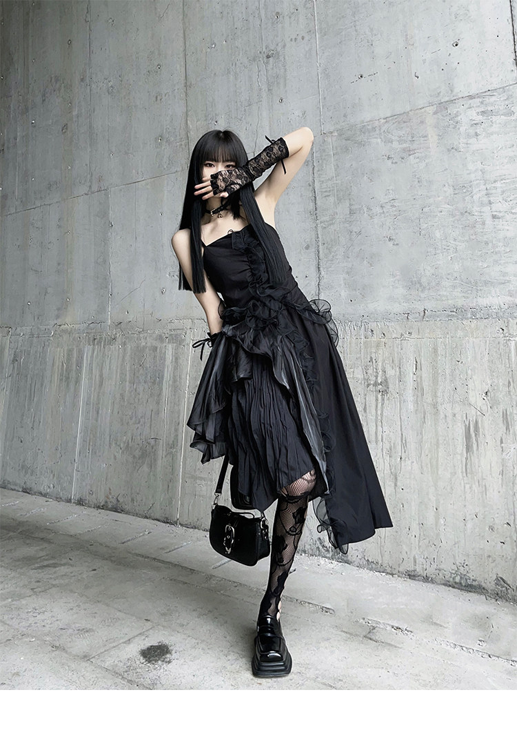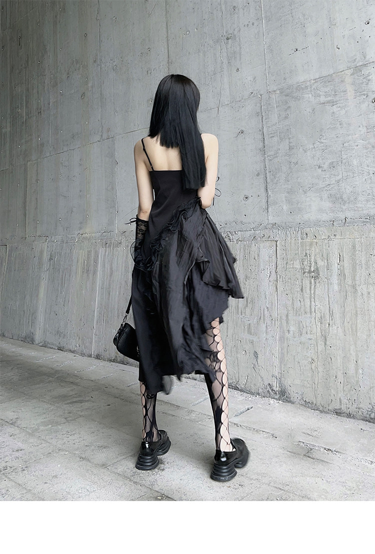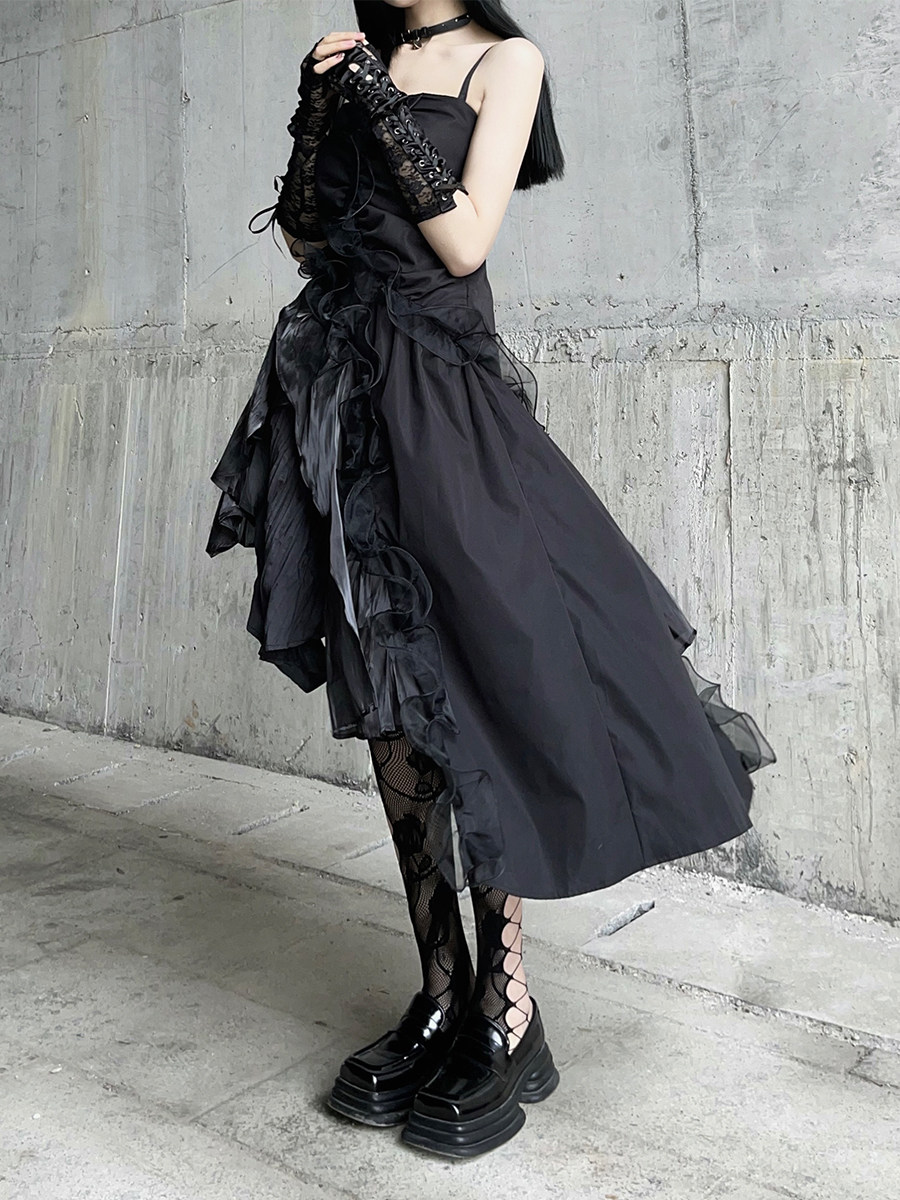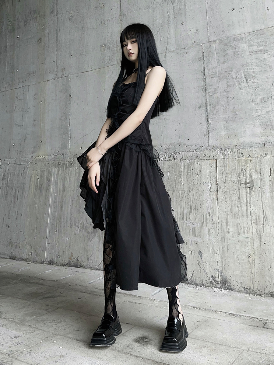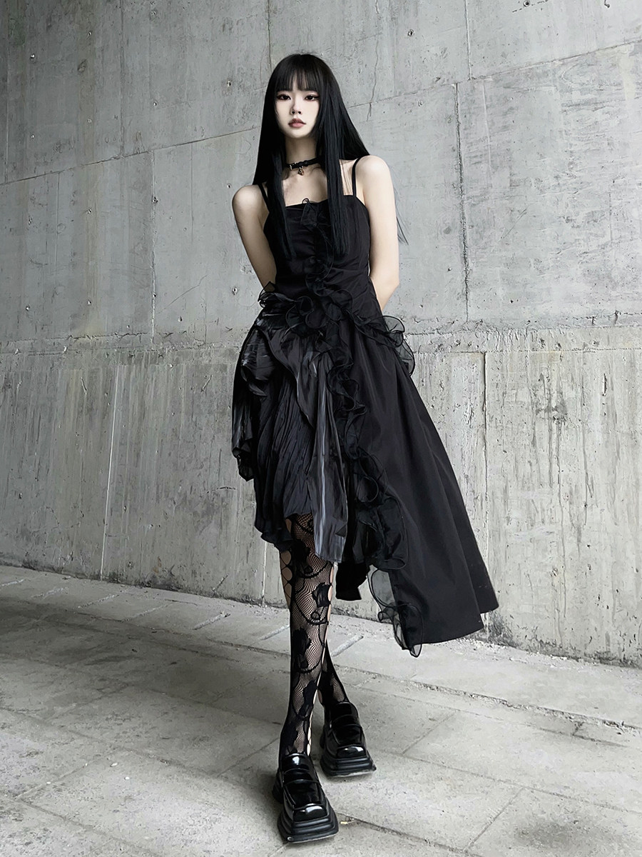 幽灵少女 Черное нерегулярное камизольное платье ниша неустойчивая вечеринка по случаю дня рождения сладкая пряная маленькая подарка