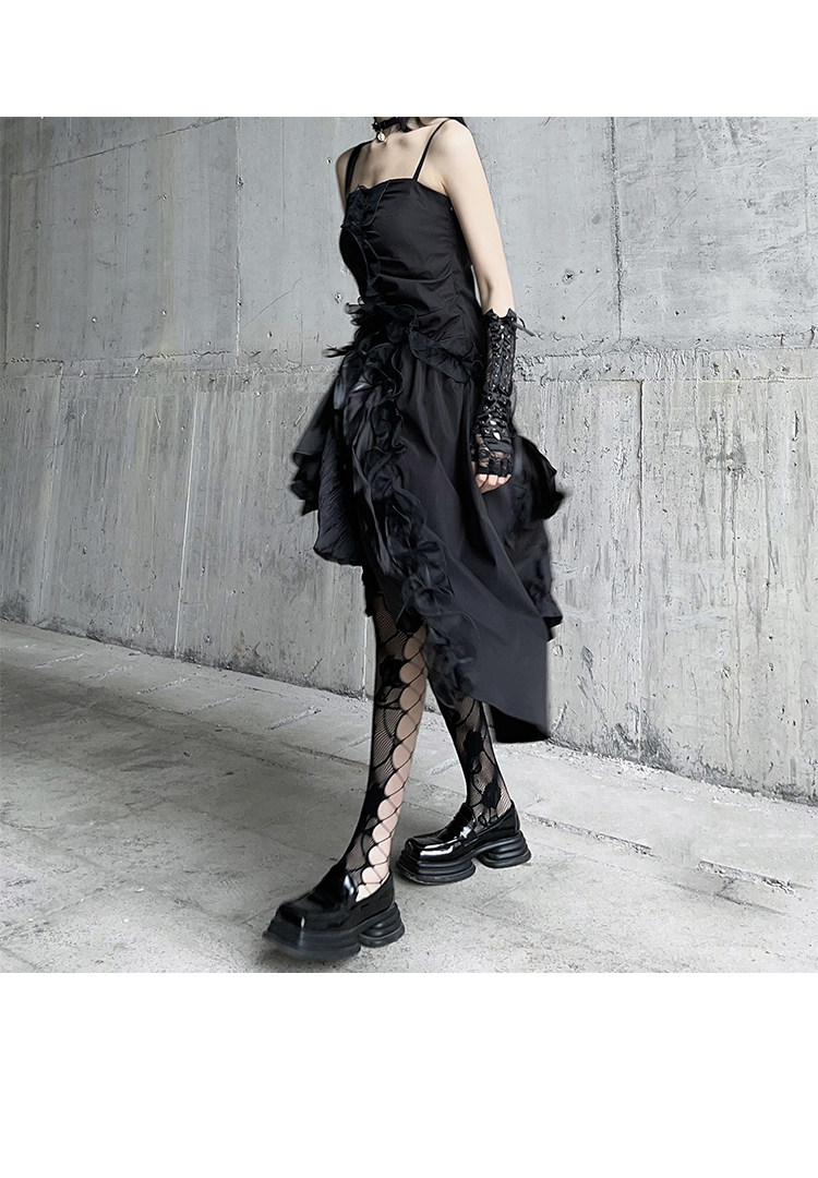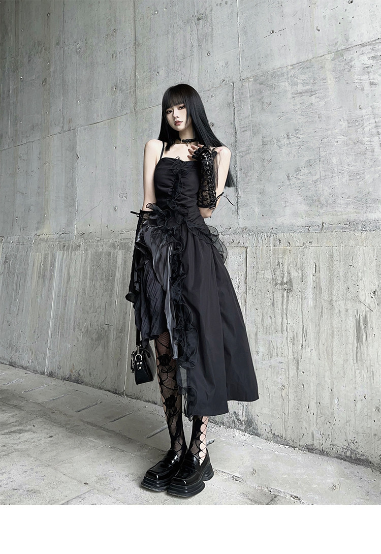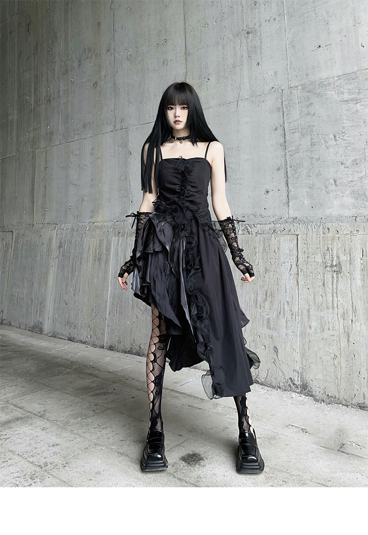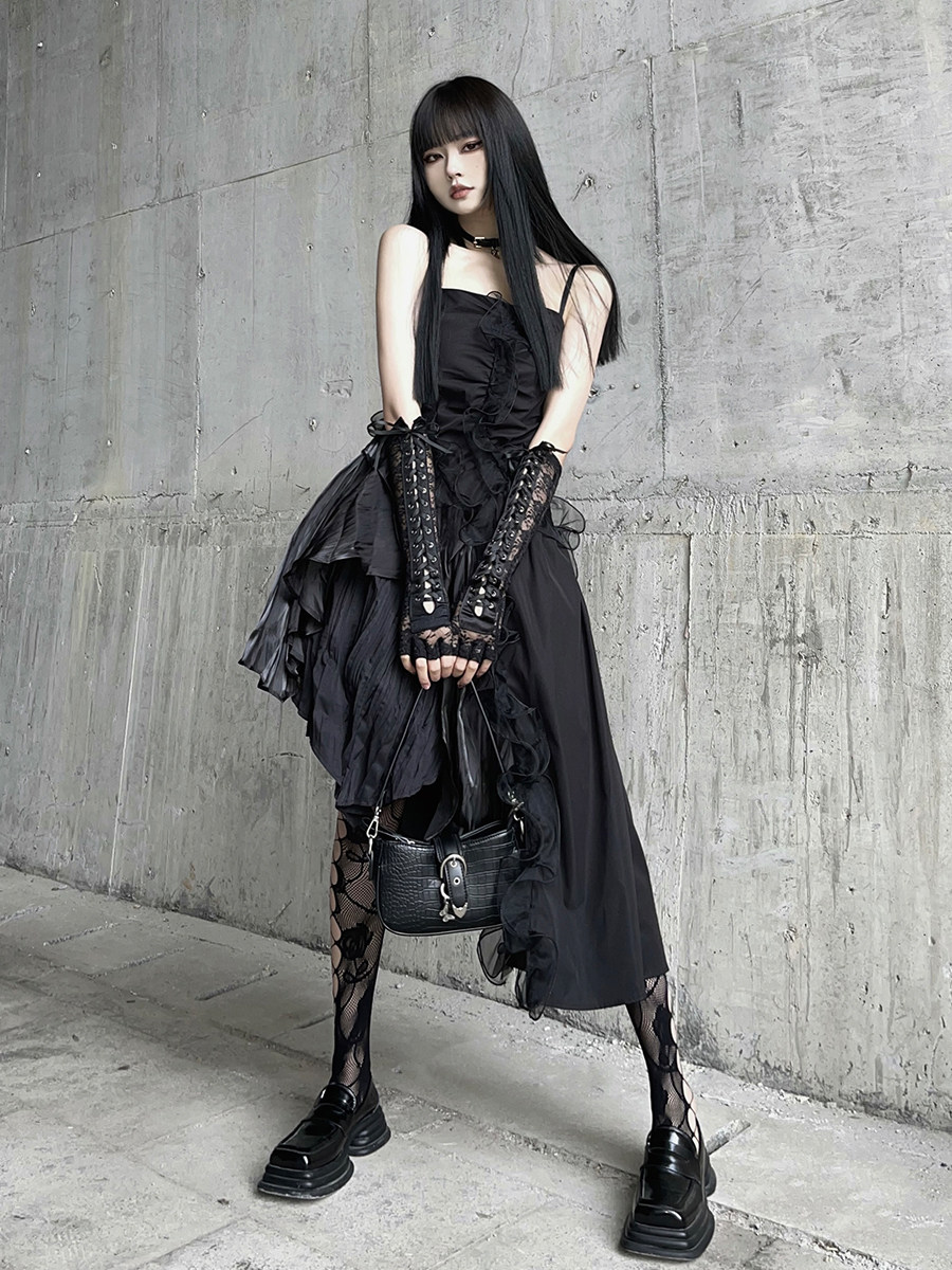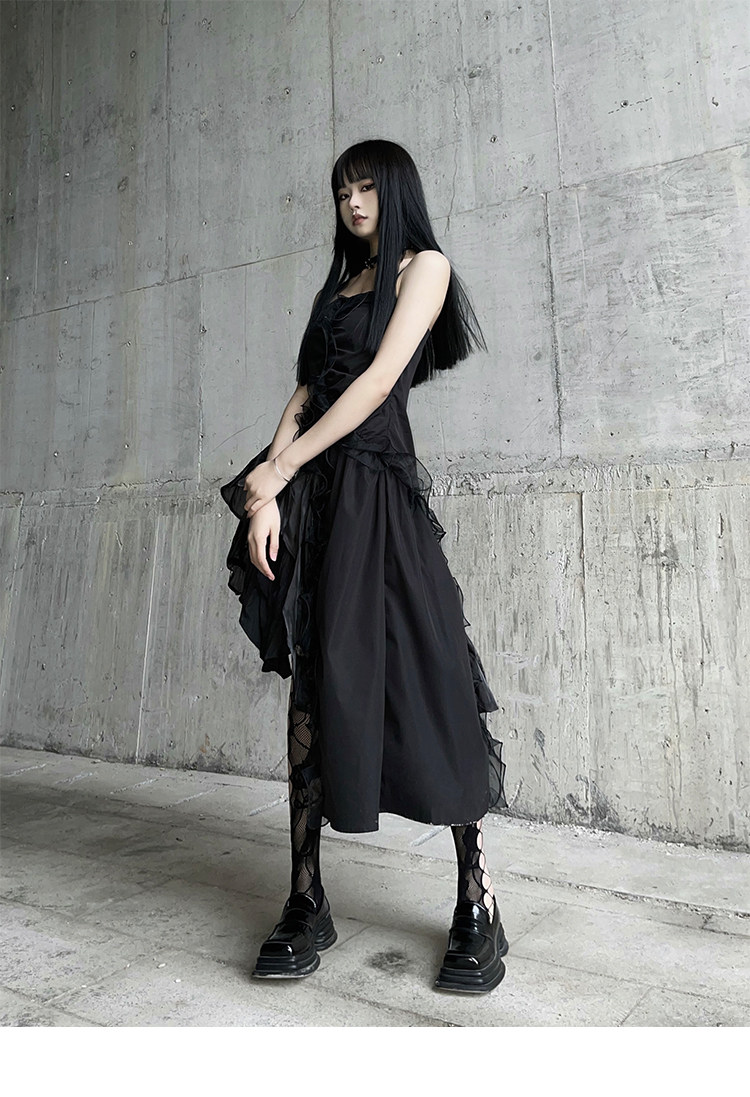 幽灵少女 Черное нерегулярное камизольное платье ниша неустойчивая вечеринка по случаю дня рождения сладкая пряная маленькая подарка