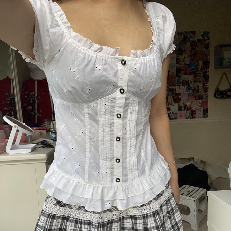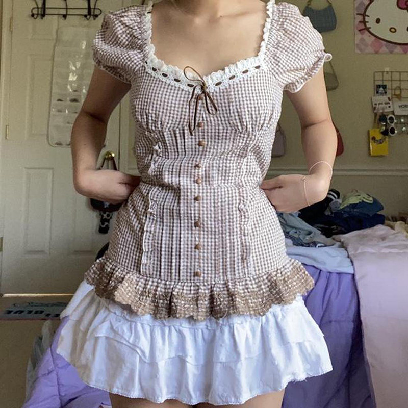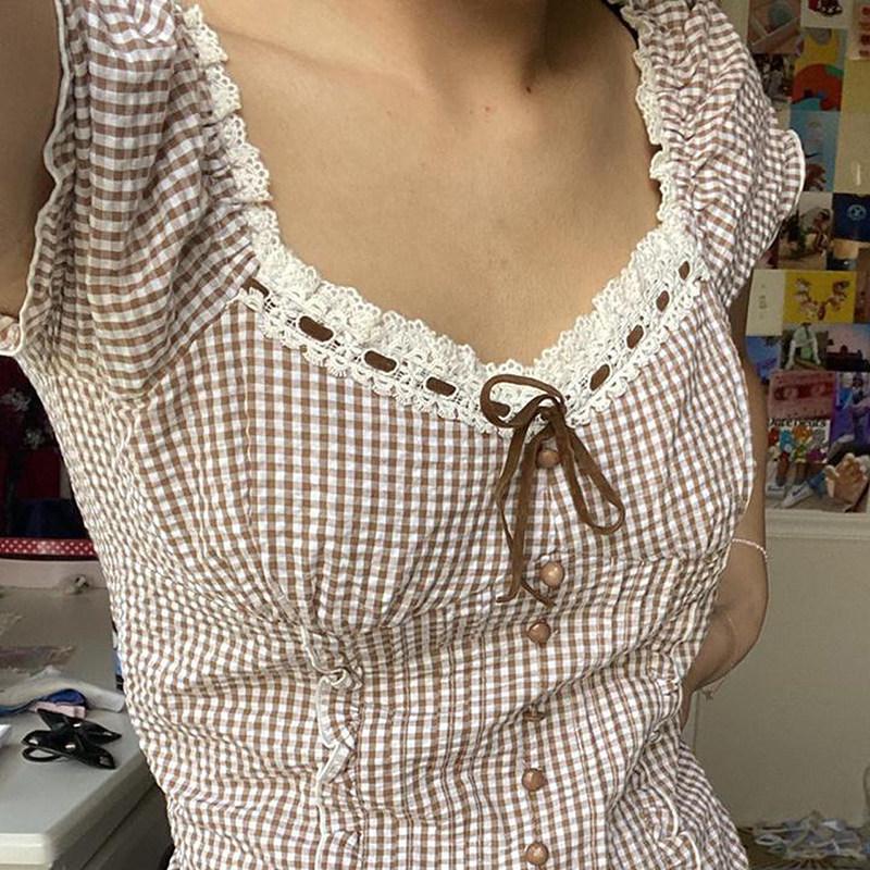 Y2K Kawaii сладкий урожай Top Fairycore Gunge Retro Plaid Lace U U