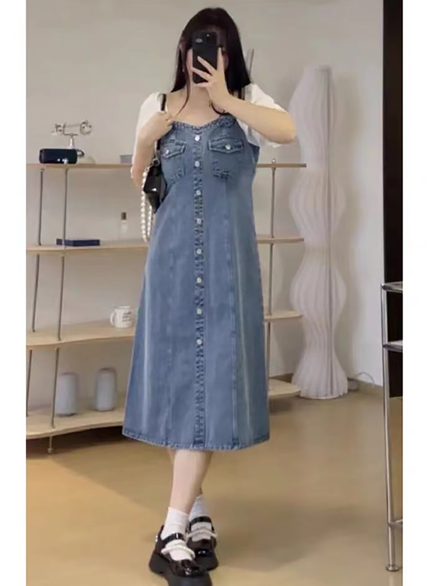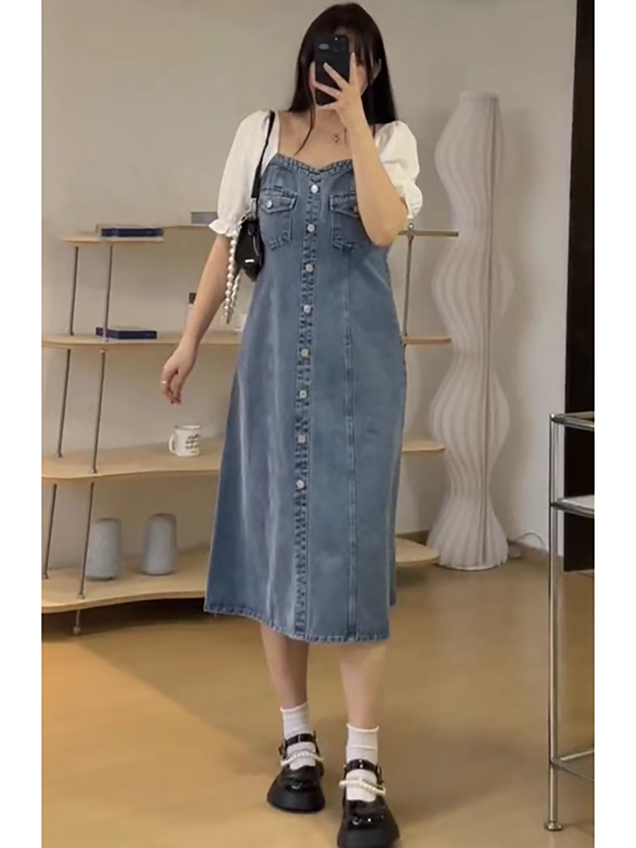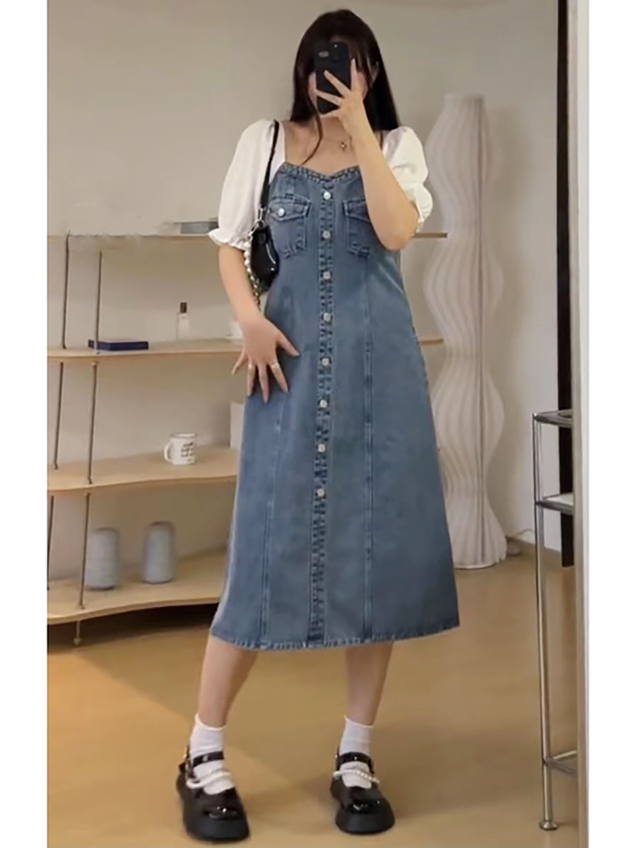 Ретро джинсовое платье, длинная юбка, большой размер, квадратный вырез, рукава фонарики, по фигуре