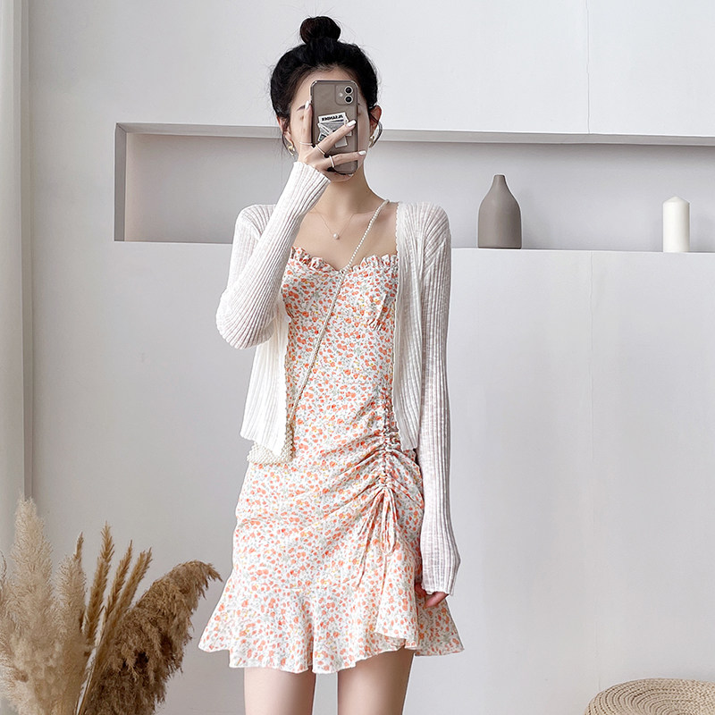 Шифоновая мини-юбка, платье, комплект, коллекция 2022, подходит для подростков, французский стиль, крой «рыбий хвост», цветочный принт