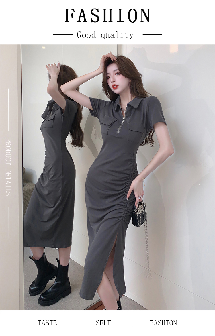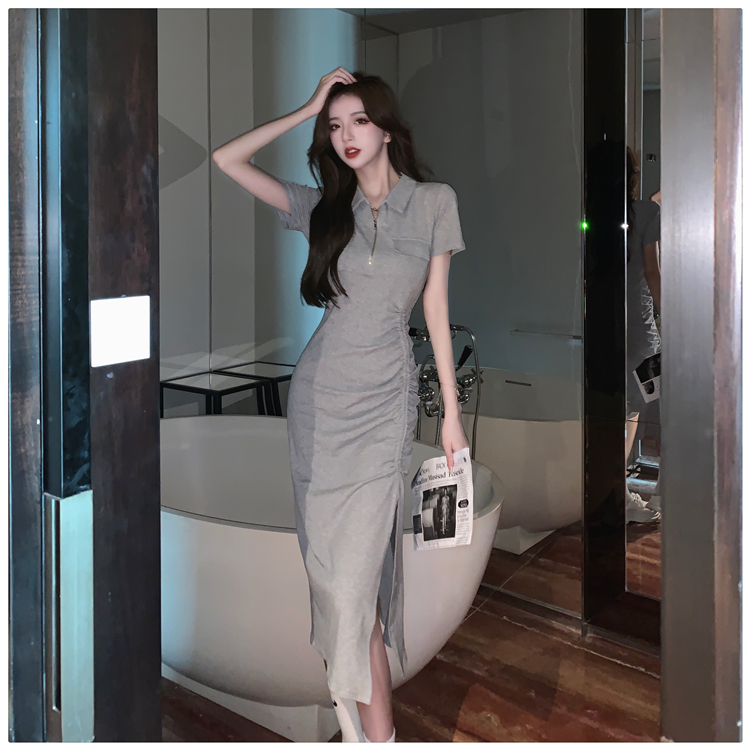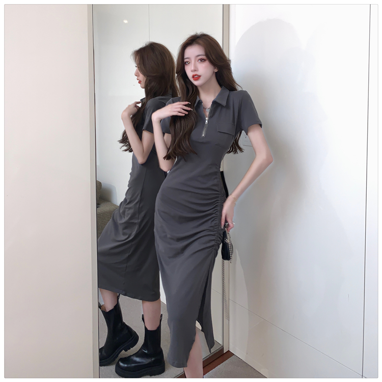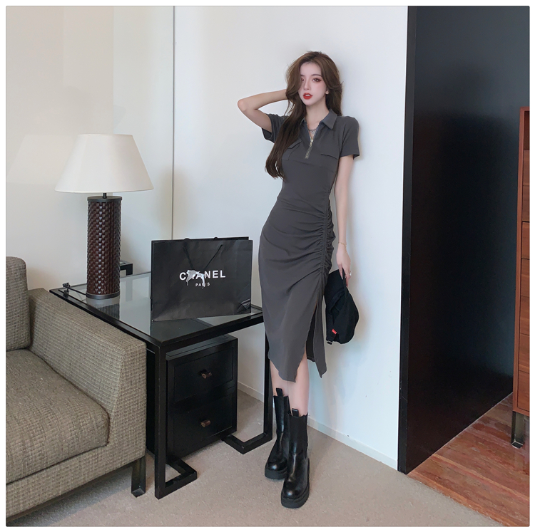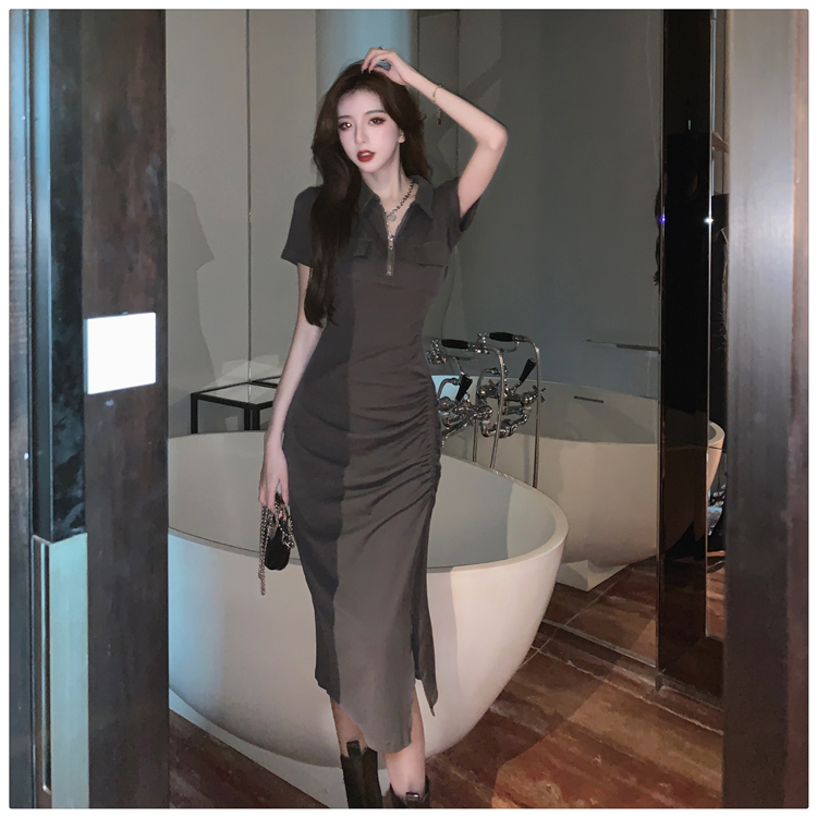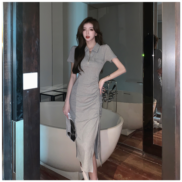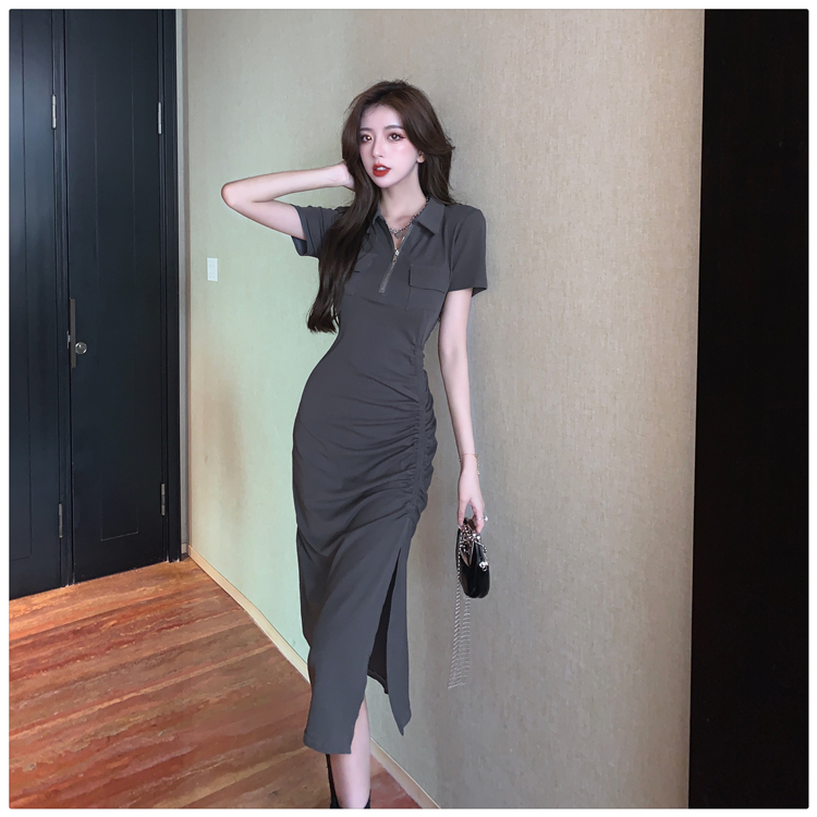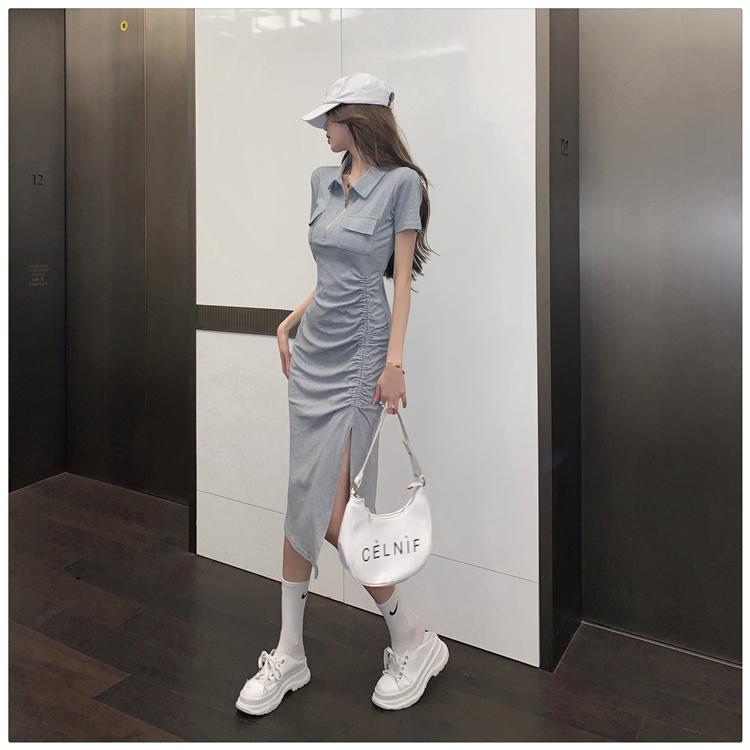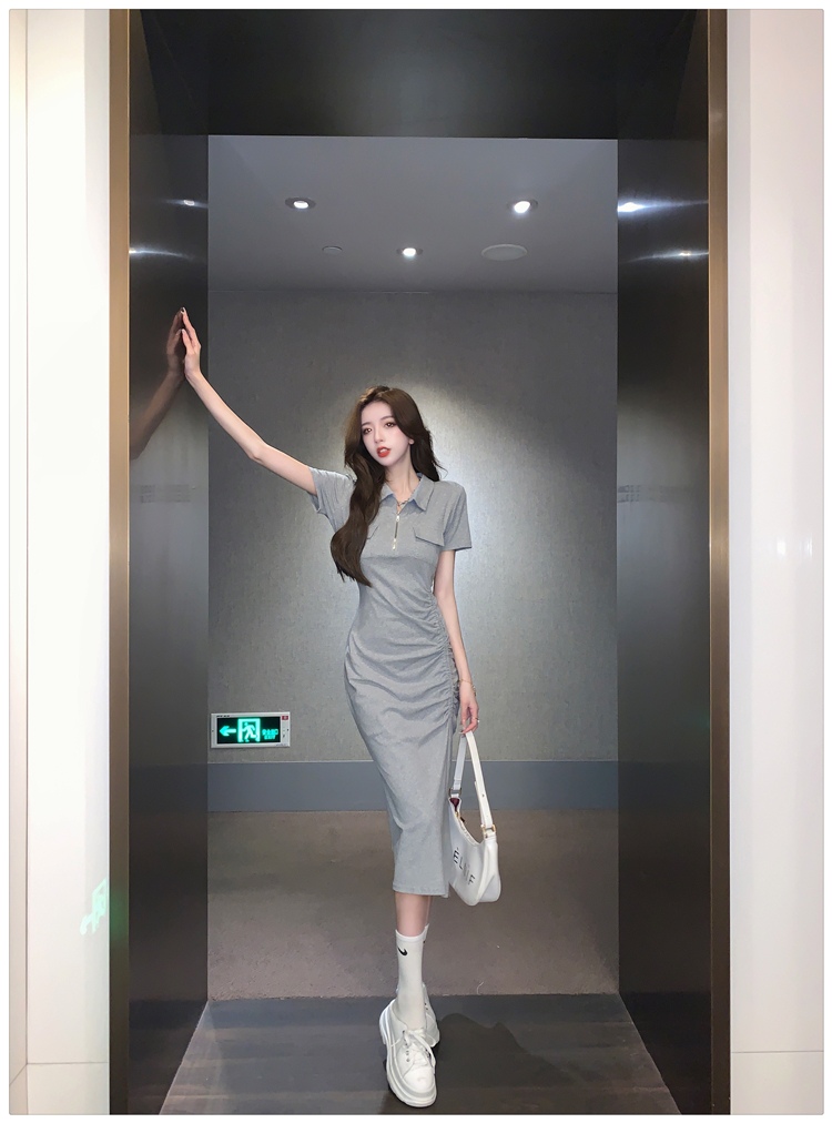 Дизайнерское летнее платье с молнией, сексуальная юбка, тренд сезона, воротник поло, на шнурках, с акцентом на бедрах