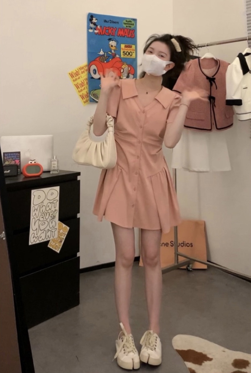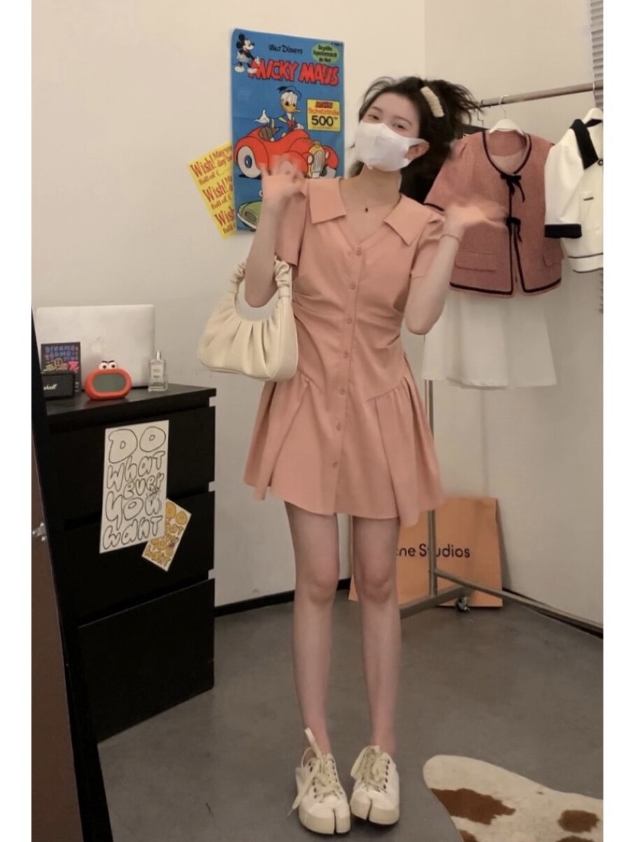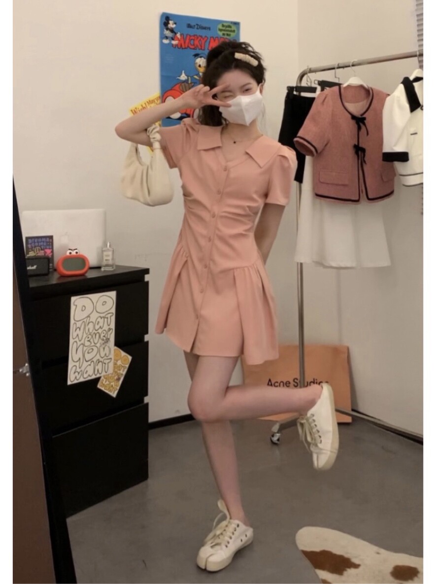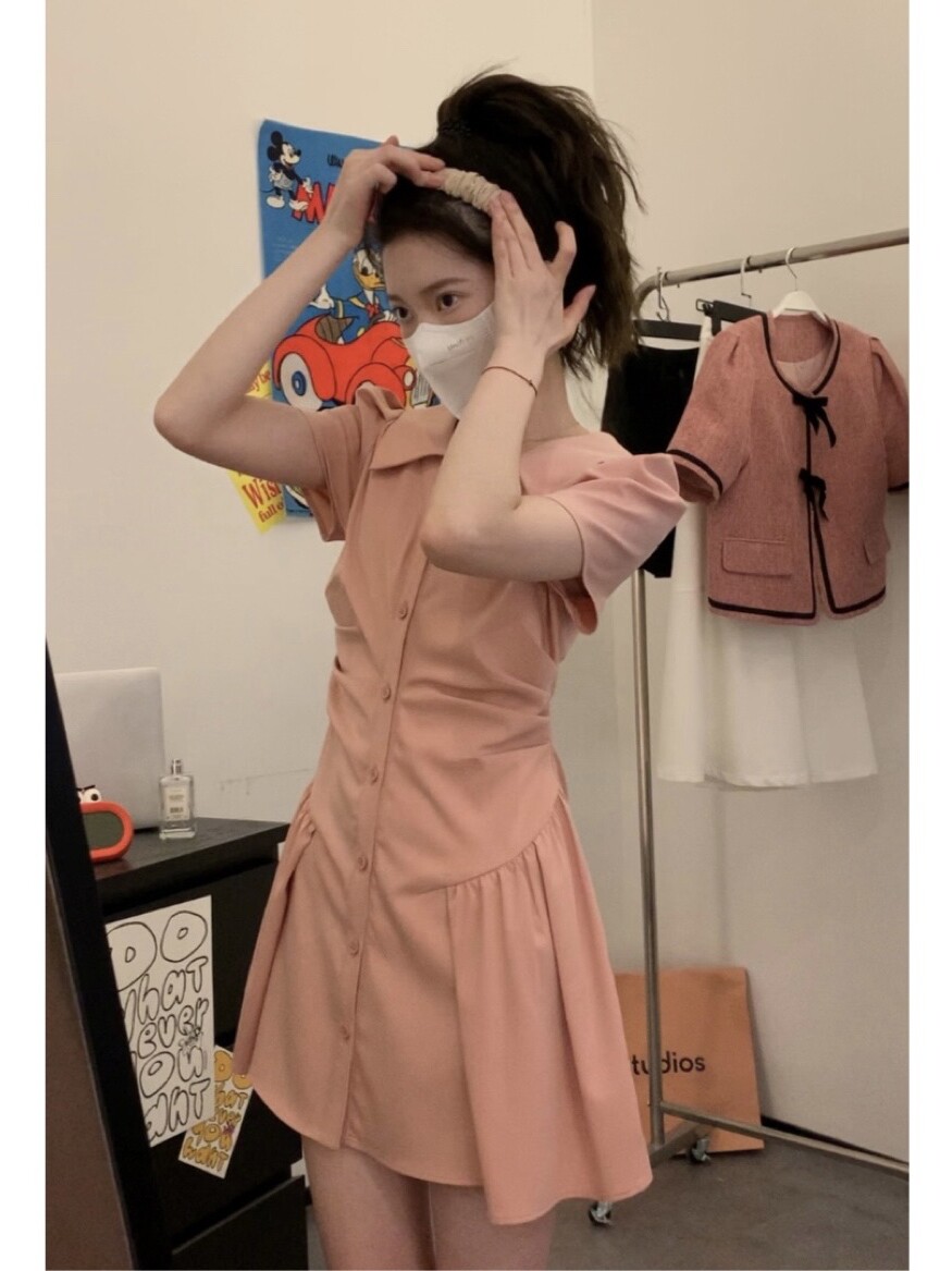 Розовая рубашка, юбка, летнее короткое платье, воротник поло, А-силуэт