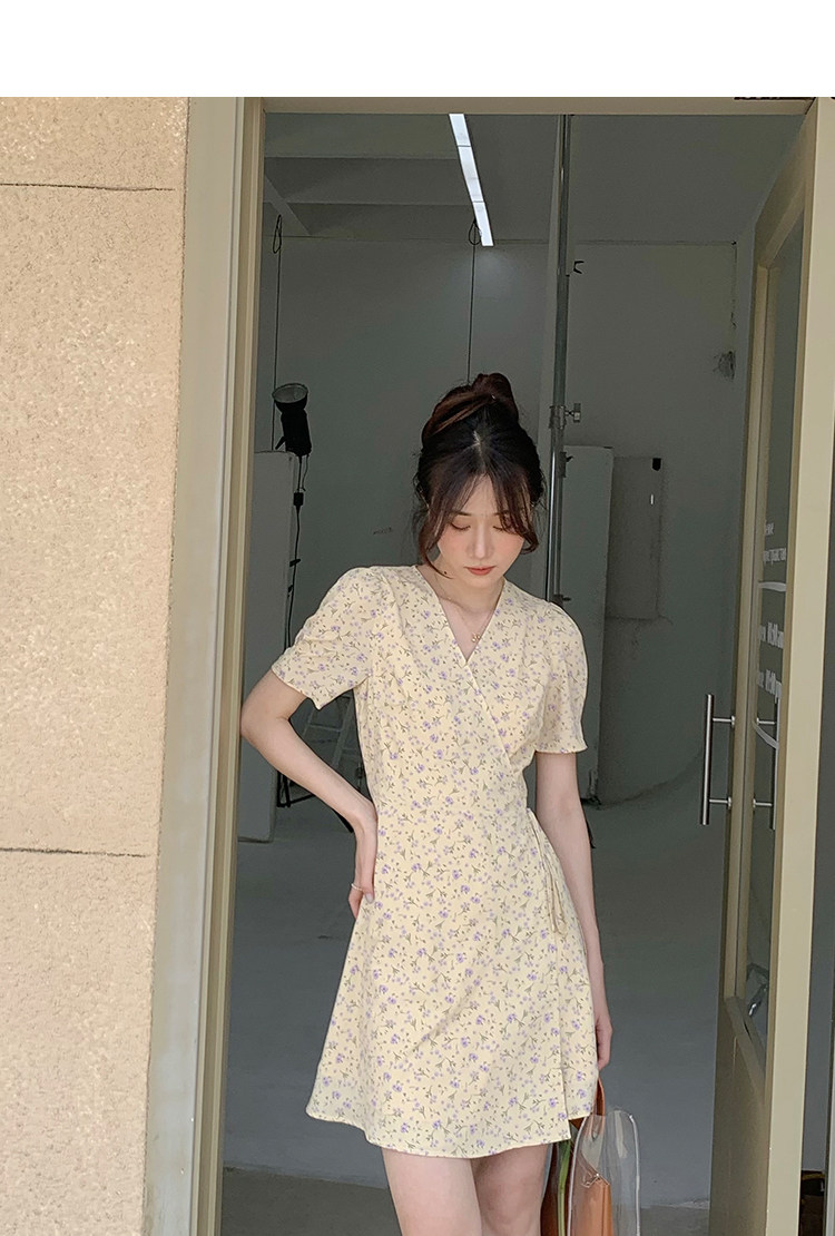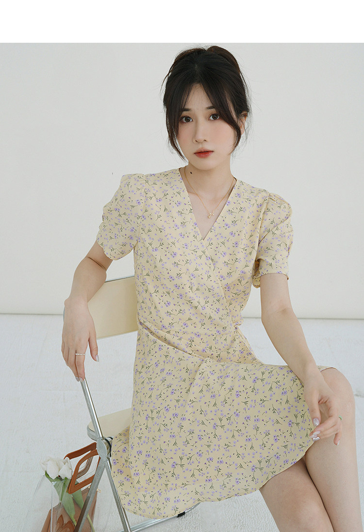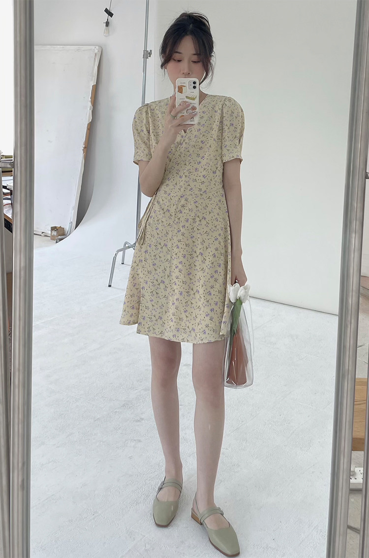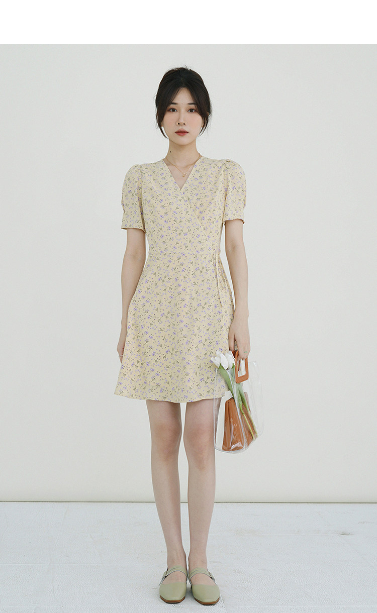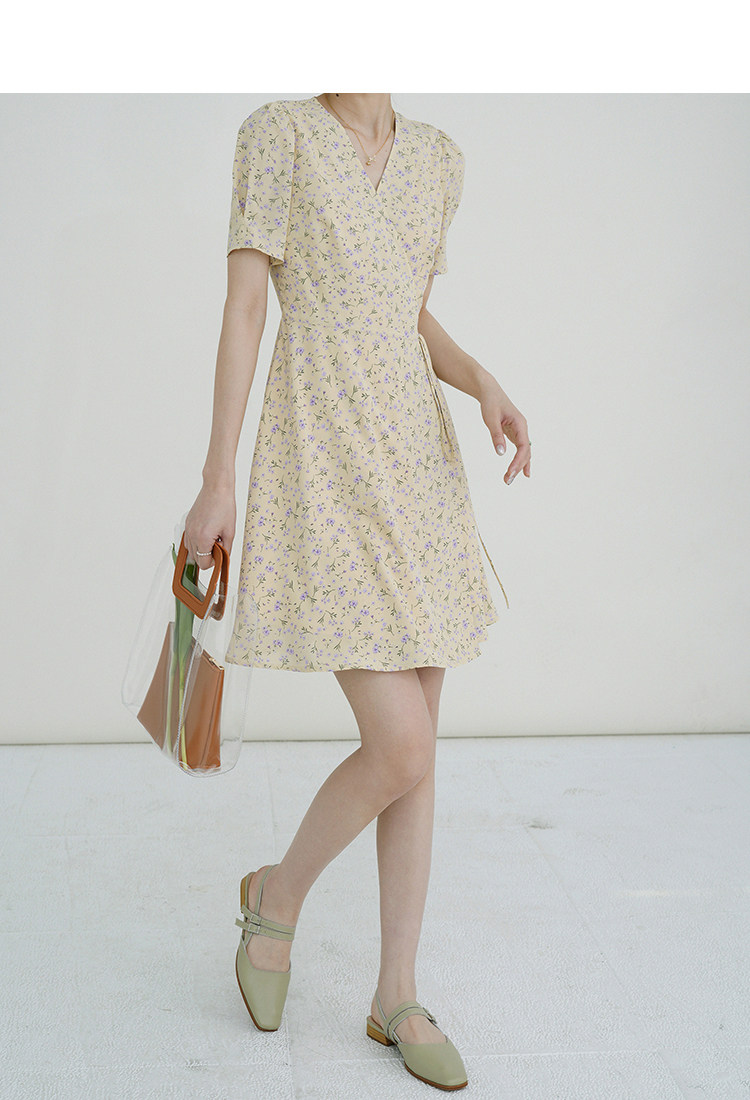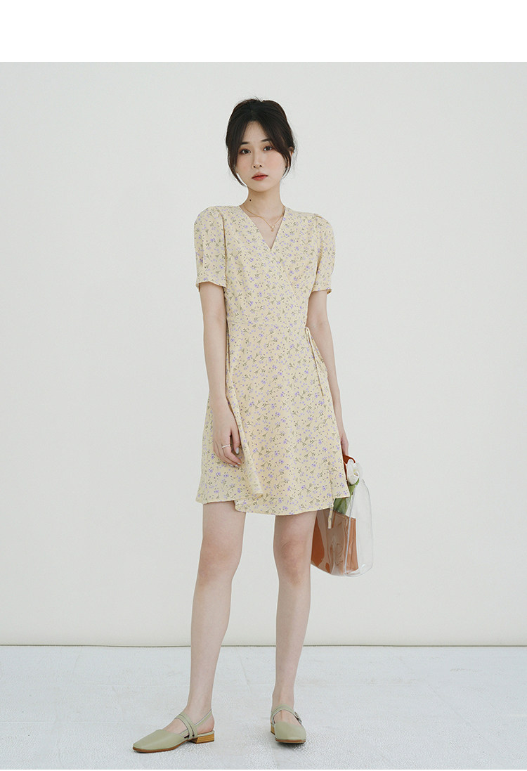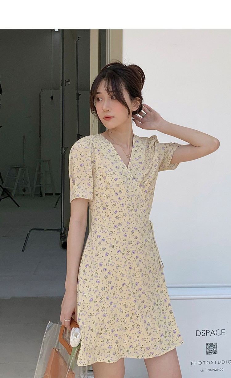 Свежий кремовый желтый ремень, милое летнее платье, V-образный вырез, цветочный принт, короткий рукав, французский стиль