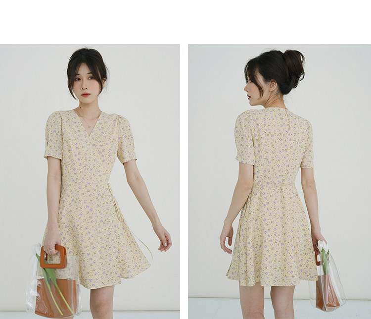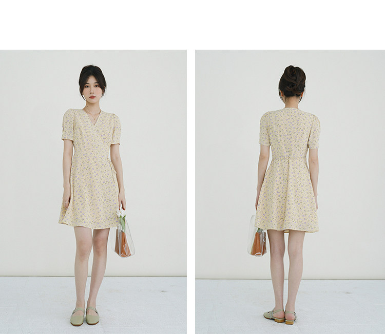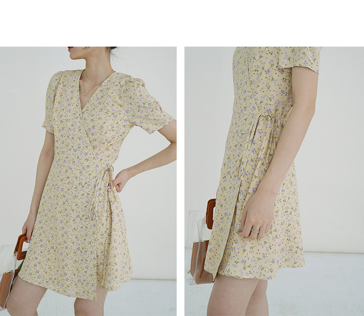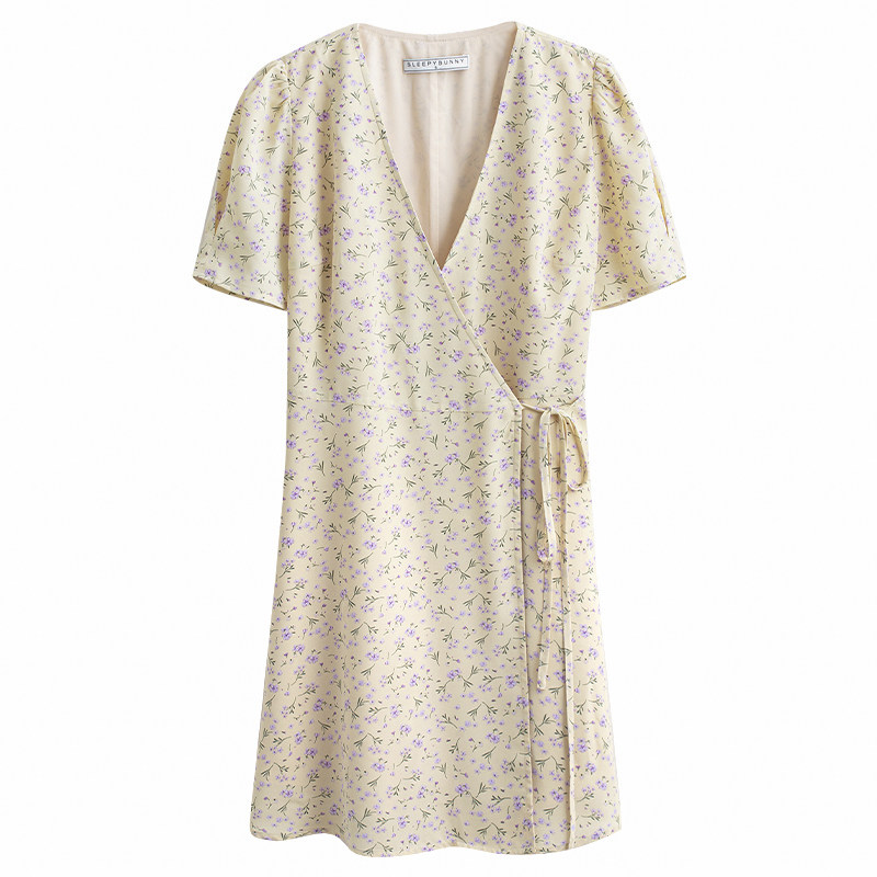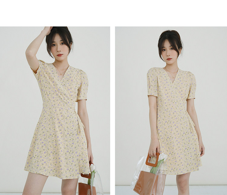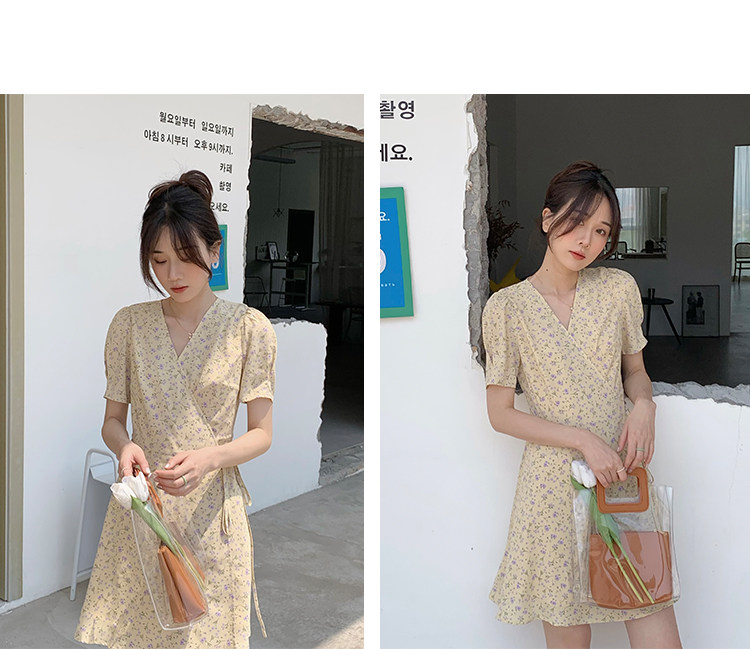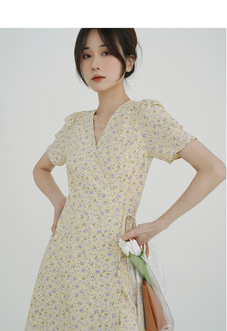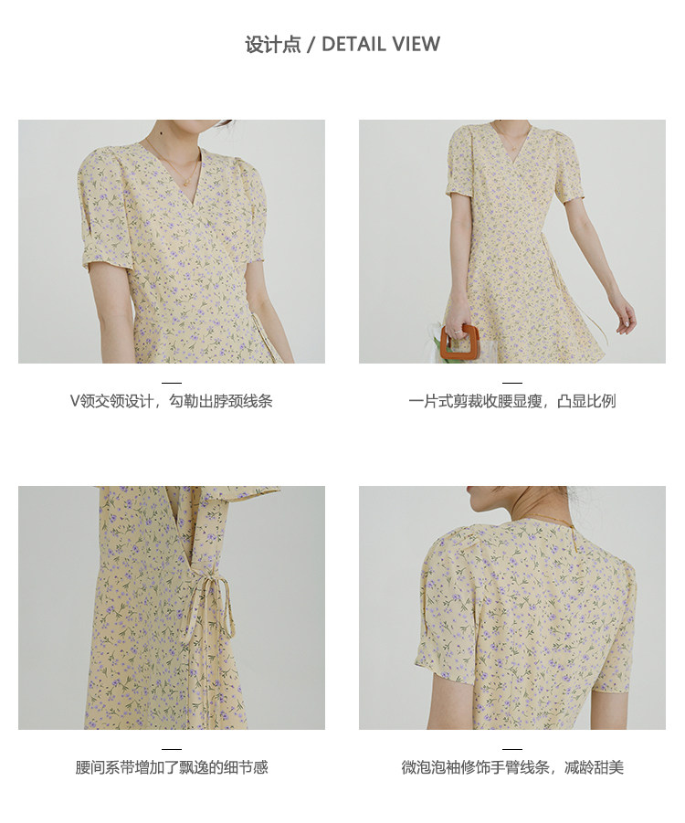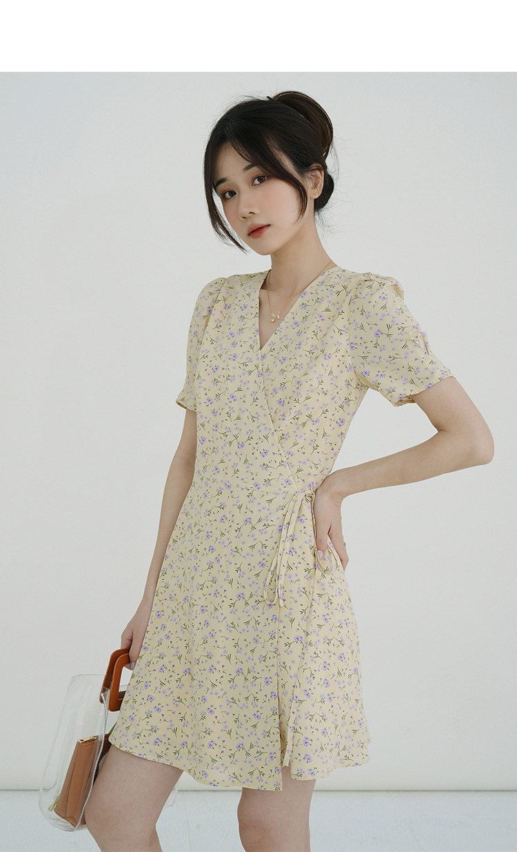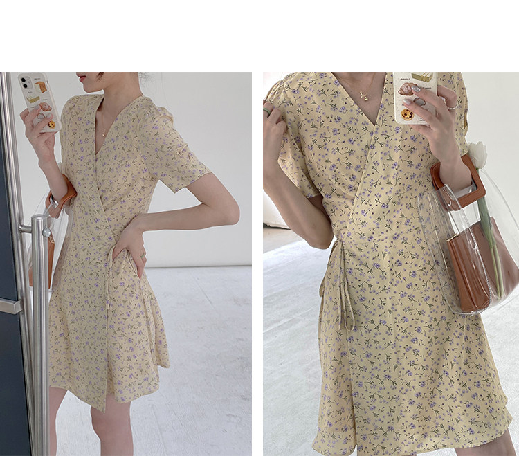 Свежий кремовый желтый ремень, милое летнее платье, V-образный вырез, цветочный принт, короткий рукав, французский стиль
