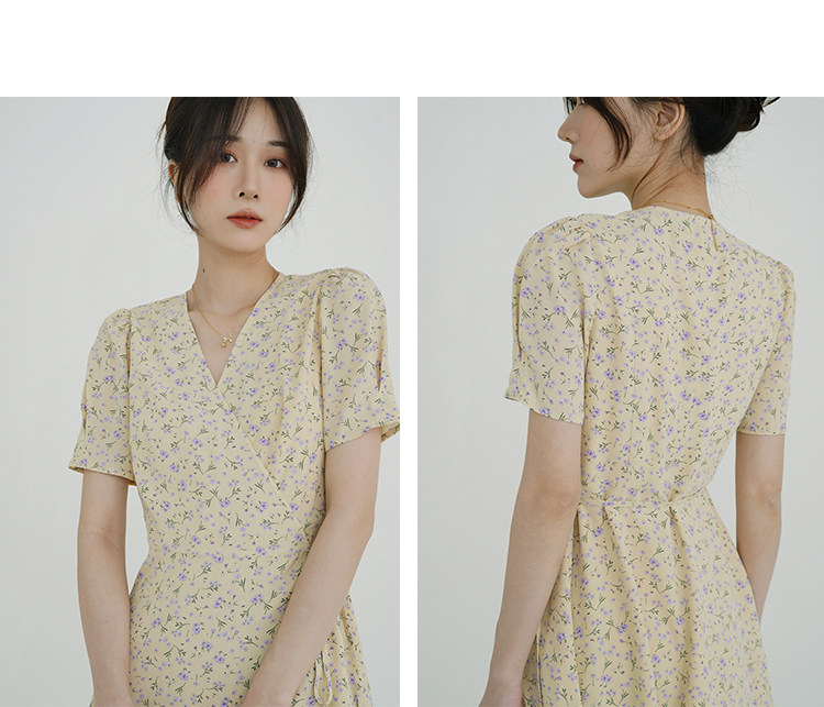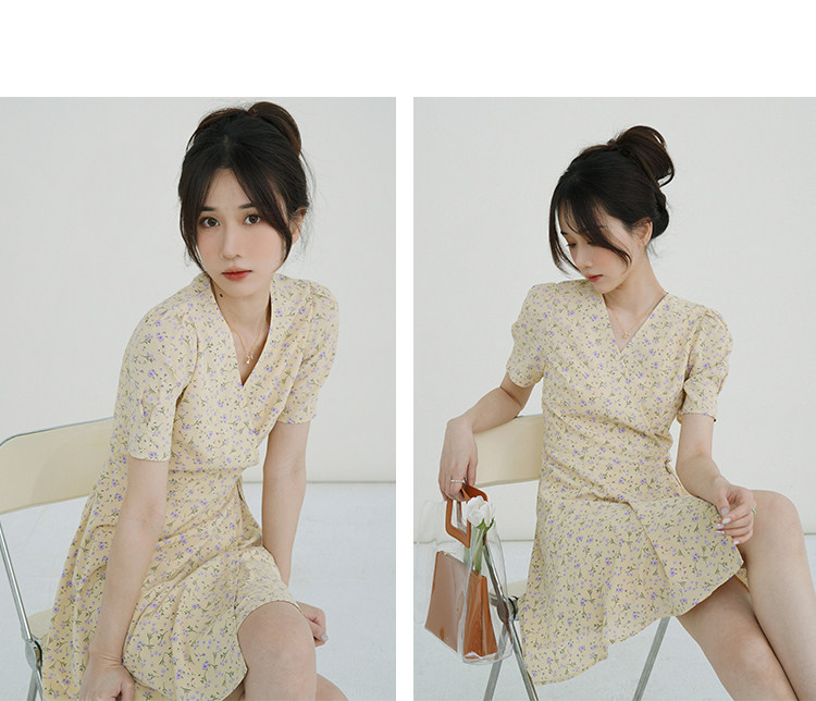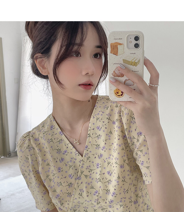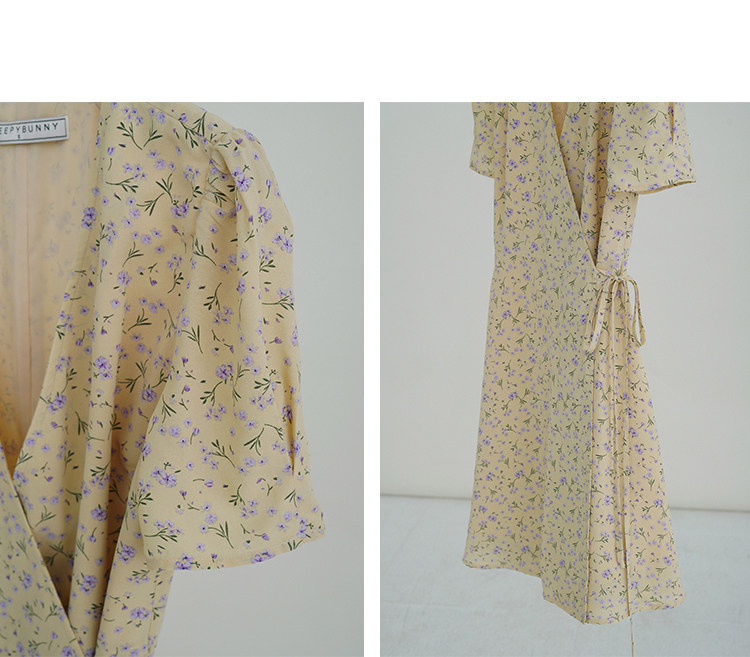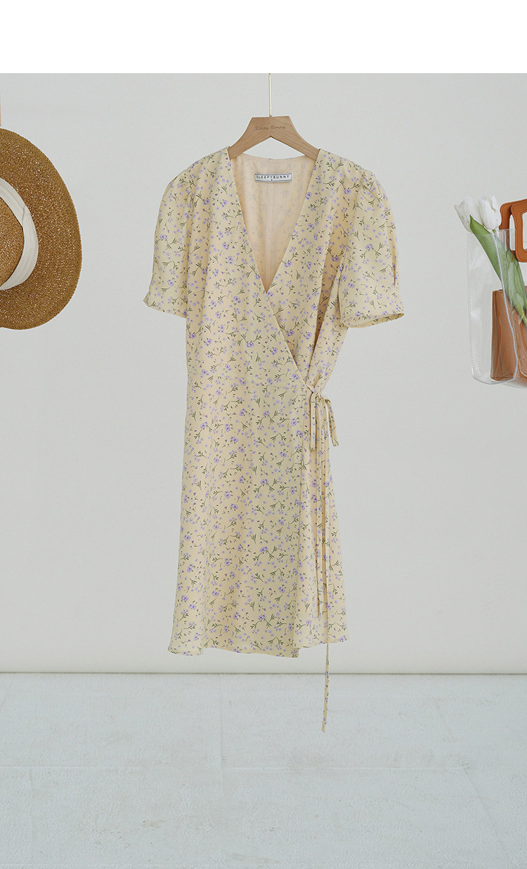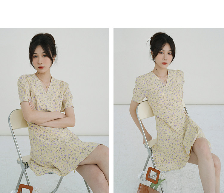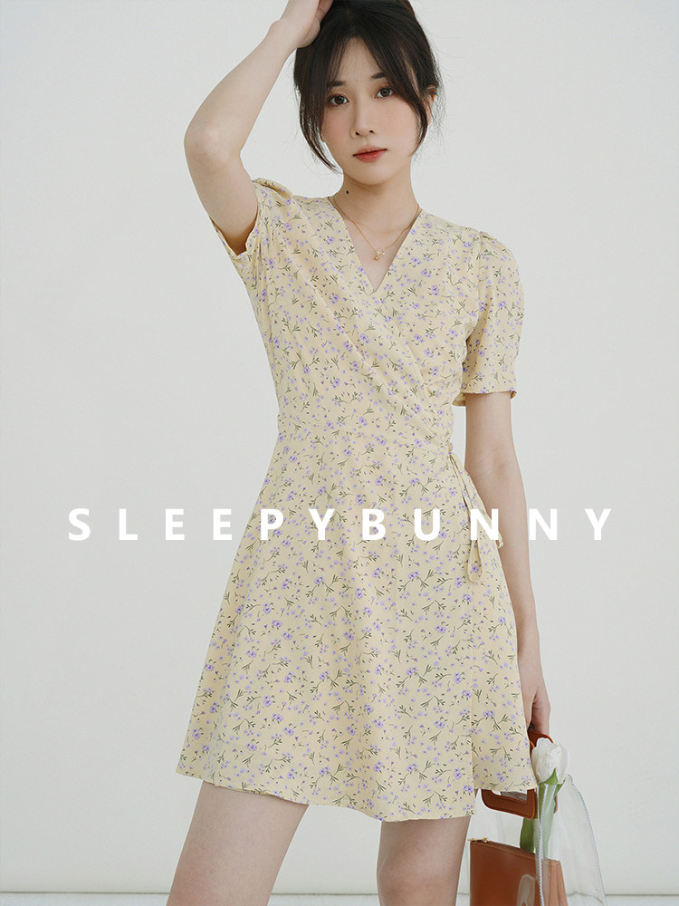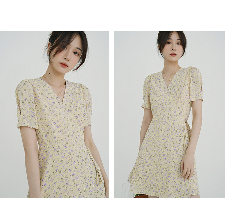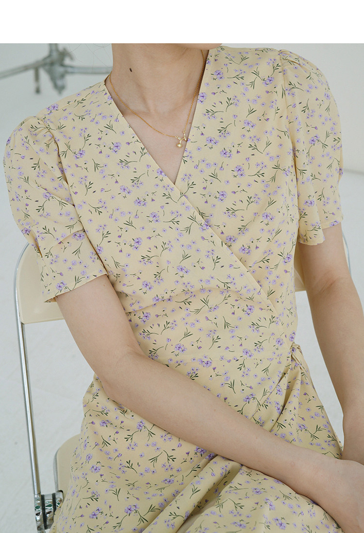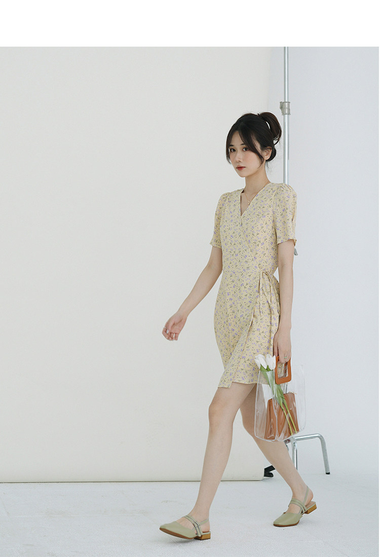 Свежий кремовый желтый ремень, милое летнее платье, V-образный вырез, цветочный принт, короткий рукав, французский стиль