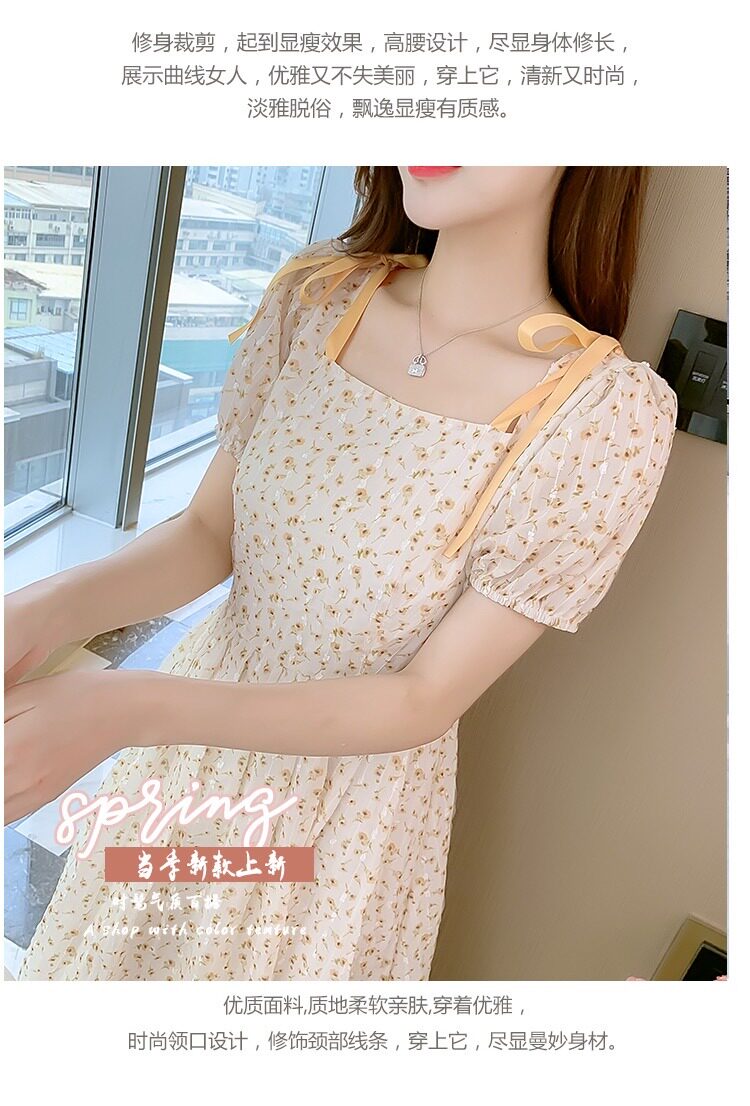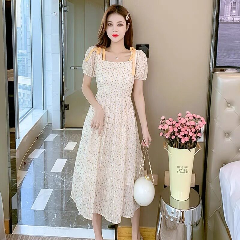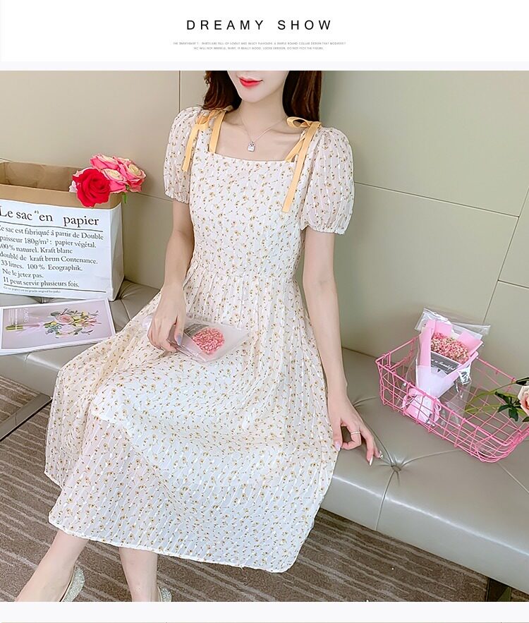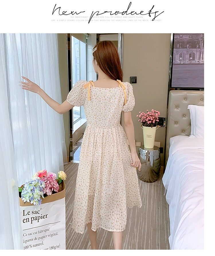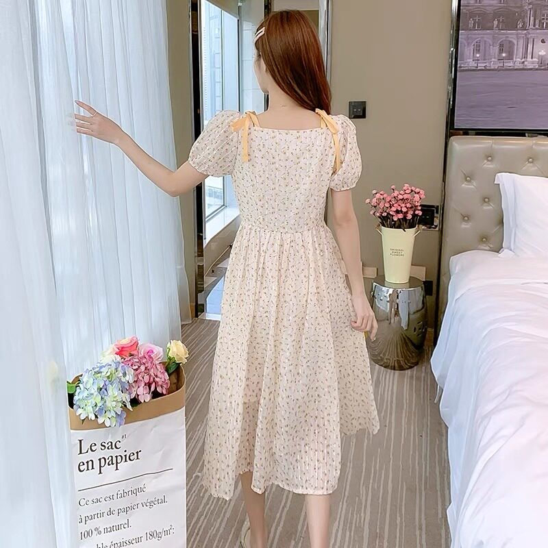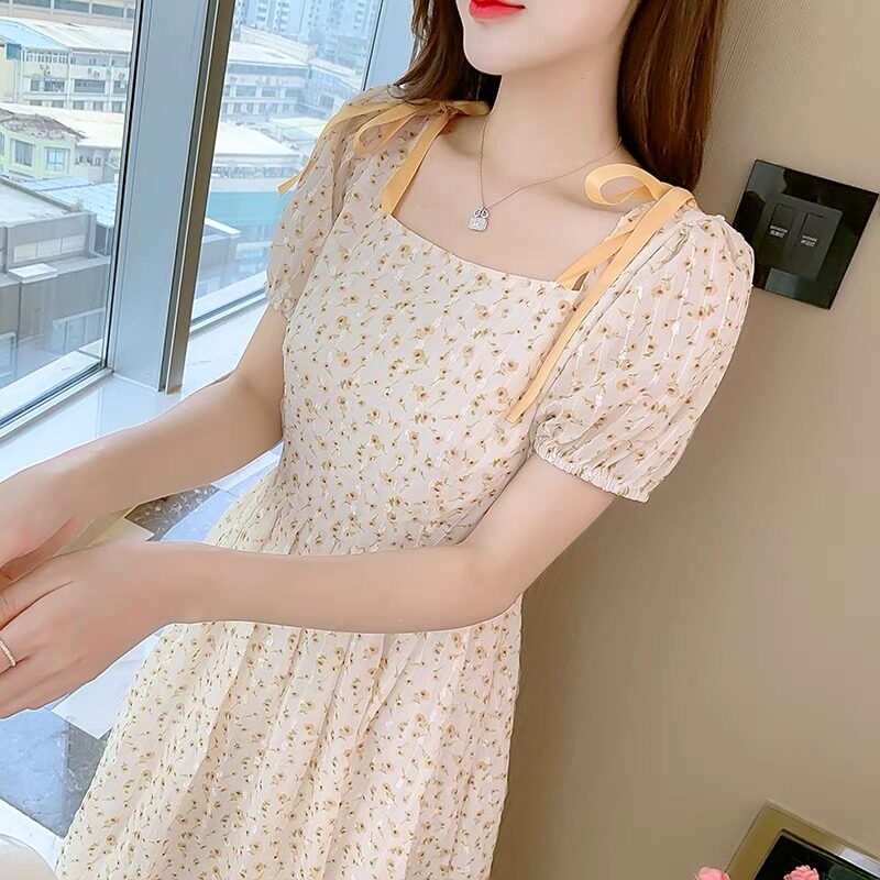 Летнее шифоновое платье, юбка, коллекция 2022, французский стиль, квадратный вырез, в цветочек