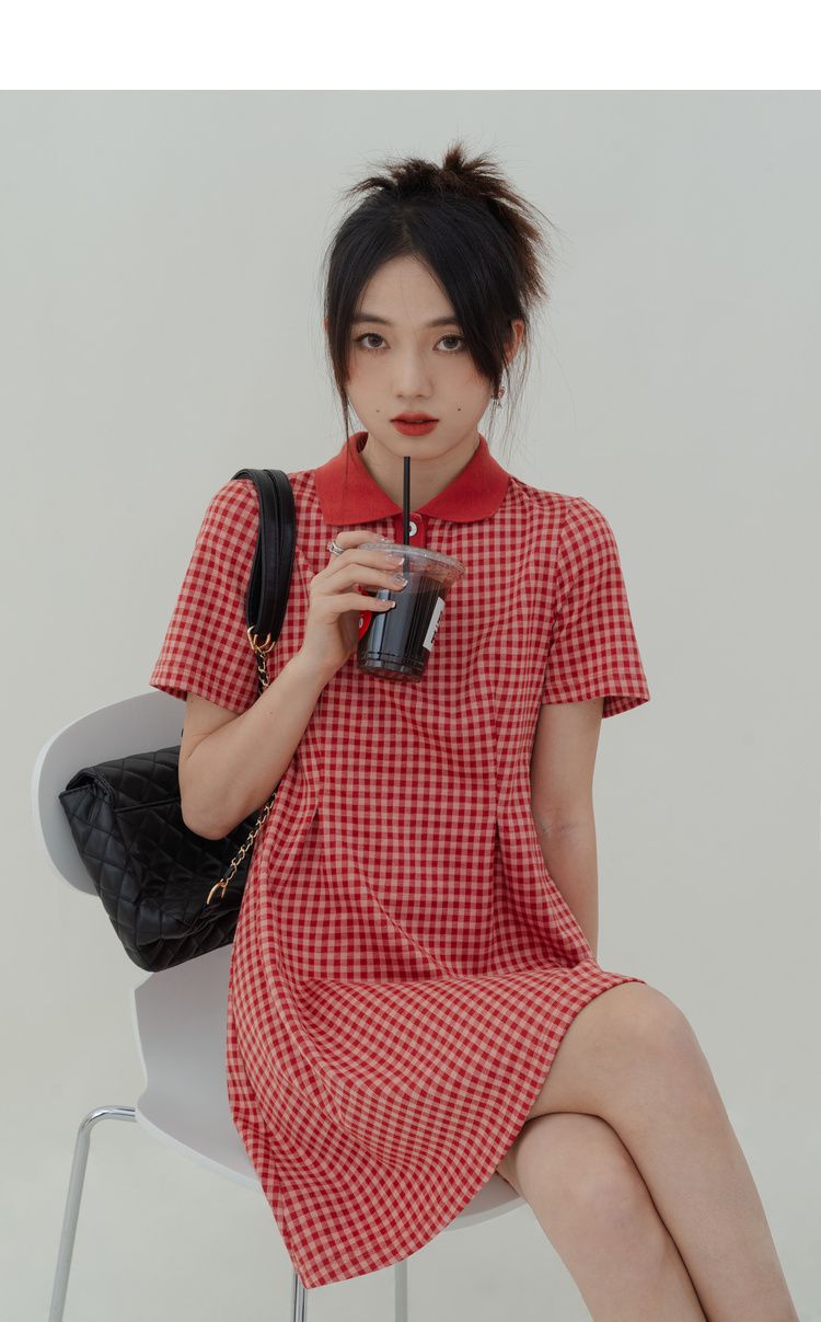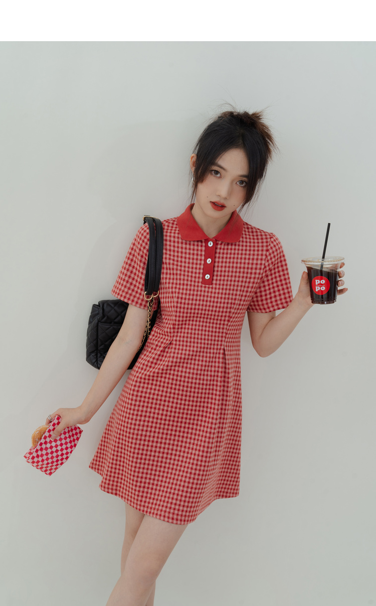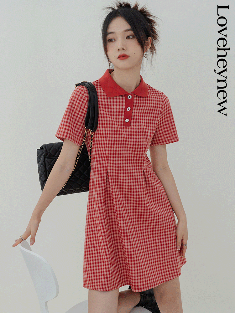 Красное цветное летнее платье, юбка, приталенная рубашка, короткий рукав
