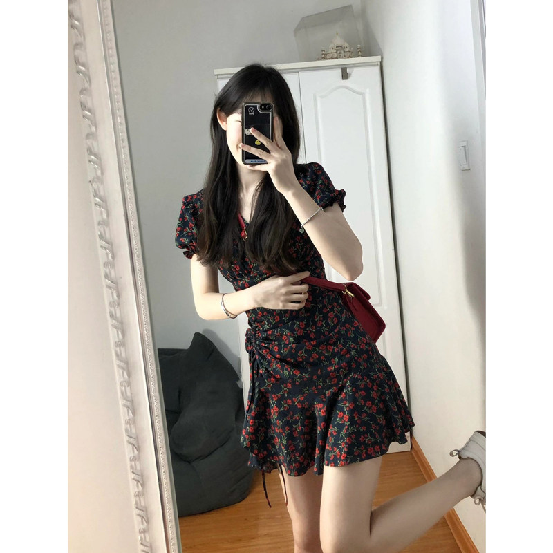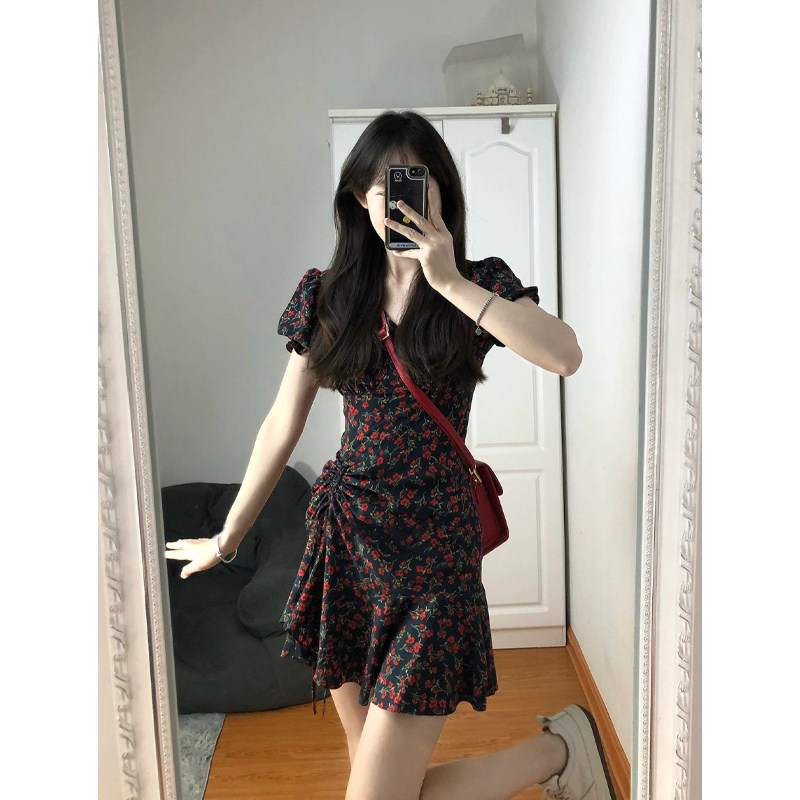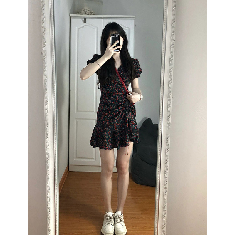 Ретро летнее небольшое платье, дизайнерская мини-юбка, рукава фонарики, V-образный вырез, на шнурках, рыбий хвост