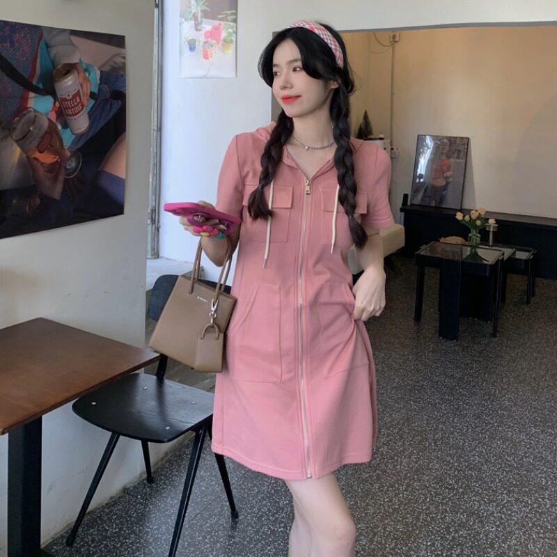 Летнее комфортное платье для отдыха с капюшоном с молнией, большой размер, свободный крой, короткий рукав