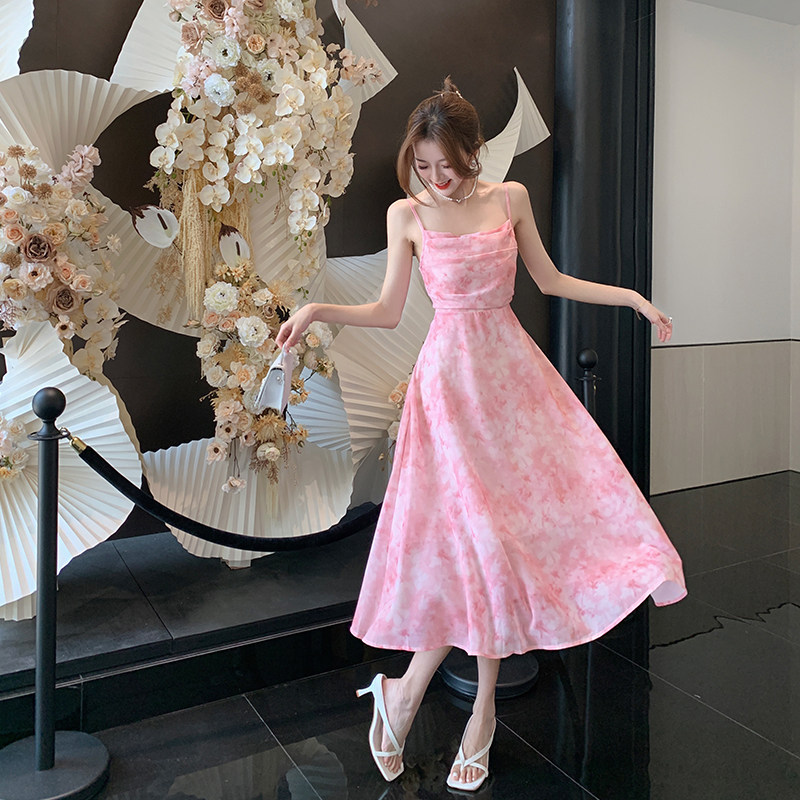 Розовое летнее платье, приталенная весенняя длинная юбка, в цветочек, премиум класс, французский стиль