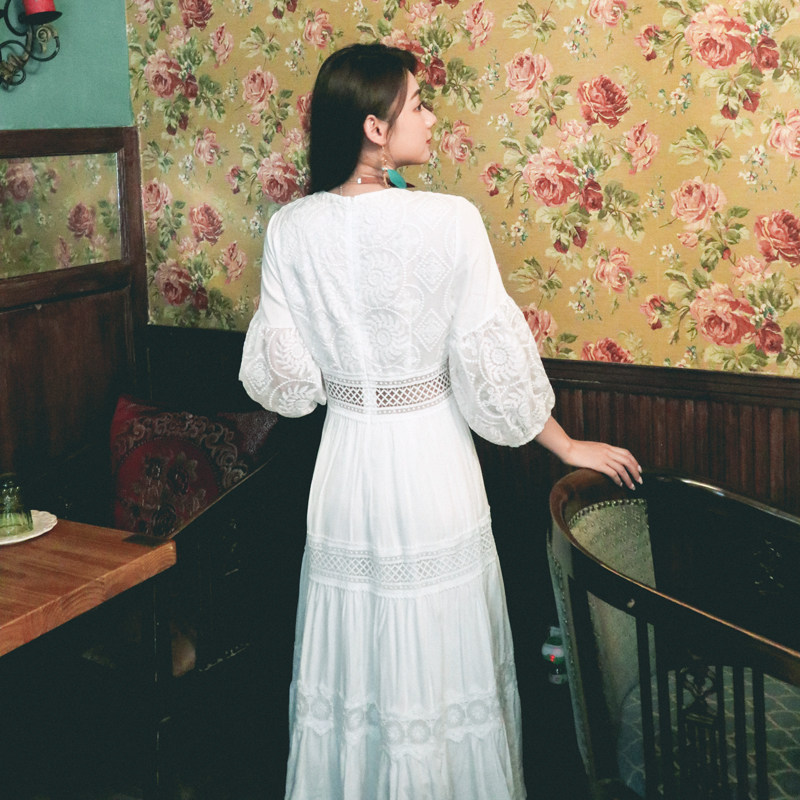 Пляжное платье, белая кружевная длинная юбка, стиль бохо, V-образный вырез, высокая талия, по фигуре, А-силуэт