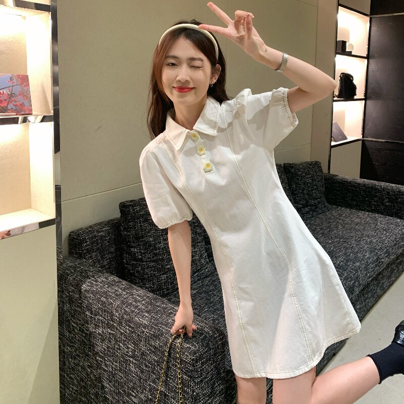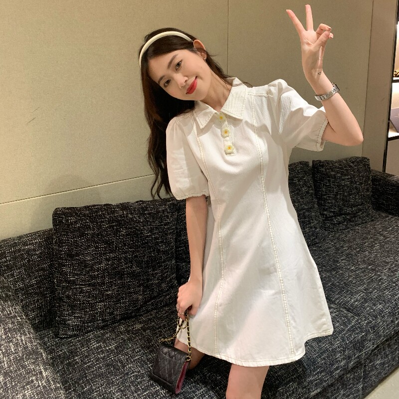 Белое небольшое дизайнерское платье, корсет, юбка, мини-юбка, в цветочек, воротник поло, рукава фонарики