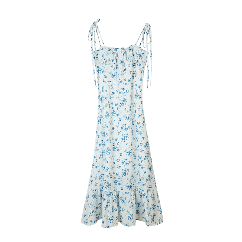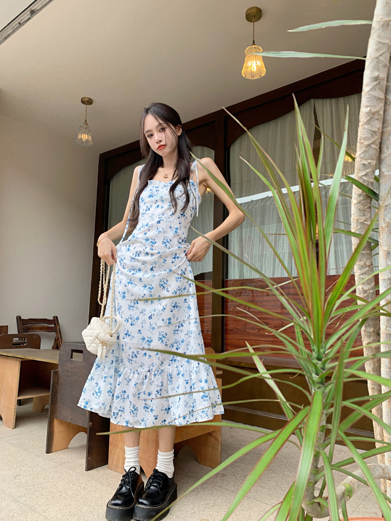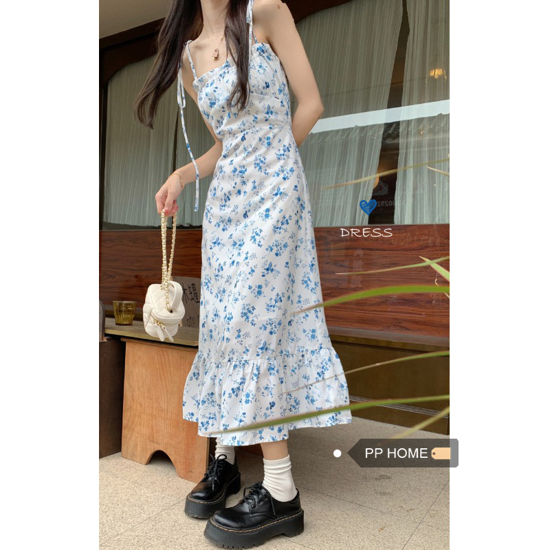 Летнее платье, синяя длинная юбка, французский стиль, эффект подтяжки, в цветочек