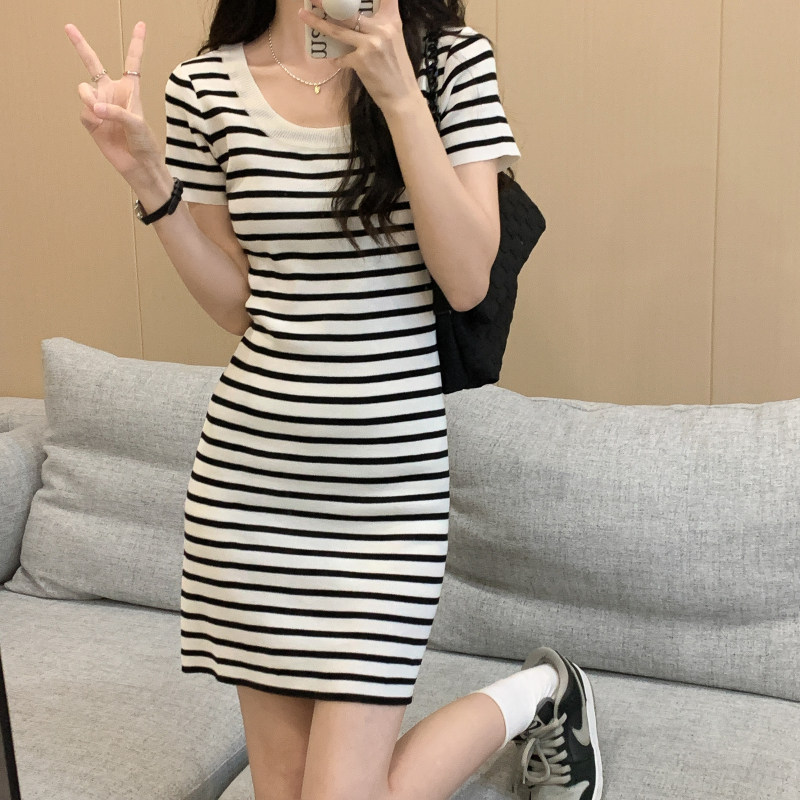 Летнее платье, приталенная юбка, подходит для подростков, коллекция 2023, в корейском стиле, квадратный вырез, короткий рукав, с акцентом на бедрах