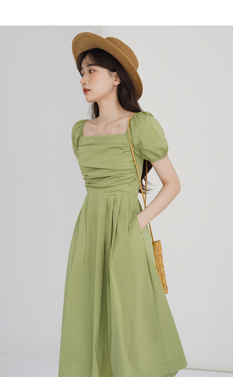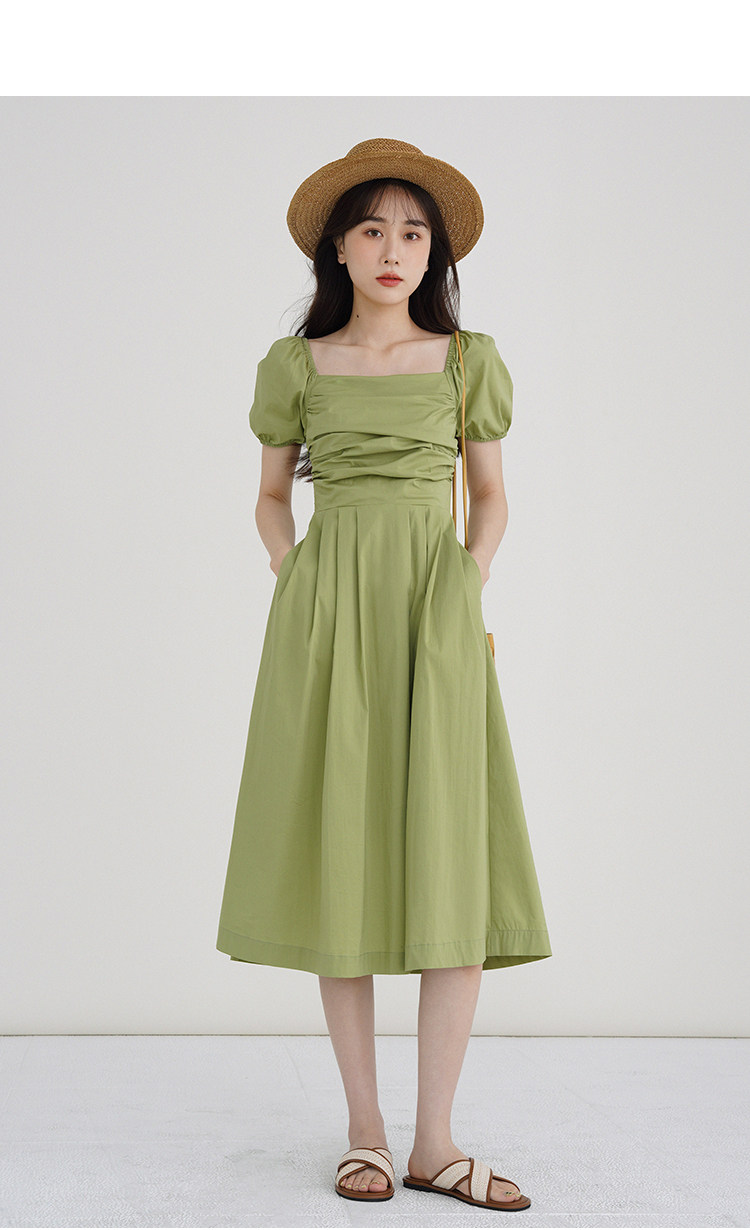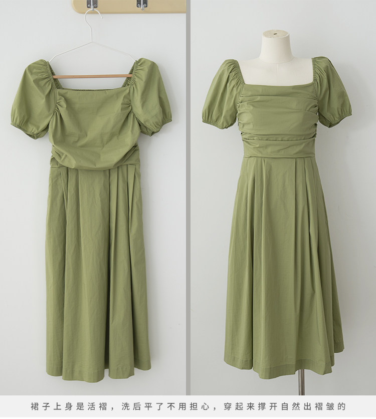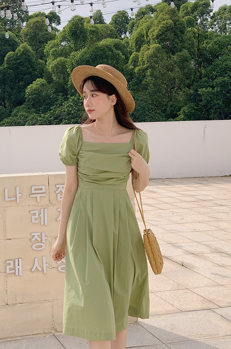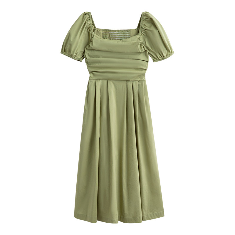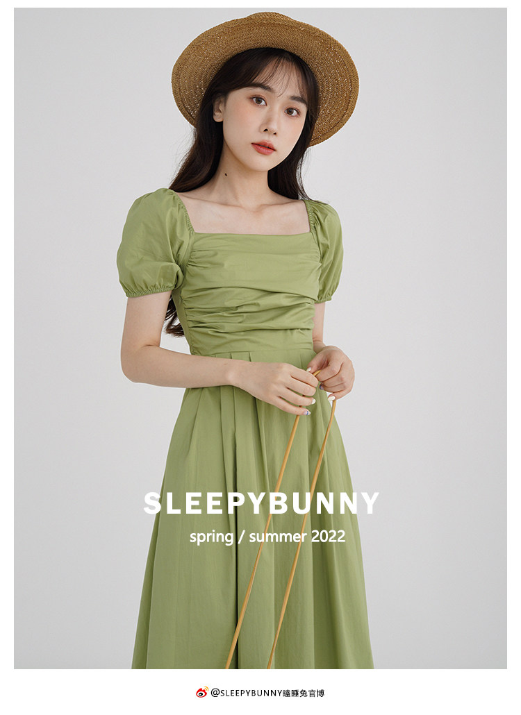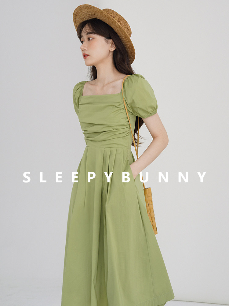 瞌睡兔 Зеленая длинная юбка, квадратный вырез, рукава фонарики, французский стиль