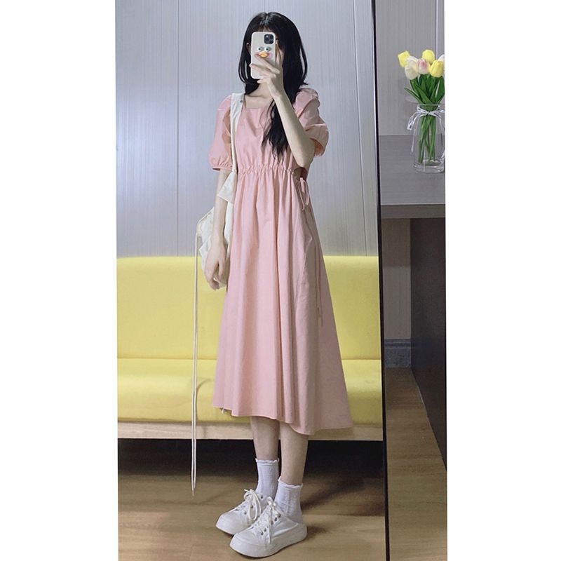 Розовое летнее платье, длинная юбка, квадратный вырез, французский стиль