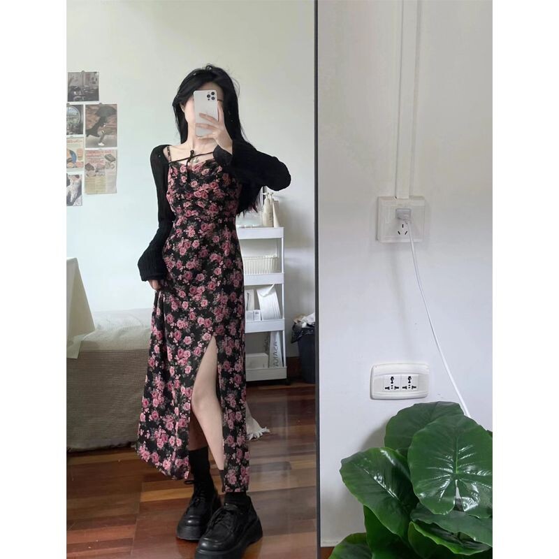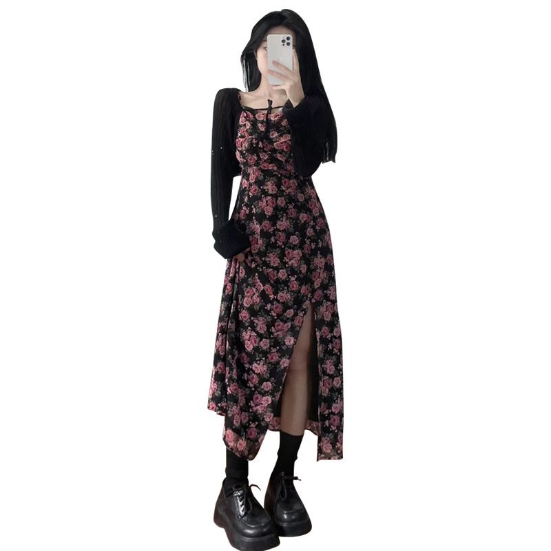 Платье, осенний комплект, цветочный принт, французский стиль, осеннее, по фигуре