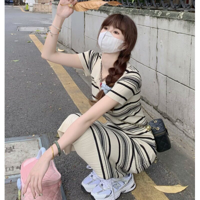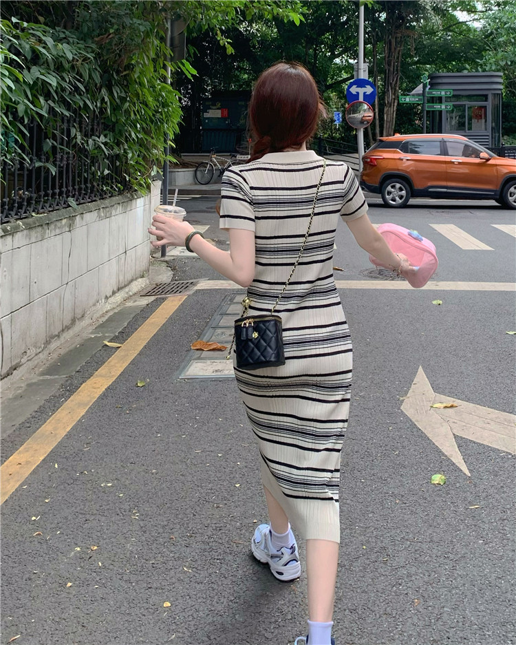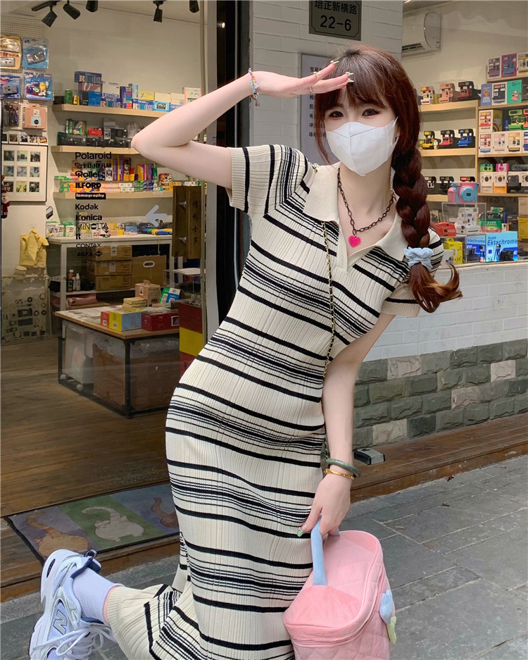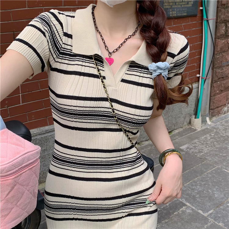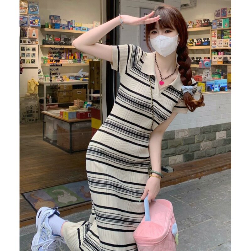 Ретро трикотажное длинное приталенное трикотажное платье, воротник поло, длина макси, короткий рукав, с акцентом на бедрах