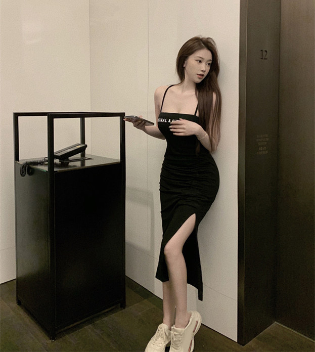 Летнее черное платье, длинная весенняя длинная юбка, изысканный стиль, средней длины, на шнурках