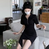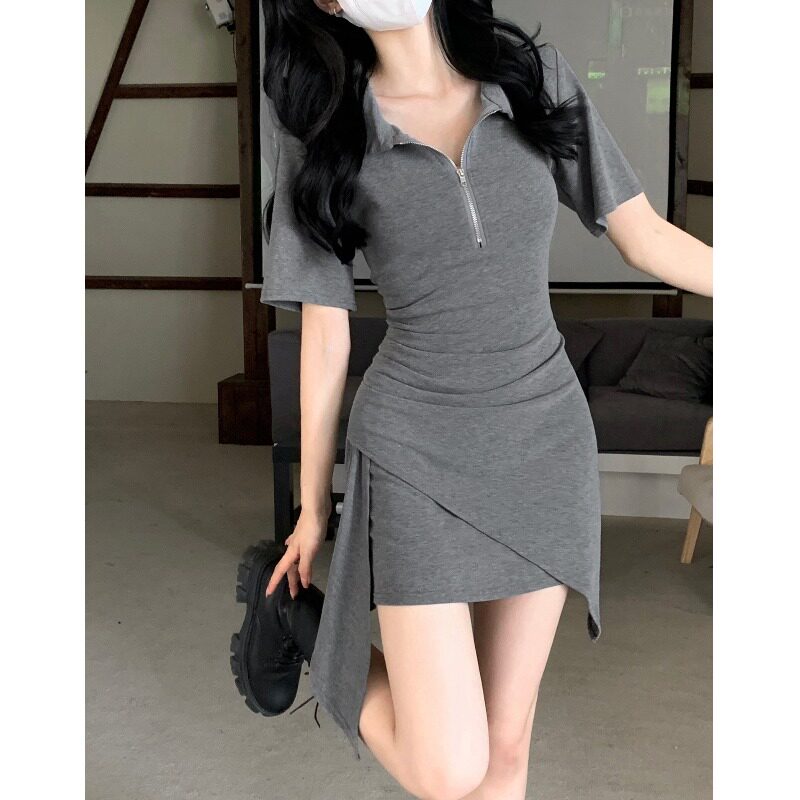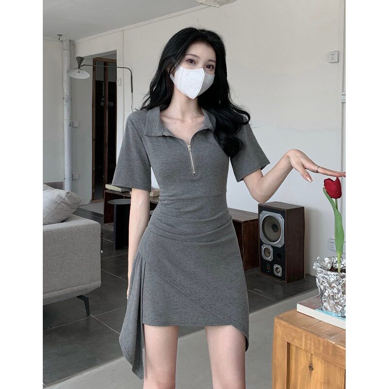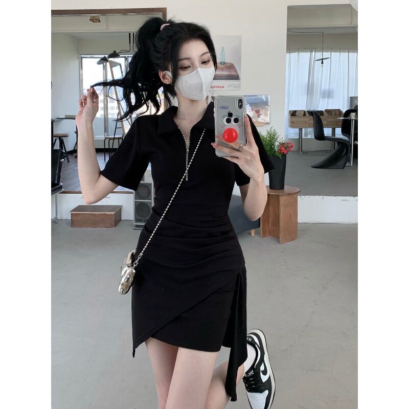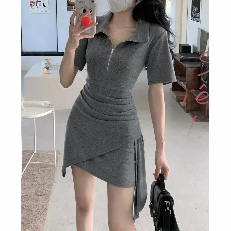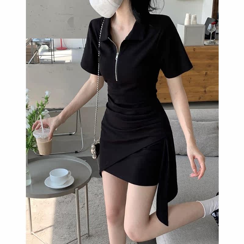 Летнее короткое платье-футболка, платье, юбка, в корейском стиле, воротник поло, высокая талия, с акцентом на бедрах