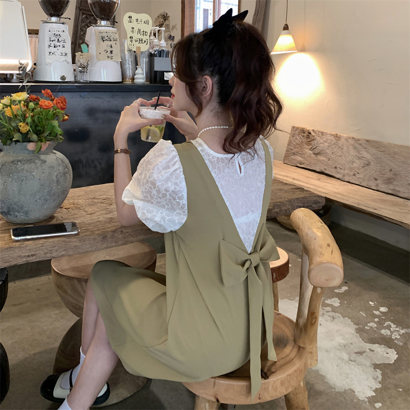 Кружевное летнее платье, юбка, комплект с бантиком, по фигуре, короткий рукав, А-силуэт