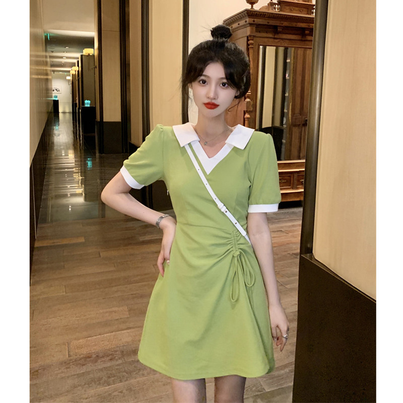 Летнее платье, юбка, приталенный дизайнерский корсет, воротник поло, на шнурках, тренд сезона, короткий рукав, А-силуэт