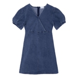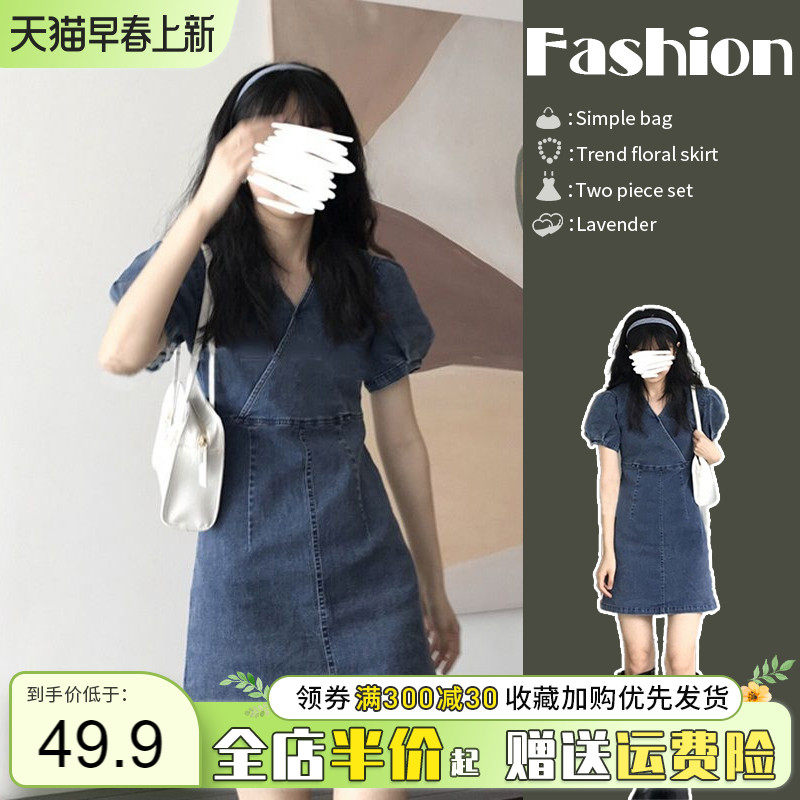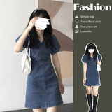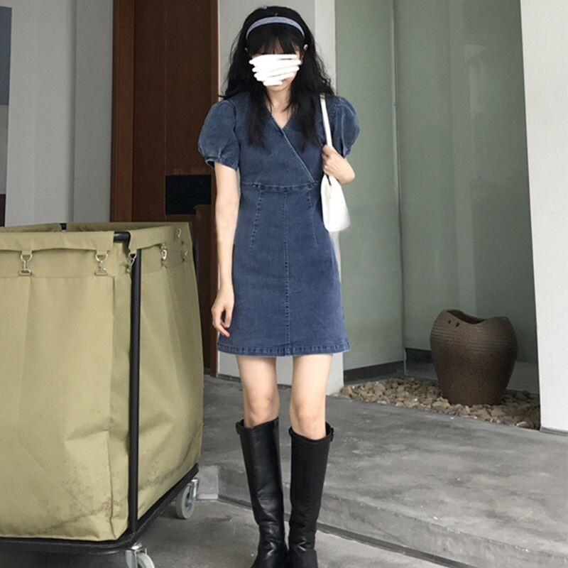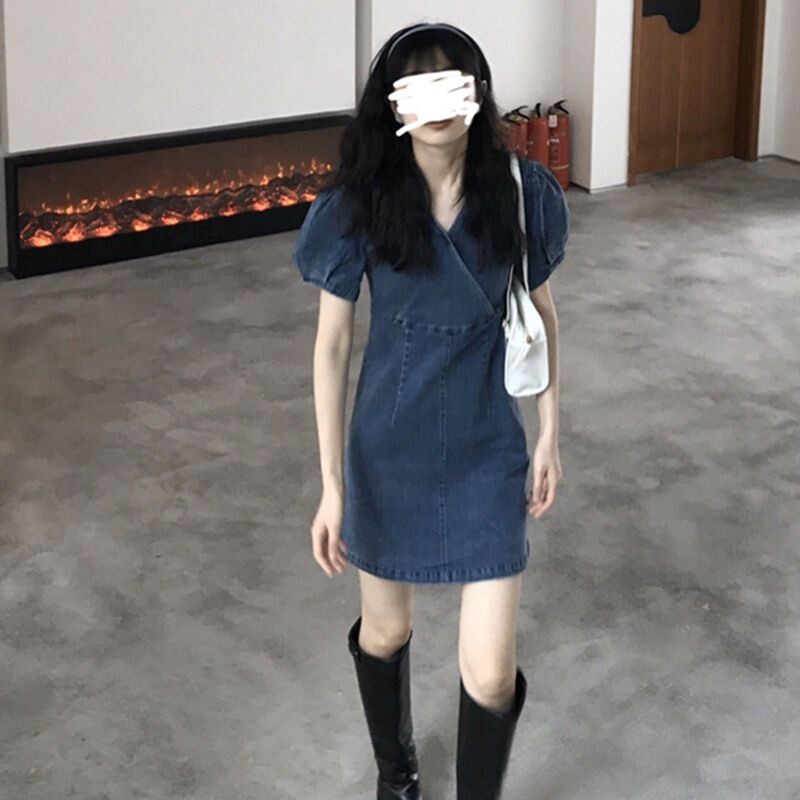 Весенний синий приталенный корсет, летняя джинсовая юбка, платье, рукава фонарики, А-силуэт, V-образный вырез