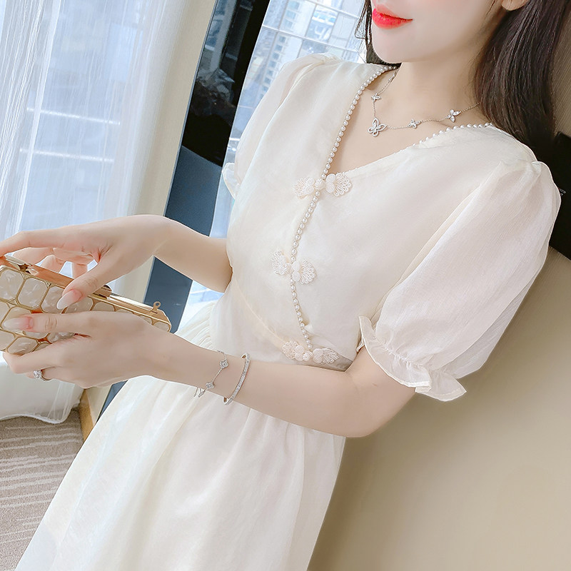 Легкое ципао, платье, летняя одежда, шифоновая длинная юбка, светлый стиль, V-образный вырез, коллекция 2022, городской стиль, средней длины