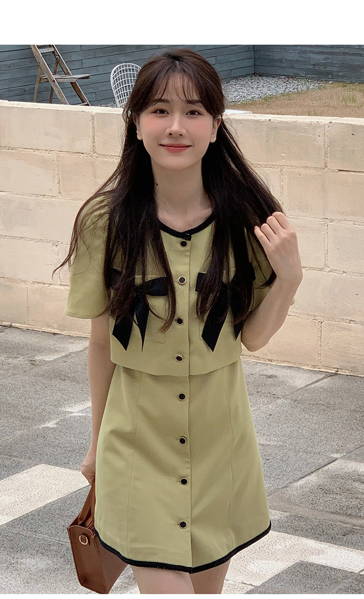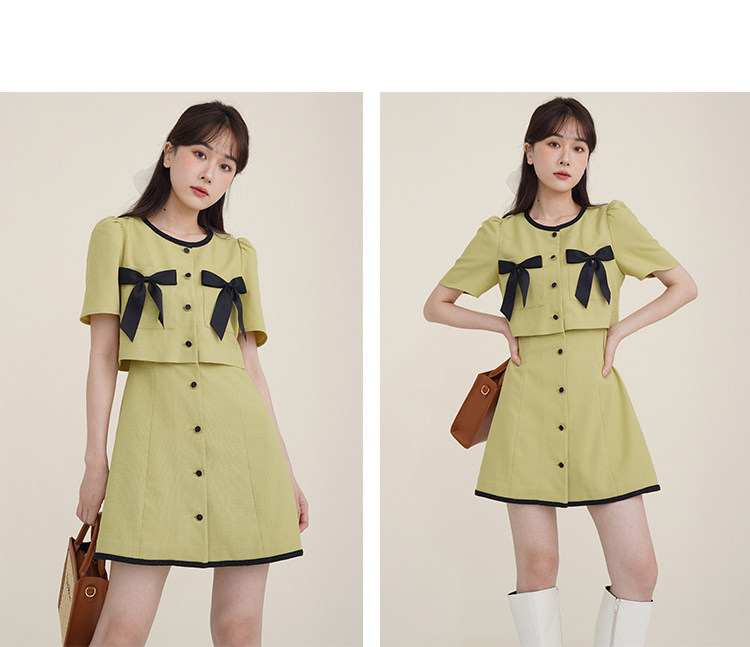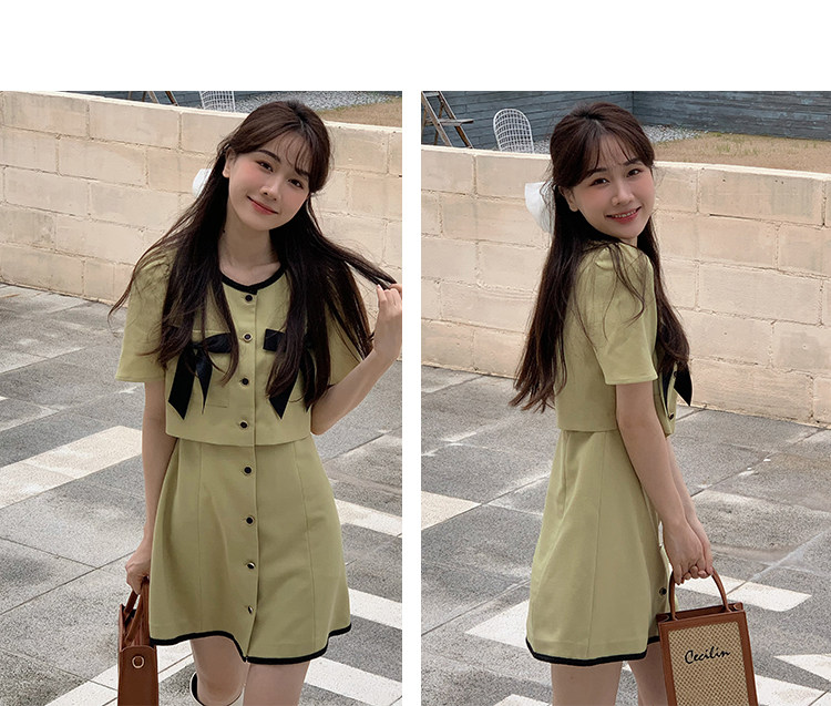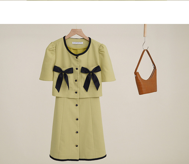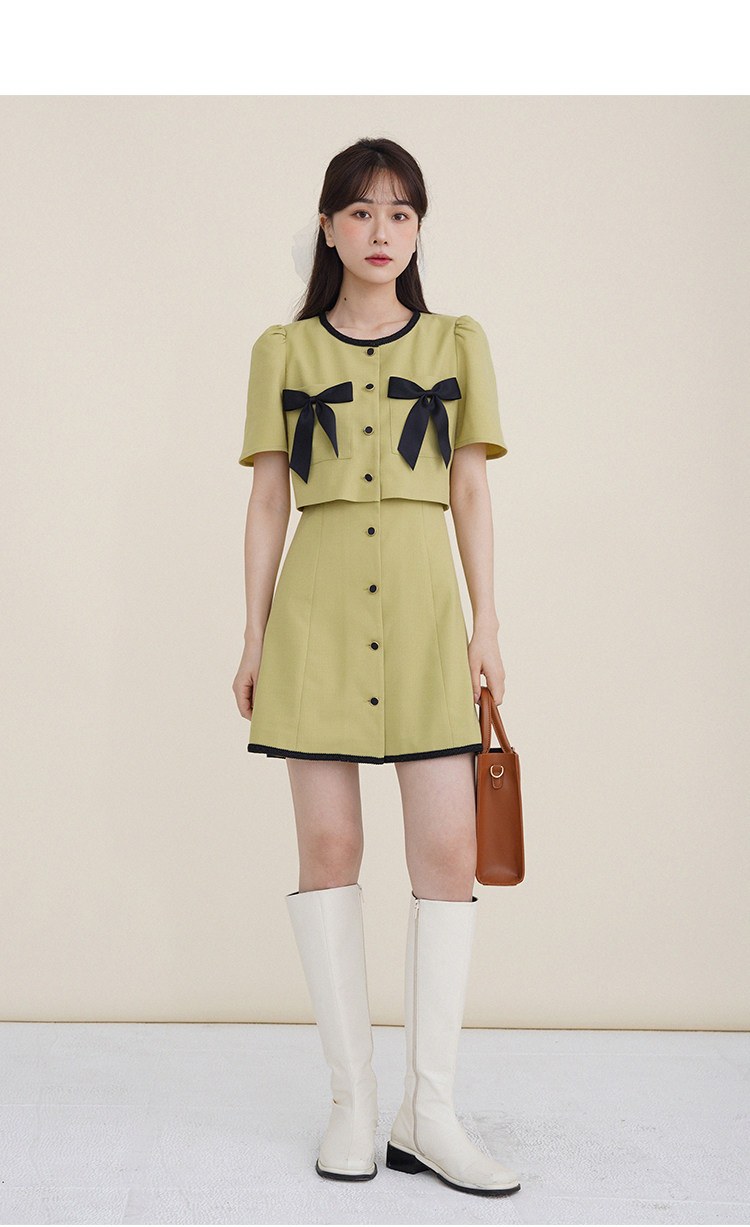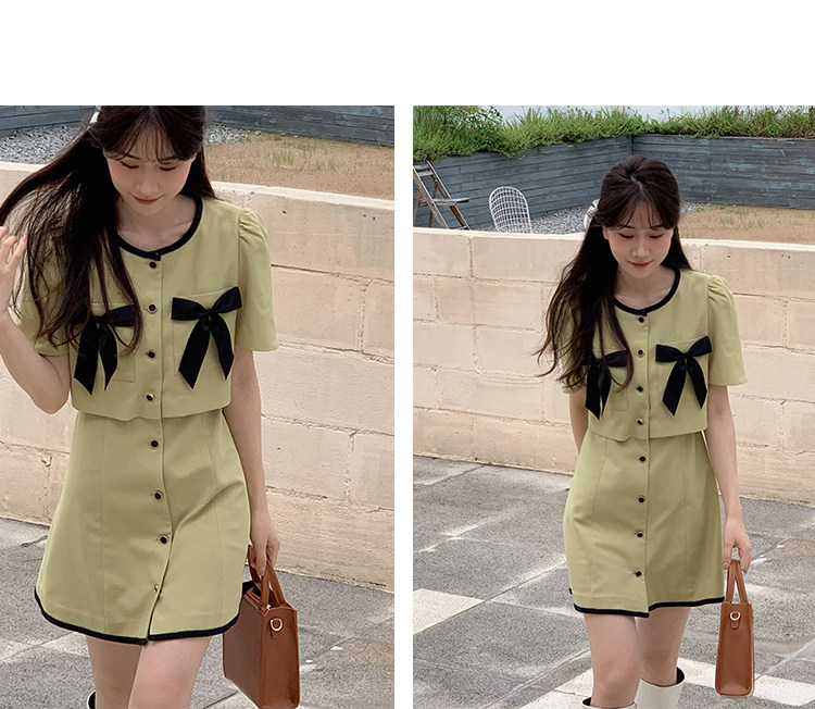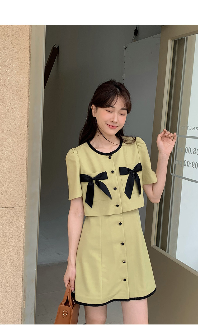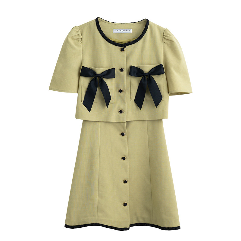 Комплект, милое изысканное платье с круглым воротником, мини-юбка с бантиком, в стиле Шанель, короткий рукав