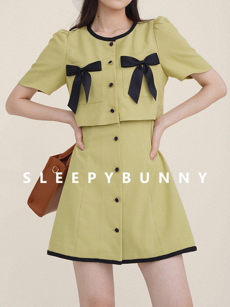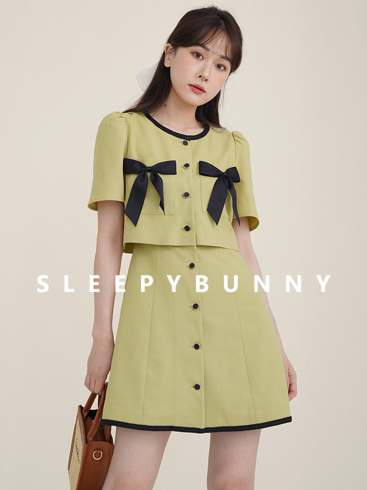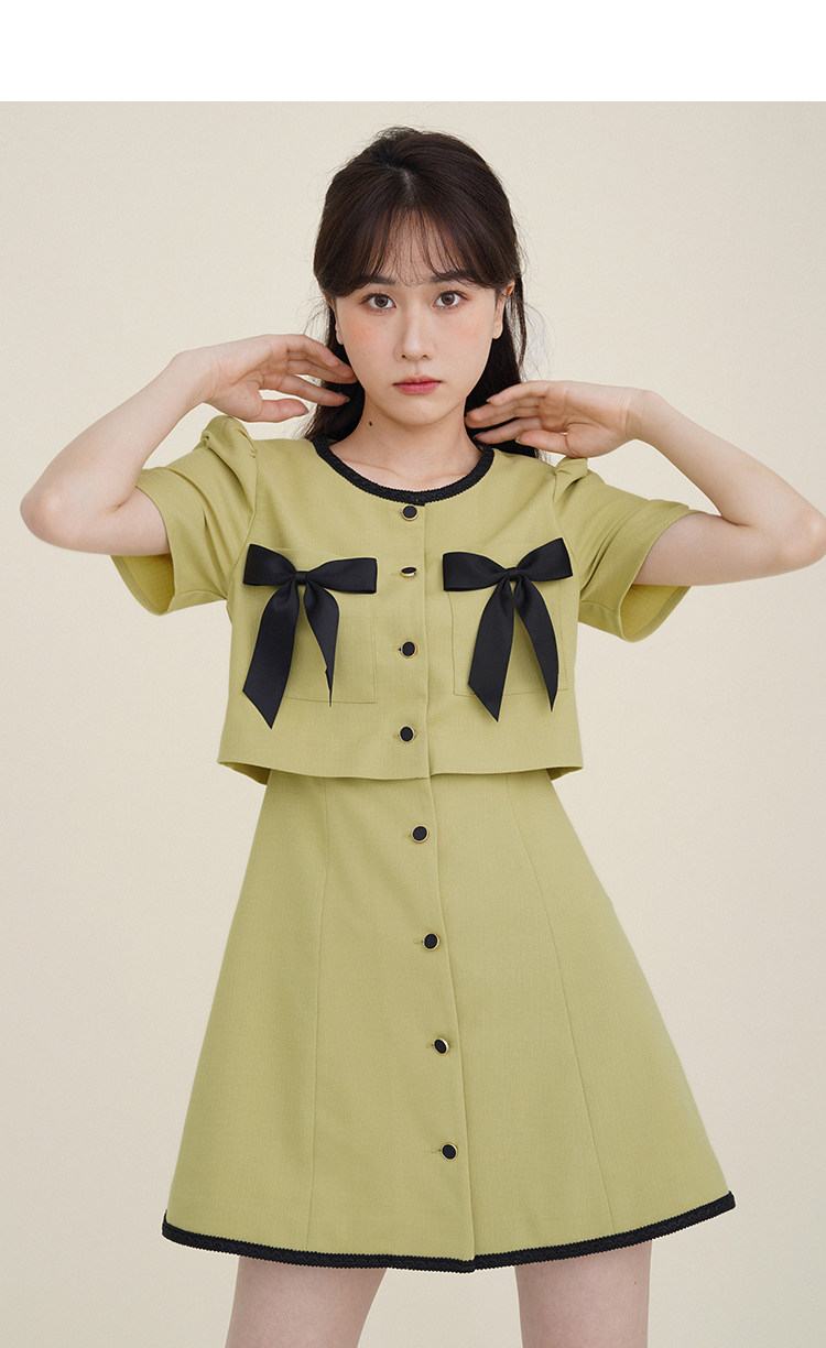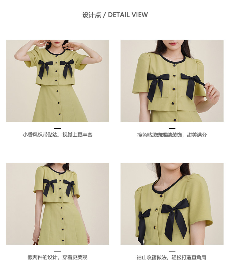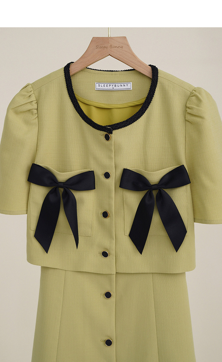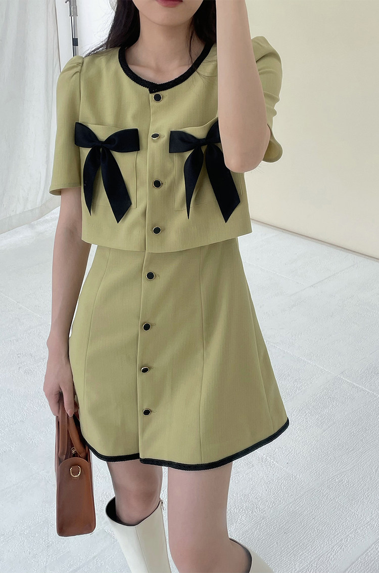 Комплект, милое изысканное платье с круглым воротником, мини-юбка с бантиком, в стиле Шанель, короткий рукав