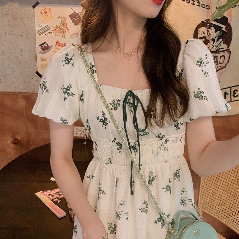 Летнее белое платье, длинная юбка, 2023, квадратный вырез, в цветочек, французский стиль