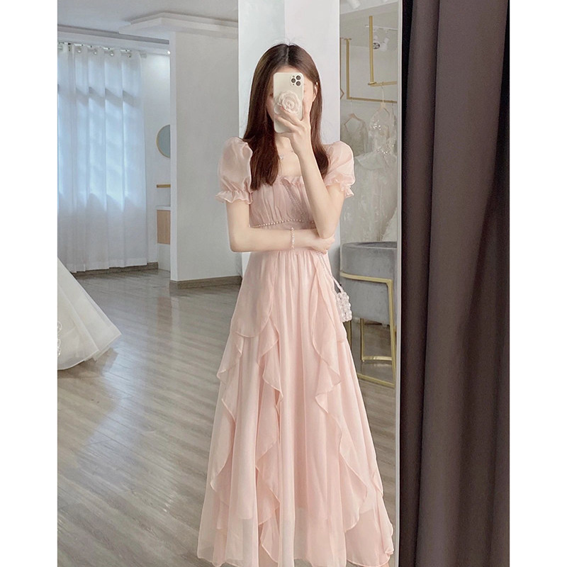 Длинная юбка, розовое летнее платье, 2022, французский стиль, изысканный стиль, яркий броский стиль, по фигуре, подходит для подростков