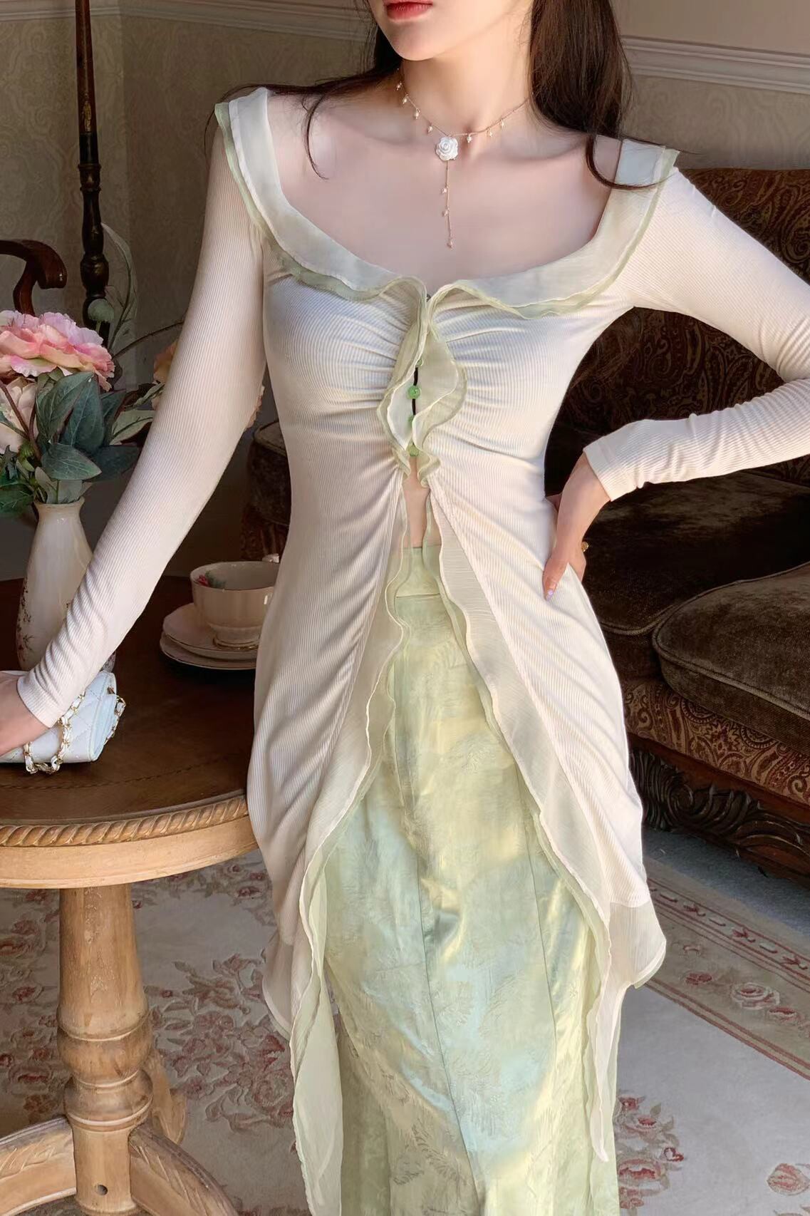Ретро мятная юбка, дизайнерский комплект, китайский стиль, тренд сезона